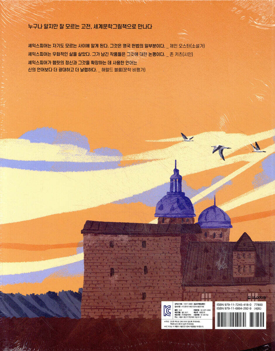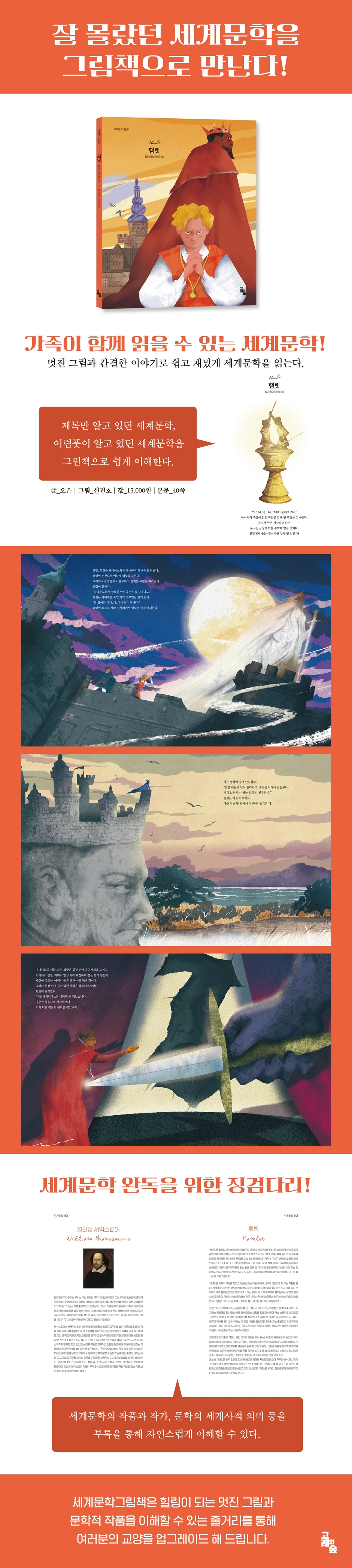 이제 아름다운 그림책으로 만난다! "고전이란 모든 사람이 칭찬하지만, 아무도 읽지 않는 책이다" 마크 트웨인의 고전에 대한 정의는 여전히 많은 사람들의 공감을 자아낸다. 세계문학그림책은 고전 작품을 대하는 사람들의 부담감을 덜어주기 위해 기획된 책이다. 시대마다 새롭게 발굴되는 풍성한 고전 리스트를 선별해 작품의 본질을 잃지 않으면서 시대 감각에 맞는 간결한 구성과 아름다운 그림으로 완성했다. “사느냐, 죽느냐, 이것이 문제로다!” 윌리엄 셰익스피어의 4대 비극 중의 최고작, 『햄릿』의 비극적 이야기를 그림책으로 만나보자! 셰익스피어의 희곡 『햄릿』은 덴마크 왕국을 배경으로 하여, 덴마크의 왕자 햄릿이 아버지의 죽음에 대한 진실을 마주하고, 그에 복수를 하는 과정에서 겪는 비극적 이야기다. 『햄릿』에는 복수, 권력, 인간성, 죽음, 그리고 존재의 의미가 담겨 있다. 이 작품은 셰익스피어의 가장 긴 희곡이며, 주인공 햄릿 왕자의 심리적 발전과 내면의 갈등을 중심으로 전개된다. 햄릿은 아버지의 죽음에 대한 복수를 계획하지만, 이 과정에서 복수의 도덕적 정당성과 그에 따른 비극적 결과를 고민한다. 햄릿의 유명한 독백 "To be, or not to be"는 존재의 의미와 삶의 가치에 대한 근본적인 질문을 하며, 인간의 삶이 갖는 의미와 고통, 죽음에 대해 생각해보게 한다. 인간의 배신 즉, 어머니의 배신, 사랑하는 이의 배신 등이 햄릿의 심리적 고통과 행동에 크게 영향을 주며, 그로 인한 파괴적인 결과로 이어진다. 『햄릿』은 이러한 다양한 주제를 통해 인간의 본성과 사회적 구조, 도덕적 가치에 대한 근본적인 질문을 던지며, 여러 해석과 깊은 사색을 가능하게 하는 작품이다. 그 복잡성과 다층적인 특성 때문에, 『햄릿』은 문학뿐만 아니라 철학, 심리학, 사회학 등 다양한 학문 분야에서도 중요하게 다뤄지는 셰익스피어의 대표적인 비극이다. 『햄릿』을 더욱 돋보이게 하는 네 가지 포인트 1. 작품의 줄거리를 알 수 있는 간결한 구성 2. 등장인물들의 감정과 갈등, 그리고 주제를 전달하는 장면들을 강렬한 색감으로 그린 눈과 마음을 사로잡는 그림책 3. 작가, 작품, 그 시대의 배경에 대한 이해를 돕는 풍성한 해설 4. 인간의 본성에 대해 생각해 볼 기회를 가질 수 있다. |