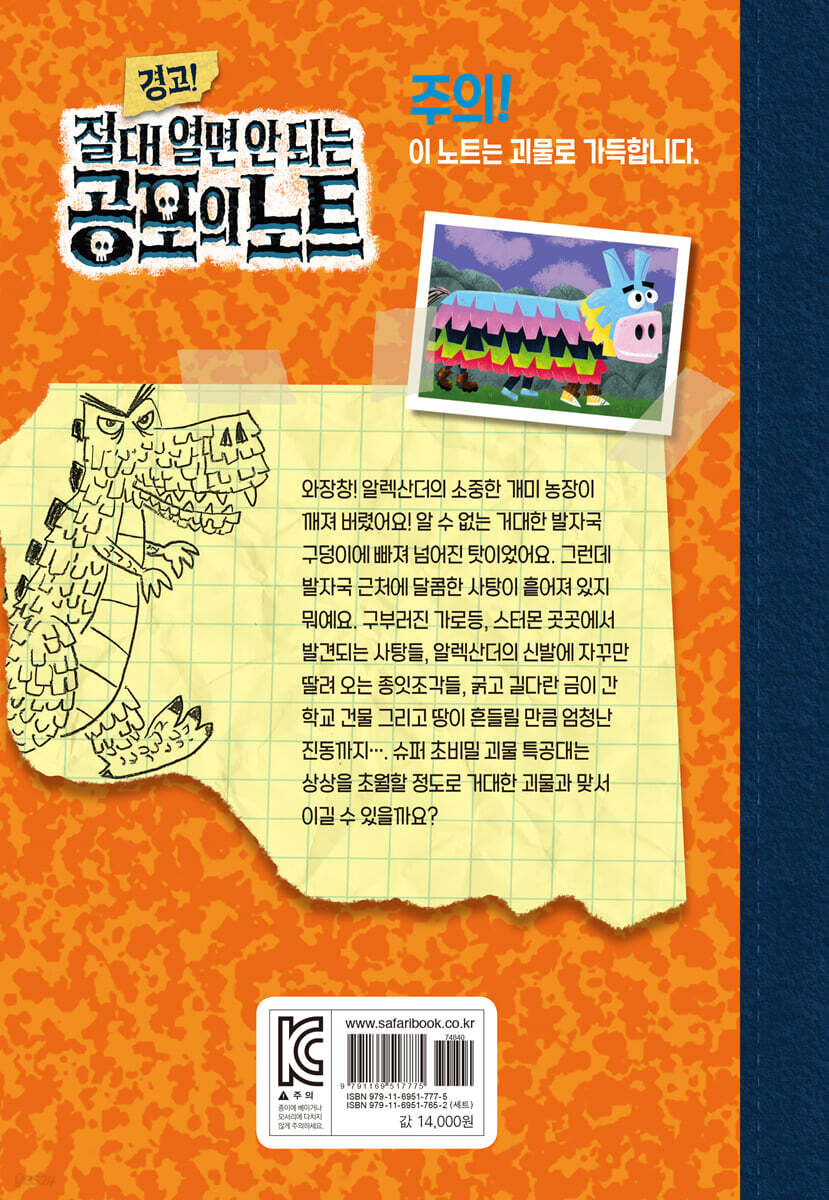 알렉산더가 우연히 발견한 〈공포의 노트〉에는 상상력 넘치는 온갖 무시무시한 괴물들로 가득하다. 각각의 괴물들을 그려 놓은 그림과 함께 서식지, 먹이, 특징 그리고 물리치는 방법 등이 적혀 있어 무서워하거나 당황하지만 않는다면 거뜬히 괴물을 이겨 낼 수 있다. 이 시리즈는 공포의 노트에 있는 괴물들이 스터몬에 나타나 도시를 위험에 빠뜨리지만 아이들의 힘으로 물리치는 이야기여서 그야말로 통쾌하다. 어린이 독자들이 이 시리즈를 좋아할 뿐 아니라 자발적으로 계속 읽게 되는 이유 중 하나도 아이들 스스로의 힘으로 괴물을 물리치고 세상을 구하기 때문이다. 그리고 무서운 괴물 이야기지만, 어찌 보면 귀여울 수도 있고 물리칠 방법도 있다 보니 지나치게 공포스럽지 않아 저학년 아이들이 읽기에 자극적이거나 해롭지 않다. 무엇보다 이 시리즈는 책을 읽고 나서 스스로 독후 활동까지 한다는 점에서 더욱 만족감이 커진다. ‘나만의 공포의 노트’를 만들거나 친구들 혹은 가족과 괴물 퇴치 모임을 만들고 회원 카드를 만드는 모습도 목격하게 될 것이다. 독서 습관을 키워 주고 싶다면, 제대로 된 문장력과 문해력, 문제 해결력을 키워 주고 싶다면 만화보다 〈공포의 노트〉 시리즈를 권한다. 힘으로 안 될 땐 머리로! 알렉산더는 아빠의 응원을 받으며 과학 과제로 제출할 개미 농장에 정성을 쏟는다. 그러나 학교에서 열리는 “개미의 날’에 제출하려고 조심조심 학교로 들고 가다 의문의 거대한 구덩이에 쑥 빠지는 바람에 개미 농장이 엉망으로 망가지고 만다. 그런데 이상한 건 의문의 구덩이뿐만이 아니다. 길 여기저기에 사탕과 색종이 조각 들이 흩어져 있고, 단단한 가로등까지 형편없이 휘어져 있었기 때문이다. 슈.초.괴.특.은 그 구덩이가 아주 커다란 무언가의 발자국이라는 것을 깨닫는다. 그리고 새로운 괴물이 나타났다는 것도! 학교에서 다시 발견한 커다란 발자국, 굵게 금이 간 학교 건물, 뻥 뚫려 있는 롤러스케이트장 벽과 사탕 수백 개, 계속 신발에 들러붙는 수상한 종잇조각까지···. 모든 것은 〈괴물 노트〉에 적혀 있는 하나의 괴물을 가리키고 있었다. 과연 어떤 괴물일까? 〈경고! 절대 열면 안 되는 공포의 노트〉 시리즈의 다섯 번째 이야기 《피냐타사우루스와 개미 마을》에서는 새로운 괴물 피냐타사우루스가 등장한다. 이 괴물은 멀리서도 딱 보일 만큼 거대하고, 힘도 세어서 도저히 이길 방법이 없어 보인다. 그래서 알렉산더와 친구들로 구성된 슈.초.괴.특.은 거대한 괴물에 정면으로 맞서기 보다는 꾀를 내어 보기로 한다. 그리고 〈괴물 노트〉에 적힌 짧은 정보를 이용해 피냐타사우루스에게 가까이 가는 데 성공한다. 세 친구는 어마어마한 괴물의 모습에 겁이 났지만, 피하지 않고 어떻게 하면 괴물을 이길 수 있을지 함께 머리를 맞대고 진지하게 고민하여 방법을 찾아낸 것이다. 우리는 때로 버거운 상대나 도전조차 불가능해 보이는 상황과 맞닥뜨릴 때가 있다. 이런 경우, 대개 겁을 먹고 아예 자포자기하는 경우가 많다. 그러나 슈.초.괴.특.은 적의 어마어마한 덩치나 힘 앞에서도 결코 물러서거나 포기하지 않는다. 독자들이 슈.초.괴.특. 대원들을 응원하게 되는 건 그 때문이다. 다소 무모해 보이지만 최선을 다한 끝에 결국은 문제를 해결해 내고 마는 통쾌한 결과와 마주할 때면 대리 만족을 느끼게 된다. 이 이야기에 등장하는 덩치 크고 힘이 센 피냐타사우루스는 아이들이 성장해 가는 동안 만날 수 있는 여러 어려움 가운데 하나일 수 있다. 작가는 그 어려움에 정면으로 맞서기보다는 지혜로움으로 대응하라는 메시지를 전달한다. 그리고 아무리 큰 상대라 해도 물러서거나 포기하지 않는 것이 중요하다고. 어떤 일이든 방법이 있게 마련이다. 더욱이 함께 머리를 맞대고 생각하면 더 나은 방법을 찾을 수 있다. 나 혼자 해결하기 힘들 땐 서로 머리를 맞대어 해결해 나가는 협동과 진심 어린 마음의 소중함도 알게 된다. 세상의 모든 것에는 약점이 있다! 《피냐타사우루스와 개미 마을》에서는 슈.초.괴.특. 대원들이 지금까지 맞서 싸웠던 괴물들은 코웃음이 날 만큼 어마어마하게 크고 위협적인 괴물을 만나게 된다. 이 괴물은 거대한 발로 쿵쾅쿵쾅 다니며 마주치는 것은 무엇이든 닥치는 대로 부순다. 주먹 한 방이면 건물에 금이 가고, 단단한 가로등이 엿가락처럼 휘어져 버린다. 세 친구는 머리를 맞대고 작전을 짠 끝에 피냐타사우루스를 가까스로 물리치는 데 성공한다. 하지만 놀랍게도 부서진 피냐타사우루스 안에 숨어 있던 더 단단하고 막강한 또 다른 괴물이 나타나 더욱 포악하게 난동을 부린다. 괴물은 순식간에 립과 니키를 옴짝달싹 못하게 만들어 버린 뒤 알렉산더를 공격한다. 알렉산더는 괴물에게 쫓기다 잡혀 버릴 절체절명 위기에 놓인 순간, 꾀를 내 의외의 방법으로 물리친다. 강한 것에는 더 강한 것으로 맞서야 할 때도 있지만, 때로는 의외의 아주 작은 것으로 맞서 이길 때도 있다. 이 이야기는 큰 둑도 개미구멍으로 무너지듯, 대항할 만한 적이 없어 보이는 괴물도 의외의 작은 것으로 물리칠 수 있음을 알려 준다. 세상의 