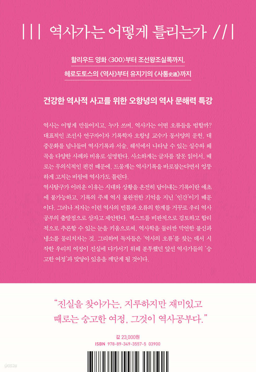 그럼에도 역사는 어떻게 믿을 만해지는가? 할리우드 영화 [300]부터 조선왕조실록, 헤로도토스의 『역사』부터 유지기의 『사통(史通)』까지 건강한 역사적 사고를 위한 오항녕 교수의 역사 문해력 특강 역사가도 틀린다 사소하게는 글자를 잘못 읽어서, 때로는 무의식적인 편견 때문에, 드물게는 역사기록을 바로잡는다면서 엉뚱하게 고치는 바람에 역사가도 틀린다. 역사는 어떻게 만들어지고, 누가 쓰며, 역사가는 어떤 오류들을 범할까? 『역사의 오류를 읽는 방법』은 한국의 대표적인 조선사 연구자 오항녕 교수가 동서고금의 역사가들이 실수했던 사례를 유쾌하게 해설한 역사 교양서이다. 역사기록, 서술, 해석의 각 과정에서 나타나는 오류와 실수들을 역사학의 주요 개념들과 함께 테마별로 엮었다. 오랫동안 강단과 저술 활동을 통해 연구하고, 논쟁하고, 가르치면서 모은 흥미로운 사례들이다. 저자가 참고하고 인용하는 문헌들도 폭넓다. 동서양 역사학을 대표하는 두 거목인 헤로도토스와 사마천의 저술(『역사』, 『사기』)이 빠질 수 없고, 인류 최초의 역사학개론서인 『사통(史通)』부터 우리 기록문화를 대표하는 [조선왕조실록]까지 중요한 역사 문헌들이 비중 있게 실렸다. 영화 [300], 뮤지컬 [레미제라블] 등 대중문화, 스포츠를 통한 적절한 비유와, 강의시간에 학생들에게 내준 시험문제와 본인의 일기까지 인용하면서 교양 독자의 눈높이에 맞춰 해설한다. 특히 한국 역사학의 논쟁적 이슈를 역사 오류의 사례로 적극적으로 끌어와 비평하는데, 『선조실록』과 『선조수정실록』의 사료 문제, 광해군과 사도세자에 대한 인물평, 실학/허학 논쟁, 율곡 이이의 ‘십만양병설’을 둘러싼 논란 등 한국사의 중요한 쟁점들이 두루 담겼다. 역사에 대해 막연히 어렵고 부담을 느끼는 일반인들이라면 역사 읽기의 깊은 맛을 느끼고, 역사를 업으로 삼으려는 역사학도라면 사료를 읽고, 해석하고, 비평할 때 경계해야 할 유용한 팁을 얻을 수 있을 것이다. 역사의 오류를 읽는 방법 책의 제목은 좀 특이하다. ‘역사를 읽는 법’이 아니라 ‘역사의 오류를 읽는 법’이라니, ‘역사도 잘 모르는데… 그 오류까지 시시콜콜 알 필요가 있을까’ 하고 시큰둥해할 독자들도 있을 것이다. 저자는 역사학을 다른 모든 학문을 건강하게 유지해주는 ‘음식’에 비유한다. 영양이 풍부하고 건강한 음식을 먹는다면 우리의 몸(지적 토대)도 튼튼해지겠지만, 영양분이 부실하고 상한 음식을 먹으면 다른 모든 학문도 위태로워진다. 역사학은 “(과학사, 철학사, 심지어 역사학사 등) 모든 학문의 형식이자 학문의 성격 그 자체”이기 때문이다. ‘역사의 오류’를 줄이고, 예방하는 것은 우리 학문의 근간을 지키는 일과 진배없다. 또한 어떤 분야든 실패 사례가 성공의 비밀을 알려주는 길잡이가 되며, 역사가의 실수담만큼 역사공부에 더 요긴한 교재도 찾기 힘들다. ‘역사의 오류’라는 주제는 역사를 더 쉽게 설명하기 위해 저자가 고민하면서 채택한 방법론이기도 하다. 이 책에는 다양한 역사 오류 사례가 제시된다. 공자의 경우, 그의 어린 시절을 기록한 『예기』를 후대 학자들이 표점(구두점)을 엉뚱한 데 찍어서 읽는 바람에 공자는 오랫동안 아버지 무덤도 모르는 사람으로 알려졌고, 중국의 5천 년 문명은 동양에 편견을 품은 영국인이 찍은 사진(왕웨이친 처형 사진) 한 장 때문에 야만의 대명사로 전락했다. 어떤 고등학교 한국사 교과서에는 연암 박지원의 『열하일기』 한 토막을 제시하며 박지원 자신의 중화 관념과 정반대되는 내용으로 소제목을 삼기도 했다. 물론 이런 오류는 이 책의 저자도 예외일 수 없는데, 그 역시 『자치통감』 연구자인 원나라 호삼성의 말을 잘못 해석하는 바람에 낭패를 봤다고 솔직하게 고백한다. 이처럼 역사학자의 논문이나 저술도, 중고등학교의 교과서도, 조선시대 왕릉의 안내문도, 심지어 동아시아에서 존경받는 유학의 대가들도 틀릴 수 있다. 역사를 기록하고, 전달하고, 해석하는 주체가 사람이기 때문이다. 대표적인 오류의 사례들 이 책은 총 3부로 구성된다. 1부 ‘사실의 오류’에서는, 기록을 남기며 발생하는 오류, 어떤 선입견이나 편견을 가지고 사실에 접근하면서 생기는 오류를 다룬다. 특히 문자, 언어의 무지나 착각에서 생기는 오류를 설명한다. 2부 ‘서술의 오류’에서는, 사실을 적고 전달하고 이야기하는 과정에서 발생하는 오류를 다룬다. 가령 우리가 일상에서 별 고민 없이 던지는 ‘이순신 장군이 없었으면 조선은 망했을까?’와 같은 가상의 질문들도 여기서 검토한다. 왜 이런 질문을 역사학에 함부로 끌어들이면 안 되는지를 설명한다. 3부 ‘비판의 오류’에서는 역사를 둘러싼 논쟁에서 발견될 수 있는 오류를 다룬다. ‘네 말은 믿을 수 없어!’ 하는 식으로 논제와 사람을 혼동하는 오류, 자신의 오류를 감추려고 편싸움을 유도하는 오류 등이다. 재밌는 사례로 역사학자들의 흔한 과장법을 주의하라는 지적이 있는데, “역사학자들도 설득력을 높이려다 보면, ‘때때로’ 대신 ‘항상’, ‘가끔’ 대신 ‘때때로’, ‘드물게’ 대신 ‘가끔