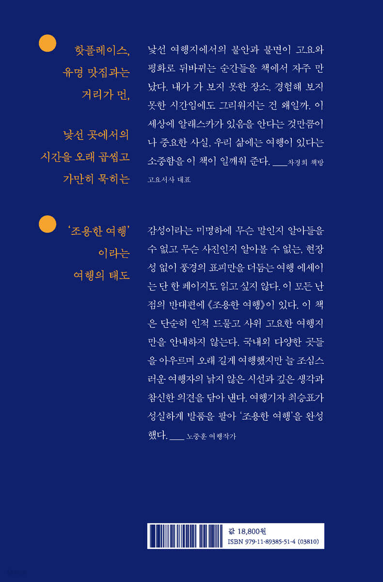 감성이라는 미명하에 무슨 말인지 알아들을 수 없고 무슨 사진인지 알아볼 수 없는, 현장성 없이 풍경의 표피만을 더듬는 여행 에세이는 단 한 페이지도 읽고 싶지 않다. 이 모든 난점의 반대편에 『조용한 여행』이 있다. 이 책은 단순히 인적 드물고 사위 고요한 여행지만을 안내하지 않는다. 국내외 다양한 곳들을 아우르며 오래 길게 여행했지만 늘 조심스러운 여행자의 낡지 않은 시선과 깊은 생각과 참신한 의견을 담아 낸다. 여행기자 최승표가 성실하게 발품을 팔아 ‘조용한 여행’을 완성했다. - 노중훈 (여행작가)