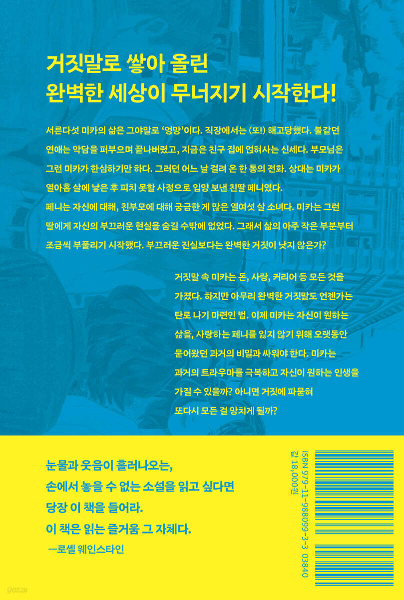 유일한 방법이라고 생각했어.” 거짓말로 쌓아 올린 완벽한 세상이 무너지기 시작한다! “저는 페니라고 하는데요. 페넬로페 켈빈이요. 제가 그쪽 딸인 것 같아요.” _24쪽 중에서 수화기 너머로 들려오는 목소리는 낯설지만 익숙했다. 16년 전 미카가 낳아 입양 보낸 딸, 페니였다. 미카는 몇 번째일지 모르는 해고 통지를 받고 친구에게 자신의 막막한 현실에 대한 한탄을 늘어놓던 중 걸려 온 갑작스러운 딸의 전화에 당혹스러웠다. 하지만 동시에 본능적으로 자신을 딸에게 부끄럽지 않은, 완벽한 모습으로 꾸며냈다. 거짓말 속 미카는 돈 많고 자상한 남자친구와 교제하며 갤러리 오픈을 준비하는 유망한 예술가로 SNS에 자랑할 정도로 멋진 집에서 살고 있다. 가벼운 마음으로 시작한 이 거짓말은 페니가 미카를 만나러 오겠다고 선언하면서 심각해지기 시작한다. 이제 미카는 이 모든 거짓말을 현실로 만들어야 했다. 친구들과 함께 쓰레기장과 다름없는 집을 말끔히 청소하고, 헤어진 전 남자친구를 찾아가 수치심을 무릅쓰고 임시 애인 역할을 부탁한다. 그리고 페니를 만나는 날, 미카는 자신의 딸 앞에 당당히 설 수 있었다. “너무 혼란스러워요. … 거짓말을 하신 거예요? 왜 그런 거짓말을 하셨어요?”_240쪽 중에서 하지만 완벽했던 거짓말은 미카의 엄마로 인해 처참하게 무너지고 만다. 이제 미카는 인생의 실패자에서 딸에게 거짓말까지 한 최악의 엄마가 되고 말았다. 미카는 결단을 내려야 했다. 페니에게 모든 걸 솔직하게 털어놓고 용서를 구하기 위해 가슴 깊이 묻어둔 과거의 트라우마와 정면으로 맞설 결심. 그리고 잃어버린 자신을 찾을 결심. 과거는 정해져 있지만, 미래는 흘러간다 망가진 소녀의 탈주기 “엄마가 원했던 딸이 아니라 죄송해요.” _510쪽 중에서 미카는 언제부터 가라앉았을까? 그녀는 자신이 페니에게 거짓말을 하기 훨씬 이전부터 흘러가는 대로 아무 의미 없이 시간을 보냈다는 사실을 깨달았다. 미카는 꿈이 있었다. 그림을 그리고 싶었고, 여행하고 싶었고, 사랑하고 싶었다. 하지만 미카는 어린 시절부터 엄마의 손바닥 위에서 노는 작은 인형이나 다름없었다. 경제적인 이유로 일본에서 미국으로 이민을 갔지만, 엄마는 일본인이라는 정체성을 포기하지 못했다. 그런 자신의 욕망을 미카도 똑같이 품어야 한다고 믿었다. 그리고 미카에게 일어난 사건을 철저히 외면했다. 미카는 강간을 당했고, 페니를 가졌다. 자신의 꿈을 향해 달려가던 생기 넘치던 미카. 사랑을 찾아 반짝이던 소녀는 한순간에 피해자가 되어 버렸고, 좌절했다. 하지만 페니가 자신보다 더 나은 부모에게서 사랑받으며 자라길 원했다. 영혼의 일부가 찢겨 나가는 고통이었지만, 자신과는 다른 삶을 살길 바라는 마음으로 입양 보냈다. 고통스러운 시간 속에서 미카가 절실하게 엄마를 필요로 했을 때, 엄마는 그런 그녀의 마음을, 미카의 아이 페니를 ‘그것’이라고 칭하며 철저하게 외면했다. 마치 미카에게 그 사건이 일어나지 않았던 것처럼. 미카에게 엄마라는 존재는 창조자이자 파괴자였다. 그렇게 망가진 미카는 이제 페니와의 관계를 회복하기 위해 자신과 엄마의 관계를 바로잡으려 한다. 엄마에게 진실을, 그리고 자신의 진심을 말하는 일. 과거는 정해져 있지만, 미래는 흘러간다. 미카는 새로운 시작을 위해, 사랑하는 페니를 위해 과거에서 탈출해 자신이 진짜 원하던 삶을 되찾으려 한다. 사랑, 신뢰, 용서, 과거를 받아들이는 과정과 삶의 본질에 대하여. 이는 모성애와 부모 됨을 비롯해 이 책이 유수의 해외 언론과 독자들에게 ‘최고의 책’이라는 찬사를 받은 또 다른 이유다. 다양한 관계와 감정, 정체성에 대한 고찰과 통통 튀는 묘사와 말의 재미를 살린 대사가 균형을 이룬 이 책은 우리를 속절없이 매료시킨다. 망가진 과거에서 벗어나 진정한 ‘나’를 찾는 그녀의 여정을 응원하고 공감하며 이 책이 자신만의 답을 찾는 데 도움이 되길 바란다. 미카의 거짓말, 후회, 사랑을 통한 삶의 본질과 진정한 모성 엄마는 이제야 알겠어. 전에는 몰랐거든. 부모가 된다는 건 결국 아이를 사랑하고, 보내주는 거라는 걸 말이야. _551쪽 중에서 미카는 페니를 낳은 후 입양 보냈다. 페니를 원하지 않은 건 아니었다. 자신보다 더 나은 가족과 함께 성장하기를 원했다. 미카는 페니를 사랑했지만, 자신이 페니에게 충분하지 않은 사람이라는 사실이 부끄러웠다. 예상치 못한 출산으로 아이를 키울 준비가 되지 않았다. 아이에게 생물학적 친부에 대한 이야기를 해줄 수 없었다. 아이가 자신의 존재 자체를 부정하게 될까 봐. 그래서 시간이 흘러 친엄마를 찾아온 딸에게 거짓말을 했다. 페니는 태어나자마자 백인 양부모에게 입양됐다. 동?서양 혼혈인 탓에 자신의 뿌리에 대한 의문을 품고 살았고, 그 해답을 얻으려 친엄마를 찾았다. 하지만 미카의 거짓말에 크나큰 상처를 입었다. 그건 마치 자신이 어디에도 속하지 못하는 사람이라는 선고와도 같았으니까. 무엇이 아이의 상처를 덜어주는 방법이었을까? 사랑만 주고 싶은 내 아이에게 상처를 주지 않는 방법이란 과연 존재하는 것일까. 미카가 엄마에게 