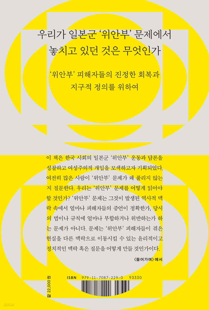 ― ‘위안부’ 공론화의 시작점은 1991년이 아니라 1946년 도쿄전범재판이었다 ― 일본 정부만이 아니라 연합군도 ‘위안부’ 문제에 책임이 있다 『‘위안부’, 더 많은 논쟁을 할 책임』을 기획하고 엮은 여성학자 김은실은 탈식민 페미니즘이라는 문제의식을 갖고 오랫동안 한국 사회의 여성 문제를 조명해왔다. 그는 이 책의 서문인 〈전시 성폭력을 다시 질문하다〉에서 생존자들이 자신들의 피해 경험을 끊임없이 증언하고 사과와 배상을 요구하는 당사자 운동이 언제까지 가능할지 물음으로써 책의 문제의식을 선명하게 드러낸다. 한국의 ‘위안부’ 운동은 한국인 ‘위안부’를 강제된 피해자로, 일본인 ‘위안부’를 자발적 참여자로 구별함에 따라 시간이 지날수록 곤경에 처하고 있다. 한국인 ‘위안부’가 전형적인 피해자상에서 벗어나 보일 때마다 강제된 것이 아니라 자발적으로 선택한 것이라는 공격을 피할 수 없기 때문이다. ‘위안부’ 운동이 억압받은 민족의 여성이라는 틀 안에서 움직이는 한, ‘위안부’ 문제를 보편적 여성 인권의 문제로 바라볼 여지도 줄어든다. 여기서 김은실은 ‘위안부’ 문제가 제2차 세계대전이 끝나고 난 뒤 연합국이 일본의 전쟁범죄를 명확하게 밝히지 못한 데서 비롯했다고 본다. 일본 제국이 저지른 전쟁범죄를 심판하기 위해 1946년에 열린 극동국제군사재판(도쿄전범재판)에서 ‘위안부’ 문제는 전쟁범죄 항목에 포함되지 못했다. 국제형사재판소의 조사관들은 ‘위안부’ 문제를 인지하고 있었고 관련 자료를 수집해놓았다. 여성주의적 시각이 부족한 시대였다고 하더라도, ‘비인도적 행위’라는 관점에서 들여다보면 여성을 군수물자이자 성 노예로 동원한 전쟁범죄임이 명확하게 드러날 터였다. 잘못 끼워진 단추는 1991년 유고슬라비아 전쟁에서 벌어진 집단 성폭력에 대해 페미니스트들이 연대하면서 조금씩 바꿔 달 수 있었다. 페미니스트들은 전범재판에서 집단 성폭력이 전쟁범죄에 포함되어야 한다는 데 원칙적으로 동의했고, 성폭력을 국제형사법의 문제로 등록시킬 수 있었다. 그렇지만 여성에 대한 폭력을 예방하는 문제는 국제사회에서 통용되는 민족이라는 장벽에 부딪혀 더 나아가지 못했다. 여성에 대한 폭력이 갖는 다층적인 함의가 납작해졌고 집단 성폭력은 민족 간 갈등이라는 틀에서만 법적 대상이 되었기 때문이다. 김은실은 ‘위안부’ 문제 공론화의 시작점을 1991년(김학순의 공개 증언)보다 이른 1946년(도쿄전범재판)으로 돌림으로써 ‘위안부’에 대한 민족적/국가적 관점에서 벗어날 것을 요청한다. ‘위안부’를 제국주의 전쟁과 여성의 문제로 조명해야 문제의 본질을 명확하게 인식하고 국제 연대를 만들어갈 수 있다는 엮은이의 주장은 ‘위안부’ 문제의 돌파구를 찾고자 하는 이들에게 유용한 길잡이가 되어준다. “그동안 한국에서는 ‘위안부’ 문제를 전장에 필요한 물자로서의 여성 동원이라는 차원보다 제국에 의한 식민지 여성의 강제 동원이라는 측면이 더 크게 다뤄져왔다. 비록 한국에서의 ‘위안부’ 논의가 두 측면을 어느 정도 포괄하고 있기는 하지만, 식민주의 청산이라는 인식 틀이 더 강하게 운동을 추동하는 것으로 보인다. 이제는 오랫동안 일본 정부와 싸워왔던 ‘위안부’ 운동이 일본 정부만이 아니라 ‘위안부’ 문제를 일본군의 전쟁범죄에서 제외시킨 연합군의 잘못 또한 피해자들의 회복을 위한 싸움의 의제로 제기해야 하는 것이 아닌가 생각한다.” - 〈서문_전시 성폭력을 다시 질문하다〉, 37쪽 2. 일본군 ‘위안부’ 운동에 대한 성찰 ― 식민 지배에 상처 입은 지식인 활동가들의 투쟁은 아니었던가 ― 성/폭력을 ‘사실적으로’ 재현하겠다는 욕망은 어디서 비롯하는가 ― ‘소녀상’에 대한 윤리적 소비로 운동을 대신할 수 있는가 ― 누가 왜 공창과 ‘위안부’를 비교하는가 ― 1975년 최초의 ‘위안부’ 증언자 배봉기는 어째서 잊혔는가 이 책은 크게 1부와 2부로 나뉜다. 〈1부. 일본군 ‘위안부’ 운동에 대한 성찰〉은 지난 30년 동안 한국의 ‘위안부’ 운동이 무엇을 해왔고 어떤 한계가 있었는지를 운동 내부의 긴장과 활동가의 고민, 영화에서 성/폭력 재현의 문제, ‘소녀상’을 둘러싼 해석, ‘위안부’ 운동에서 배제된 공창제(公娼制) 문제, 민족의 시선에서 벗어난 ‘위안부’라는 주제로 살펴본다. 1부를 여는 〈1. 야마시타와 영애 사이에서: 틈새의 시점에서 본 일본군 ‘위안부’ 운동〉을 쓴 야마시타 영애는 ‘위안부’ 운동에서 한일 간 가교 역할을 했던 경험을 찬찬히 풀어낸다. 자이니치(在日) 2세로서 정체성을 고민하던 야마시타 영애는 한국에서 여성학을 공부하고 ‘위안부’ 운동에 초창기부터 함께하면서 여성 문제에 대한 시야를 넓혀갔다. 하지만 한국의 ‘위안부’ 운동이 식민 지배에 대한 상처를 회복한다는 입장을 견지하면서 여성 인권을 위한 국제 연대가 차츰 무너져간 것이 아닐까 돌아본다. 이어서 권은선은 〈2. ‘용납할 수 없는 것’을 이미지화한다는 것의 의미: 영화 〈귀향〉의 성/폭력 재현을 중심으로〉에서 2016년 개봉 후 350만 관객을 동원