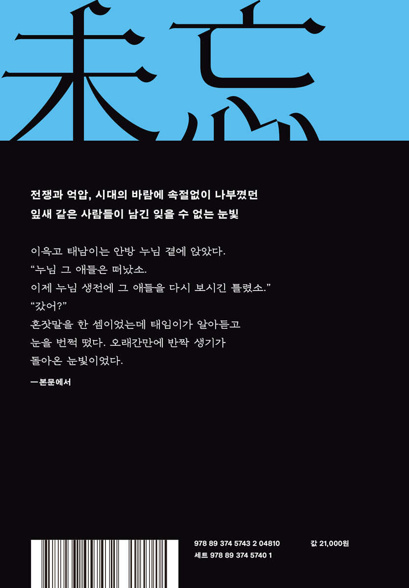 박완서가 채집하고 체화한 한반도의 이야기 『미망』은 박완서 작가의 소망이기도 했다. 초판 작가의 말에서 박완서는 이제는 가지 못하는 고향 개성에 대한 그리움을 드러내며 이렇게 쓴다. “내가 만들어 낸 인물들만이라도 그 그리운 산하를 거침없이 누비며 운명과 싸워 흥하고 망하고 울고 웃게 하고 싶다는 건 내 오랜 작가적 소망이자 내 나름의 귀향의 방법이었다.” 이를 증명하듯 소설에는 고향에 대한 작가의 커다란 애정을 보여 주는 개성 사람의 특질과 그 고장만의 상업과 사업가들의 방식, 특히 개성 지방의 물과 흙으로 키워 낸 인삼 농사에 대한 장면들이 눈앞에 그려지듯 생생하게 담겨 있다. 이렇듯 『미망』은 이제는 가지 못하는 고향을 되살리는 동시에 한 집안의 일대기를 통해 한반도의 역사를 보여 주는 소설이다. 소설에는 대한민국 이전의 조선, 그 이전의 고려 시절부터 맥을 이어 온 역사와 경제, 그리고 구시대의 가족과 그로부터 뻗어 나가 변해 가는 아들딸들의 시대에 대한 통찰이 담겨 있다. 역사의 큰 줄기를 관통해 가는 와중에 박완서 작가 특유의 여성주의적 관점에 더해 인물에 대한 냉철하고 가식 없는 평가, 욕망에 대한 가차 없는 판단이 빛을 발하는 부분들이 넘쳐난다. 말할 수 없는 고통 속에서 집필했음에도, 『미망』 속 박완서의 문장에는 결연하고 전진하는 듯한 힘이 서려 있다. 시대의 바람에 속절없이 나부꼈던 잎새 같은 사람들이 남긴 잊을 수 없는 눈빛 『미망』의 주요 등장인물은 신분제가 들썩이던 시절 비범한 상업 감각으로 인삼 농사와 장사를 통해 집안의 부를 축적한 전처만 영감과, 그가 유난히 애틋하게 아끼는 손녀 태임, 그리고 태임의 남편이 되는 쇠락한 양반 가문 출신 종상, 태임의 어머니가 친정의 하인과 간음하여 낳은 태임의 이부 동생 태남, 이후 시간이 흘러 태임과 종상이 결혼하여 낳은 딸 여란으로, 이외에도 이 가문을 중심으로 4대에 걸친 인물들이 혼란한 역사 속에서 각자의 신념과 욕망을 찾아 헤매며, 그 와중에 서로 반목하고 연민하거나 경쟁하고 동지가 된다. 소설의 제목 ‘미망(未忘)’의 뜻은 ‘잊으려 해도 잊을 수 없음’이다. 그리고 소설 속에는 종종 제목의 동음이의어인 ‘미망(迷妄)’, 즉 ‘갈피를 잡지 못하고 헤매는 상태’가 쓰이는 것을 볼 수 있다. 인물마다 일제강점기와 한국전쟁 등의 시기에 닥쳐오는 혼란과 변화를 구시대(조선)보다 자유롭게 느끼며 폭발하는 개인적 욕망을 마주하면서도, 나라의 흥망 앞에 할 수 있는 일과 해야 하는 일 같은 ‘떳떳한 것’에 대해 거듭 고민한다는 점에서 그 단어는 운명 앞에서 헤매는 인물들의 마음을 절실하게 나타낸다. 작가가 끝까지 밀고 나간 이 세밀하면서도 우직한 소설을 그때보다 먼 훗날의, 지금의 독자들이 함께 체험하기를 권한다. |