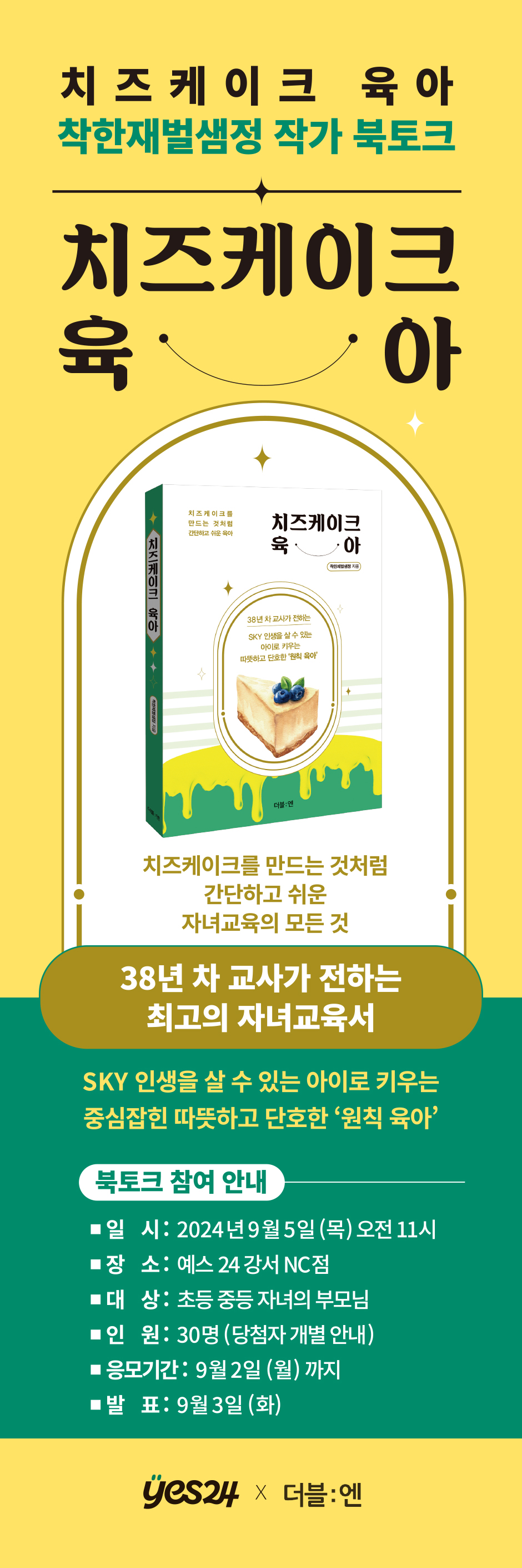 “선생님이 우리 엄마의 선생님이었다면서요? 진짜 신기해요.” 모자의 담임, 모녀의 담임을 하는 경우가 종종 있어요. 아이들과 소통하지 못해 힘들어하기도 하고, 가출한 아이의 부모로 만나기도 하고, 가끔은 일명 ‘진상 학부모’의 모습으로 마주하기도 합니다. 그럴 때는 마음의 고단함이 수십 배입니다. 나는 80년대생 학부모들이 학생이었을 때도 교사였던 사람이기 때문입니다. 학부모가 되어 다시 만나게 된 20년 전, 30년 전 우리 반 학생들. 차마 웃으며 반길 수 없는 상황에서의 해후일 때의 슬픔은 더더욱 나를 힘들게 하지요. 이 책을 쓰게 된 이유 중 하나입니다. - 프롤로그 중에서 교사로서, 두 아이의 엄마로서 수많은 선택을 하면서 살아온 저자 착한재벌샘정은 말합니다. “엄마가 당당해야 아이도 당당하다!” “엄마가 변하고 성장하는 시간이 있어야 그 아이와 함께 갈 수 있다.”라고요. 육아서는 아이가 어릴 때만 읽는 책이 아닙니다. 초등학생이 되고 중학생이 되면 아이와 부모 사이는 계속 더 멀어집니다. 아이 마음을 알아주고 부모 또한 상처받지 않으며 함께 행복할 수 있는 ‘원칙 육아’가 필요해지는 것이지요. 그 방법을 《치즈케이크 육아》에 담았습니다. SKY 인생을 살 수 있는 아이로 키우는 중심 잡힌 따뜻하고 단호한 ‘원칙 육아’ 원칙을 지키는 것은 매우 중요합니다. 엄마도 아이도 S(Smile) K(Kindness) Y(Yourself) 인생을 살 수 있는 따뜻한 육아의 시간을 소개합니다. 어렵지 않아요. 바스크 치즈케이크를 만드는 것처럼요. - 따뜻한 기다림 치즈케이크를 만드는 첫 단계, 크림치즈 500g을 실온에서 천천히 녹이는 것처럼 육아에도 ‘기다림’이 필요합니다. 엄마의 조급한 마음을 내려놓고 아이의 속도대로 갈 수 있도록 기다려주어요. 부모에게만 기다림이 필요한 게 아니라 아이에게도 자신이 하고 싶은 것을 스스로 준비하는 과정, 기다리는 시간의 경험이 중요합니다. 아이의 꿈이 내 꿈이 되지 않도록 ‘나’를 잘 보살피고, 아이와 함께 행복한 시간을 만들어갈 수 있습니다. - 달콤한 소통 크림치즈의 냉기가 사라지면 설탕 100g을 조금씩 넣으며 잘 섞어줍니다. 육아에도 달콤함이 필요해요. 달콤한 소통. “입 다물고 들어가서 공부 해!” “알아서 한다는 게 이거야?” 소통과는 거리가 먼 대화법입니다. 아이와 행복하게 대화할 언어는 없는 걸까요? 일관성과 원칙이 없는 육아는 아이들에게 ‘부모사용설명서’를 만들게 하고. 품격 없는 언어를 사용하면 그대로 아이에게 흡수됩니다. 밥도둑? 실물깡패? ‘도둑’과 ‘깡패’를 왜 좋은 단어에 붙여서 사용할까요? “언어가 곧 삶”입니다. 상대방을 위한 고운 말이 아니라 ‘나’를 위한 우아하고 품위 있는 말을 사용해야 합니다. - 유연한 믿음 크림치즈와 설탕이 잘 녹으면 이제 달걀 4개를 하나씩 잘 섞어줍니다. 달걀도 냉기가 없어야 반죽과 잘 섞입니다. 아이와의 시간도 비슷하죠? 부모와 아이의 온도 차가 크면 아이는 겉돌게 되니까요. 스마트폰 문제, 성적, 교우관계, 학교생활 등 부모가 잘 모르는 아이의 다양한 모습들. 필요한 것은 아이들 스스로 생각하는 능력이라 생각하기에, 책의 저자 착한재벌샘정은 수업시간에 책읽기와 글쓰기를 강조하고 많은 질문을 던지며 스스로 답을 찾아보게 합니다. 아이들에게는 자신의 꿈을 스스로 찾을 수 있는 기회가 절실합니다. 아이들에게 믿음을 가지고 기다려주어야 하는 이유이기도 해요. - 단호한 수용 이제 마지막으로 생크림 250ml를 넣어줍니다. 모든 재료가 잘 어우러지는 게 중요합니다. 내가 나를 대하는 태도, 타인에 대한 수용으로 확장되어가는 과정은 아이와 어른 모두에게 중요합니다. 아이가 모르는 사람에게 인사하기 싫다고 한다면? 내가 안 버렸는데 내가 왜 주워야 하냐고 한다면? 왜 싫었는지 이유를 물어봐주고 더불어 살아가는 삶의 가치를 알려주어야 합니다. 공주와 왕자만 있고 시종이 없는 동화에서 “우리 공주님은 다른 거 하나도 안 해도 돼요. 공부만 열심히 하면 돼요.” “우리 왕자님, 엄마가 다 알아서 할 테니 공부만 열심히 하면 돼요.” 라는 말을 듣고 자란 공주와 왕자가 만나면 어떻게 될까요? 십대들과 함께해온 38년의 시간 동안 저자가 깨달은 건 ‘사랑’이었다고 해요. “사랑이 모든 것을 변화시킨다”는 말, 따뜻한 사랑을 받으며 정서적으로 안정된 아이들이 행복한 삶을 살게 되면 그걸 지켜보는 엄마의 삶도 행복합니다. 기다리는 부모, 잘 자라는 아이 결혼하고 아이를 낳고 엄마로서 살아온 시간들은 나를 성장시키는 최고의 자기계발의 장이었습니다. 엄마로 사는 시간은 어떤 교사가 되어야 하는지 방향을 알게 해주었고 학생들과 함께 행복한 교사라 말하는 사람이 되었지요. 나의 학교를 만들고 싶다는 꿈을 꾸게 해주었고, 그 꿈 역시 《말랑말랑학교 인생 수업》을 통해 이룰 수 있었어요. 아이들과 함께 했던 육아의 시간도 나의 삶이었고, 솔직히 힘들었지만 행복했습니다. 이제 서로 독립한 우리는 각자의 자리에서 행복한 삶을 살아가고 있어요. 아이들만 부모로부터 독립한 것이 아니라 나 역시 아이들에게서 독립한 것