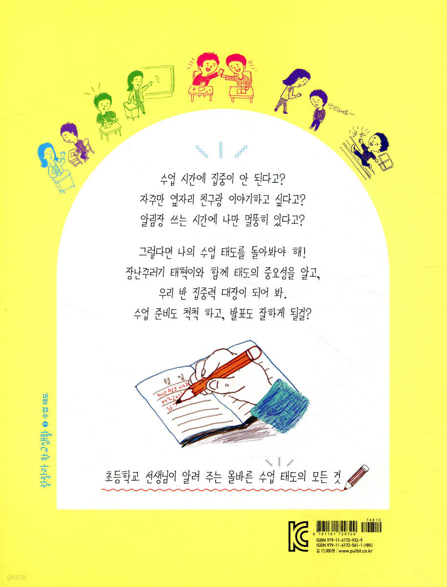 칭찬을 듣는 집중력 대장으로 거듭나다! 태혁이는 학교 가는 게 너무 즐거워요. 교실에서 친구들과 매일 놀 수 있으니까요! 그럼 태혁이의 학교생활은 아무 문제 없을까요? 글쎄요. 쉬는 시간에 노는 걸 좋아할 뿐이지, 수업 시간에는 영 집중하지 못하고 있어요. 앉아서 수업만 듣는 게 재미없고 지루하대요. 그래서 태혁이는 수업 시간에 연필을 깎고, 벌떡 일어나 교실 뒤를 돌아다니고, 지우개 가루로 장난을 쳐 선생님에게 주의를 받기 일쑤지요. 수업에 집중했다면 수업 시간이 지루하지도, 딴짓을 하지도, 선생님에게 혼나지도 않을 텐데 말이에요. 어느 날 태혁이는 지금처럼 수업 시간에 계속 딴짓을 하면 레드 월드에 가게 된다는 편지를 받아요. 레드 월드는 학교에서 자주 혼나는 아이들이 가는 곳이래요. 태혁이는 레드 월드에 안 가기 위해 온갖 방법을 알아봐요. 하지만 쉽지 않아요. 선생님에게 혼나지 않으려면 수업 시간에 집중해야 하는데, 태혁이는 그게 세상에서 가장 어렵거든요. 결국 태혁이는 담임 선생님에게 도움을 요청하고, 담임 선생님은 ‘올바른 수업 태도를 위한 다섯 가지 약속’을 지키면 레드 월드에 안 갈 수 있다고 하지요. 과연 태혁이는 약속을 잘 지켜 수업에 집중할 수 있을까요? 그리고 레드 월드에 안 가게 될까요? ‘올바른 수업 태도를 위한 다섯 가지 약속’부터 초등 교사가 알려 주는 ‘보호자를 위한 우리 아이 집중력 높이기’까지 ‘올바른 수업 태도를 위한 다섯 가지 약속’을 알려 줄게요. (1) 알림장 쓰기 (2) 가정 통신문 챙기기 (3) 숙제와 준비물 챙기기 (4) 수업 시간에 집중하고 열심히 참여하기 (5) 다른 친구들 방해하지 않기 어쩌면 ‘다섯 가지 약속과 수업 태도, 집중력이 무슨 상관이야?’라고 생각할 수도 있어요. 이건 크나큰 오해예요. 첫 번째와 두 번째, 알림장 쓰기와 가정 통신문 챙기기는 오늘 수업을 정리하고 내일 수업을 준비하는 행동이에요. 물론 요즘은 보호자 핸드폰으로 알림을 보내 주는 학교가 많지만, 의미 있는 행동임을 알아야 해요. 세 번째, 숙제와 준비물 챙기기는 학교생활의 가장 기본이에요. 만약 숙제를 하지 않고, 준비물을 챙기지 않는다면 아이는 수업 시간에 멀뚱멀뚱 있을 수밖에 없어요. 그러면 자연스레 집중력은 떨어져요. 저학년 아이의 경우 대부분 보호자가 숙제와 준비물을 대신 챙겨 줘요. 하지만 조금씩 스스로 할 수 있도록 도와줘 보세요. 네 번째, 수업 시간에 집중하고 열심히 참여하기는 선생님 말씀을 잘 들으며 호응하고, 발표하는 것을 말해요. 선생님의 말을 일방적으로 듣지 않고 소통을 하면 자연스레 집중력이 높아지니까요. 다섯 번째, 다른 친구들 방해하지 않기는 학교뿐 아니라 어디서든 꼭 필요한 태도예요. 내가 집중되지 않는다고 친구를 방해해서는 안 되겠죠? 《집중력 대장이 될 거야!》는 동화 사이사이에 ‘초롱초롱 수업 태도’ 활동 페이지를 준비했어요. 평소 수업 시간에 무슨 생각을 하는지 적기, 발표 경험 쓰기, 학교에서 지켜야 하는 약속 알아보기 등의 활동을 할 수 있지요. 책을 읽고 어린이 스스로 수업 태도를 깨닫고 집중력을 높이면 좋겠지만, 사실 그건 쉽지 않아요. 보호자의 도움이 꼭 필요하지요. 아이가 동화를 다 읽었다면, 이번에는 보호자가 동화 뒤에 마련된 ‘보호자를 위한 우리 아이 집중력 높이기’를 읽을 차례예요. 현직 초등학교 교사 이서윤 선생님의 철저한 자료 조사를 통해 아이의 문제점을 파악하고, 집중력을 높이는 방법 등을 공부해 보세요. ※ 초등 교과 연계 1학년 1학기 국어 〈글자를 만들어요〉 2학년 1학기 국어 〈겪은 일을 나타내요〉 1학년 1학기 바슬즐 학교 〈지금 여기 우리 이야기〉 1학년 1학기 바슬즐 학교 〈지금 여기 나의 이야기〉 저학년 아이들의 신나는 학교생활을 책임지는 〈랄랄라 학교생활〉 시리즈 〈랄랄라 학교생활〉 시리즈는 저학년 아이들이 ‘랄랄라’ 콧노래가 나올 만큼, 신나는 학교생활을 할 수 있도록 도와주는 책이에요. 재미있는 동화로 자신감을 높여 주고, 직접 생각하고 써 보는 다양한 활동 페이지로 학교생활을 잘 준비할 수 있게 하지요. 보호자를 위해 마련된 페이지는 보호자의 궁금증을 풀어 주는 것은 물론, 현직 교사의 실속 있는 정보도 제공한답니다. 〈랄랄라 학교생활〉을 통해 즐거운 학교생활을 보낼 수 있는 첫걸음을 내딛어 보세요. 자신감이 쑥쑥 자라, 몸도 마음도 건강한 학교생활을 해 나갈 수 있을 것입니다. |