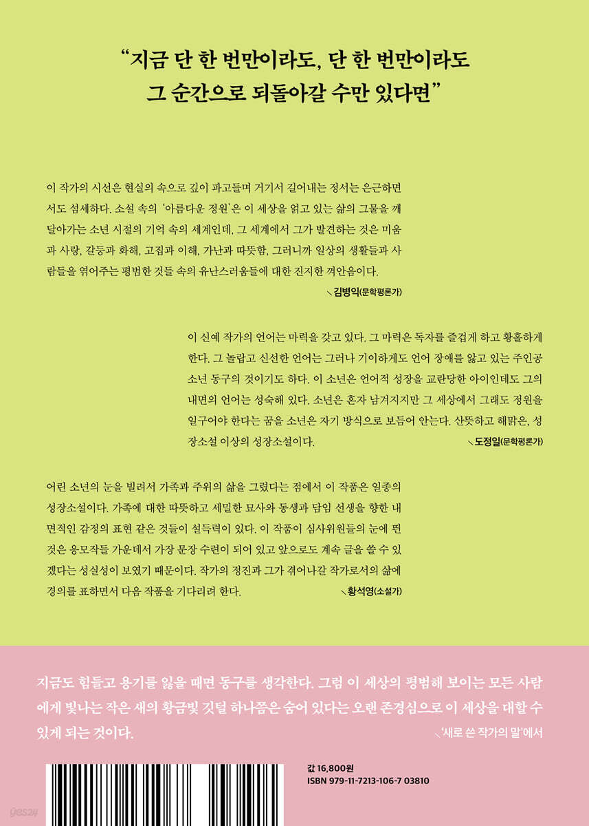 이 신예 작가의 언어는 마력을 갖고 있다. 그 마력은 독자를 즐겁게 하고 황홀하게 한다. 그 놀랍고 신선한 언어는 그러나 기이하게도 언어 장애를 앓고 있는 주인공 소년 동구의 것이기도 하다. 이 소년은 언어적 성장을 교란당한 아이인데도 그의 내면의 언어는 성숙해 있다. 소년은 혼자 남겨지지만 그 세상에서 그래도 정원을 일구어야 한다는 꿈을 소년은 자기 방식으로 보듬어 안는다. 산뜻하고 해맑은, 성장소설 이상의 성장소설이다. - 도정일 (문학평론가)