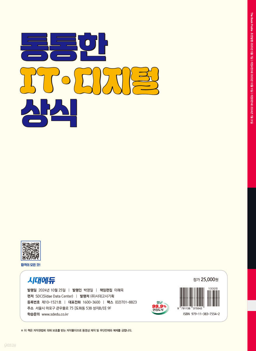 2. 영역별 적중예상문제 수록! 3. 디지털 + 일반상식으로 시험 완벽 대비! [특별혜택] 1. [합격시대] 온라인 모의고사 무료쿠폰 제공 2. 최신 이슈 & 상식 동영상 제공 |