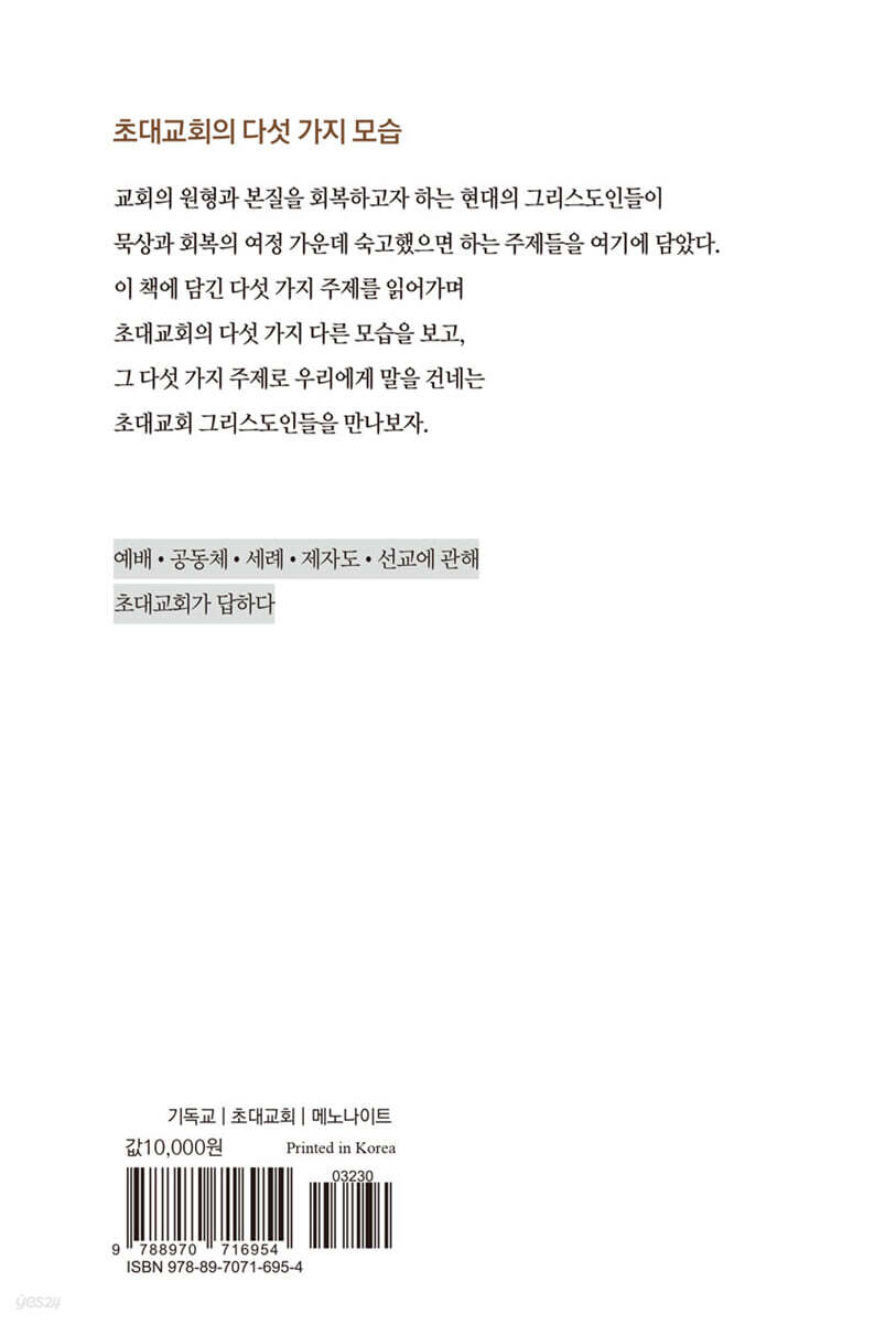 --- p.33 초대교회는 예배자 모두가 하나님을 아버지로 모시는 평등한 자녀임을 확인하고, 하나님의 자녀 공동체 안에는 계층과 배경에 따른 차별이 전혀 없음을 확인하는 거룩한 입맞춤을 나눈 후에 주일 예배의 절정인 성찬을 나누는 시간을 가졌습니다. --- p.37 그들은 예수그리스도의 복음을 믿는 데서 그치는 것이 아니라 자신들이 예수 그리스도의 복음이 되기를 바랬던 것입니다. --- p.45 공동체의 성장 목표는 공동체 구성원 모두가 그리스도의 형상을 이루는 것이었습니다. --- p.47 믿음을 갖고 지내다 보면 행동도 점차 바뀔 것이라는 식으로 믿음과 행위를 나누어 보지 않았고, 믿음을 갖고자 하면 믿음의 주체인 그리스도의 성품을 본받는 삶을 처음부터 살도록 훈련 받아야 한다고 생각했습니다. --- p.52 우리는 위대한 것들을 말하지 않고 살아냅니다. --- p.65 |