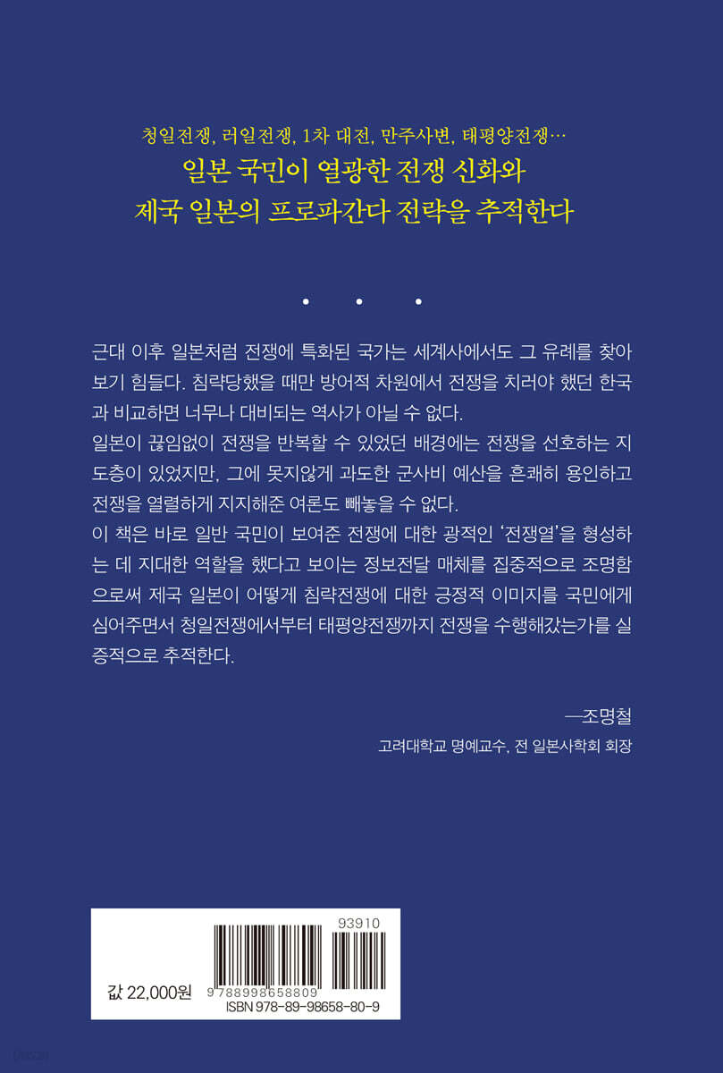 한국 독자 여러분께 시작하며 1장 전쟁과 선전 제국 일본의 공간 이미지 제국 일본의 붕괴 프로파간다(선전)의 주체 2장 청일전쟁 시기―판화 보도의 유행(1890년대) 1. 전쟁과 호흡을 같이한 제국 일본의 미디어, 연극 2. 석판화가 전하는 대청 제국의 ‘전승’ 보도 3. 유럽 매체가 전한 동아시아의 전쟁 풍경 3장 러일전쟁 시기―‘전쟁 신화’ 유포(1900년대) 1. 제국 일본에 침투한 사진, 그림엽서, 활동사진 2. 러시아 제국에서 유행한 민중 판화와 사진술 4장 제1차 세계대전 시기―일독전쟁을 둘러싼 보도 선택(1910년대) 1. 칭다오 전투를 둘러싼 보도 2. 남양군도의 일독전쟁 5장 중국, 미국의 반일운동―보도와 정치의 관계(1920년대) 1. 산둥 출병과 일본 화폐 배척을 둘러싼 중일 양국의 보도 2. 배일 이민법에 대한 미일 양국의 보도 6장 대만 우서 사건과 만주사변―친밀해진 신문사와 군의 관계(1930년대 전기) 1. 우서 사건을 둘러싼 보도와 정쟁 2. 만주사변 보도와 전황 사진 7장 중일전쟁 시기―국가 프로파간다의 절정기(1930년대 후기) 1. 국산 영화의 유행 2. 다수의 ‘만주와 몽골(만몽) 문제’ 8장 태평양전쟁―시각 보도의 쇠퇴(1940년대 전기) 1. ‘국가 총동원 체제’하의 언론 봉쇄 2. 국방을 위한 대만의 ‘내지화(內地化)’ 9장 패전 직후 ―점령 통치를 위한 프로파간다(1940년대 후기) 1. 다양한 ‘종전’ 모습 2. GHQ 점령하의 일본 3. 미군 점령하의 오키나와 후기 참고 문헌 이미지 출전 |