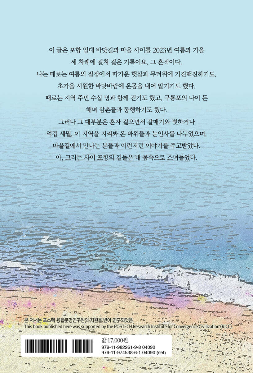 해파랑길 13코스 양포항~구룡포항 · 14 창바우 고기잡이 체험장과 법환 해녀체험장 / ‘장기일출’의 선바위를 길에서 만나다 / “우리 형수님이 제주 해녀라오.” / 통낙지 짬뽕으로 마음과 몸을 달래다 / “공짜로 얼마든지 걸으시우. 어두워질 때까지…” 호미반도 둘레길 4코스이자 해파랑길 14코스 구룡포항~호미곶 · 40 포구에 쓸쓸하게 버려진 자개장롱과 가죽 소파 / 잘 알려지지 않은 억울한 동쪽 땅끝, 석병3리 / 하이얀 고래 마을 다무포 / 제주 해녀보다 더 물질을 잘했다는 김덕순 할머니 호미반도 둘레길 3코스이자 해파랑길 15코스 호미곶~흥환해수욕장 · 60 오르막에는 밤나무가, 내리막에서는 소나무가 반겨주는 길 / 구룡포, 그 전설 너머 바다 쓰레기장을 보노라니 / 아름다운 돌들만 밟을 수 있다면 얼마나 좋으랴만 호미반도 둘레길 2코스이자 해파랑길 16코스 전반부 흥환해수욕장~연오랑세오녀테마파크 · 90 바위마다 전설이 딸려나오고… 호미반도 둘레길 1코스이자 해파랑길 16코스 중반부 연오랑세오녀 테마파크~청림운동장 · 104 해병대 상륙훈련장과 해병대 군인들 해파랑길 16코스 후반부 청림운동장~죽도시장 · 128 칼제비는 언제나 정답이고, 대게는 눈으로 먹었다 해파랑길 17코스 죽도시장~칠포해변 · 152 모래사장 맨발 걷기를 즐기는 사람들 서핑족과 캠핑족의 천국 용한리 해파랑길 18코스 칠포해변~화진해변 · 180 이가리 전망대 근처에서 인생 짜장면을 먹다 해파랑길 19코스 전반부 화진해변~장사리 전승기념관 · 208 잊혀진 전투, 잊혀진 소년병들 / 장사 해변 갈매기는 소년병들의 환생일까 해파랑길 19코스 중후반부 장사리 전승기념관~강구항 · 226 “야채 다듬으며 노래 부르며 세월 보내는 거지 뭐.” / “고물 삽니다 고물” 방송 차량과 플라스틱 어구 가림막 / 구계항 빨간 등대에 기대어 호미반도를 바라보다 / 삼사리 바다공원 갈매기 쑈를 구경하다 / 마을 어르신들과의 대화, 뜻밖의 선물 포항 철길숲 Forail · 256 |