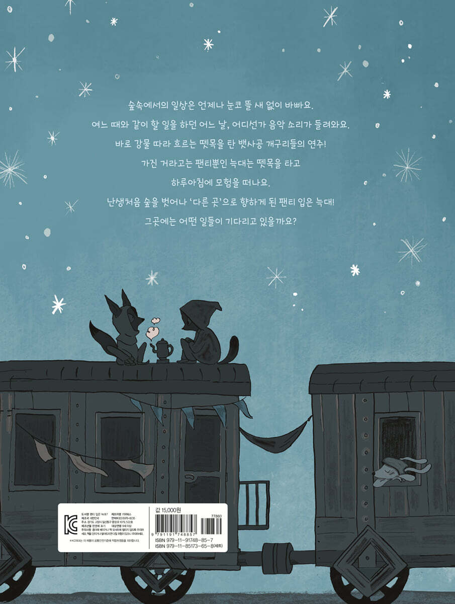 숲속에서의 일상은 단조롭습니다. 팬티 입은 늑대는 오늘도 망가진 덧창에서 새어 나오는 아침 햇살에 눈이 부셔 잠에서 깹니다. 그동안 미뤄 왔지만 이제는 덧창을 고쳐야겠다고 마음먹습니다. 그런데 공구함에는 못이 없었지요. 못을 사는 것 역시 너무 오래 미뤄 왔던 늑대는 드디어 길을 떠납니다. 지루하지만 반복되는 편안한 일상은 낯선 세상으로 향하는 발걸음을 가로막습니다. 하지만 자리를 박차고 일어나 발을 조금만 내딛으면 우리를 기다리던 전혀 다른 세상이 펼쳐집니다. 못을 사러 가던 늑대는 경쾌한 음악 소리를 따라가다 ‘다른 곳’으로 향하던 뱃사공 개구리들을 발견합니다. 함께 가겠냐는 제안에 덜컥 겁이 났지만 두려움에 떠는 마음속 콩알들을 땅에 두고 용감하게 뗏목에 오릅니다. 태어나서 처음으로 팬티 입은 늑대는 안락한 숲을 떠나 완전히 다른 세계로 향합니다. 팬티 입은 늑대가 사랑에 빠졌다? 용감한 늑대여, 전진! 어쩌다 기차에 몸을 싣게 된 팬티 입은 늑대는 두건을 쓴 여우를 만납니다. 기묘한 기차를 타고 달리고 달려 도착한 ‘다른 곳’에서 팬티 입은 늑대는 여우와 함께 익숙한 모양의 대왕 콩알 알라우프 조각상을 봅니다. 거대한 조각상은 마치 팬티 입은 늑대에게 간을 콩알만 하게 만드는 두려움도 아주 자연스럽고 중요한 감정이라는 걸 알려 주는 듯 보입니다. 수많은 조각상들을 구경한 후에는 여우와 함께 청소부들을 도와 조각상 청소도 합니다. 그런데 ‘넌 정말 멋진 늑대야.’라는 여우의 말 한 마디에 늑대는 안절부절못하고는 집으로 헐레벌떡 도망가 버리고 맙니다. 팬티 입은 늑대는 여우의 말에 새로운 감정을 느꼈던 걸까요? 《팬티 입은 늑대 7》은 일상에서의 짐을 내려놓고 한 발짝 더 나아가 보기로 마음먹은 늑대가 겪는 새로운 감정과 경험에 대해 이야기합니다. 낯선 곳에서 자연스레 드는 생소한 감정들을 느끼며 늑대는 미처 발견하지 못했던 자신의 새로운 모습들을 인정하고 받아들입니다. 이제 팬티 입은 늑대는 일상에서 벗어나는 것을 주저하지 않을 것입니다. 두렵지 않아서가 아니라 두려움을 인정하고 그 감정으로부터 도망치지 않을 수 있게 되었기 때문입니다. 두려움이라는 감정을 마주하고, 그럼에도 앞으로 나아갈 용기를 낼 때 비로소 우리는 새로운 세계를 만날 수 있습니다. 그 세계에서 사랑이라는 감정을 처음 알게 된 팬티 입은 늑대처럼 말이지요. |