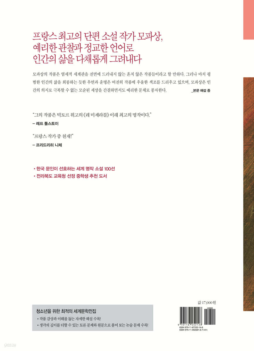 승마 목걸이 전원에서 노끈 쥘 삼촌 고아 귀향 불구자 첫눈 어느 여인의 고백 달빛 고해 성사 의자 고치는 여인 두 친구 비곗덩어리 미친 여자 산장 유령 마드무아젤 코코트 모파상 단편선 깊이읽기_해설편 토론·논술 문제편 |