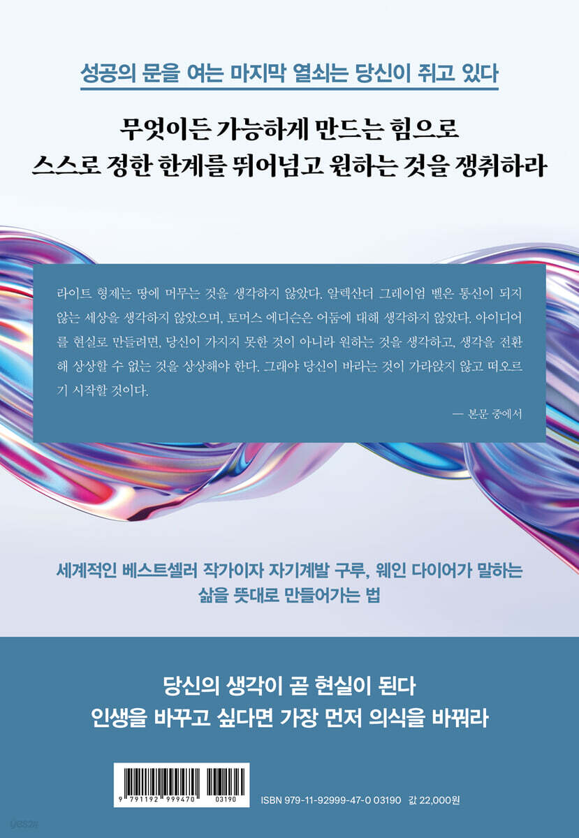 꿈같은 삶을 완성하는 마지막 조각, ‘의도’ 『의도의 힘』은 지금껏 성공의 필수 요소라 여겼던 개인의 의지력 대신 ‘의도’를 내세운다. 웨인 다이어 박사의 말에 따르면, ‘의도’는 우리 모두의 내면에 있는 힘이자 모든 곳에 존재하는 강력한 에너지장이다. 이 힘은 모든 존재의 시작과 끝을 관장하는, 무엇이든 만들어낼 수 있는 힘이다. 그리고 ‘의도’ 가 모든 곳에 있다는 뜻은, 누구나 ‘의도’와 접촉하여 자신이 원하는 것을 창조할 수 있다는 뜻이기도 하다. 그래서 저자는 ‘의도’에 연결해야 바라는 삶을 누릴 수 있다고 말한다. 물론 자아와 의지의 힘을 통해 목표를 성취해 온 이들에게 ‘의도에 몸을 맡기라’는 말은 언뜻 수동적으로 살라는 말처럼 들릴 수 있다. 그러나 의도에 따라 산다는 것은 주체적인 행동에 더 가깝다. 스스로에 대한 의심을 버리고, 자신의 의지로 꿈이 이루어질 것이라 믿겠다는 결정이기 때문이다. 확신은 자신의 의식 속 잠재력을 끌어내고, 필요한 일을 실천하게 만듦으로써 원하는 바를 현실로 구현해 낸다. 웨인 다이어 박사는 다양한 사례뿐 아니라 과학적 근거를 통해 ‘의도’가 지닌 현시의 힘을 설득력 있게 증명하고 있다. 생각을 바꾸면 인생이 바뀐다 우리의 현실을 만드는 상상력에 주목하라! 웨인 다이어 박사는 의도를 현실로 구현하는 과정에서 ‘상상력’을 가장 중요한 요소로 꼽는다. 상상력의 강력한 힘을 보여주는 접근법으로는 자신이 꿈꾸는 일이 이미 이루어진 것처럼 상상하고 행동하라는 ‘끝에서부터 생각하기’가 있다. 웨인 다이어 박사는 누구보다도 이러한 메커니즘을 잘 활용하는 사람이다. 그는 ‘끝에서부터 생각하기’ 기술을 통해 의도에 따라 자신의 목표를 이뤄낸 자신의 모습을 상상한다. 이 상상은 그가 의지력을 발휘해 일을 끝까지 해내는 원동력이 된다. 단순히 자신이 의도에 따라 이 일을 해낼 것이라고 믿는 데서 그치지 않고, 실질적인 결과를 만들어낼 수 있도록 상상과 의지를 적절히 활용하는 것이다. 이 방법을 이용해 웨인 다이어 박사는 40여 권의 책을 써내고, 마라톤을 완주했다고 한다. 이처럼 웨인 다이어 박사는 자신이 만들고 싶은 현실에 맞게 의식을 바꾸는 법을 먼저 소개하고, 이를 실천할 수 있는 행동 지침을 함께 제시하며 ‘의도’를 통해 꿈을 현실로 만드는 법을 알려준다. 물질적 성공은 반쪽짜리 성공일 뿐 삶에 진정한 풍요를 끌어당기는 법 누구나 성공하기를 간절히 바라고 원한다. 그런데 ‘성공’이란 정확히 무엇을 뜻할까? 단순히 부와 명예를 얻는 것도 성공에 속하기는 하지만, 그 과정에서 인간관계가 망가지거나 마음의 평화를 잃게 된다면 참된 의미의 성공이라 할 수 없을 것이다. 그런 의미에서 ‘의도’에 연결하는 일은 진정한 성공으로 나아가는 첫걸음이다. 의도를 통해 얻는 성공은 타인을 배제하고, 상대와 우열을 가른 끝에 쟁취하는 ‘승리’ 가 아니다. 오히려 타인과 자신이 연결된 하나의 존재임을 깨닫고, 타인과 세상에 대한 연민과 공감을 극대화한 끝에 비로소 맞이하는 몸과 마음의 풍요로움이다. 승리는 한정된 자원이지만, 풍요로움은 아무리 나누어도 닳지 않으므로 원한다면 모두가 누릴 수 있다. 끝없는 경쟁에 모두가 자기 자신을 소진하고 있는 지금, 웨인 다이어 박사의 말에 귀 기울여야 하는 이유다. |