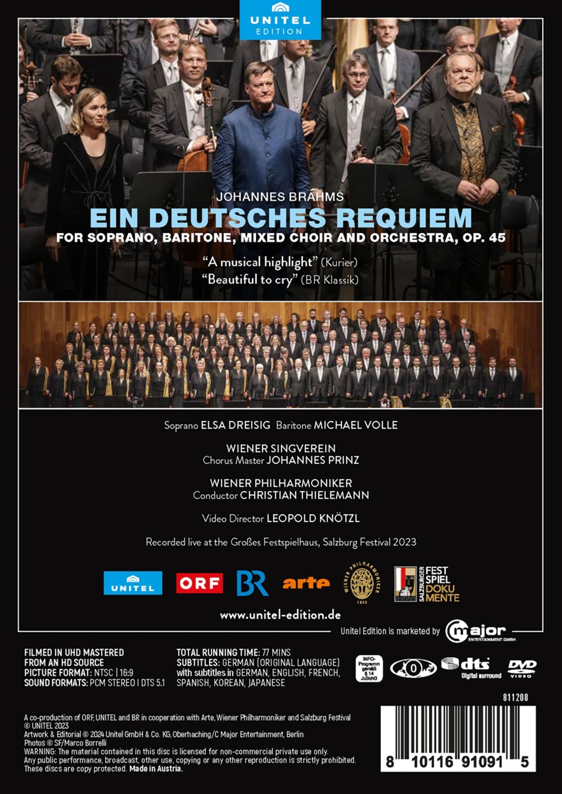 그의 합창 대작 독일 레퀴엠은 전례상의 장송 미사(Missa pro defunctis)의 내용이 아니라 브람스가 루터 성서에서 고른 내용으로 이루어져 있다. 이 작품은 그의 일생에서 세 번에 걸쳐 작곡되었다. 2악장의 초기 판본은 로베르트 슈만이 자살한 지 얼마 안된 1854년에 작곡한 것으로, 나중에 피아노 협주곡 1번에 쓰였다. 레퀴엠의 대부분은 1865년 어머니가 죽은 뒤에 작곡하였다. 5악장은 1868년 공식 초연 이후에 덧붙인 것으로, 작품은 1869년에 출판하였다.