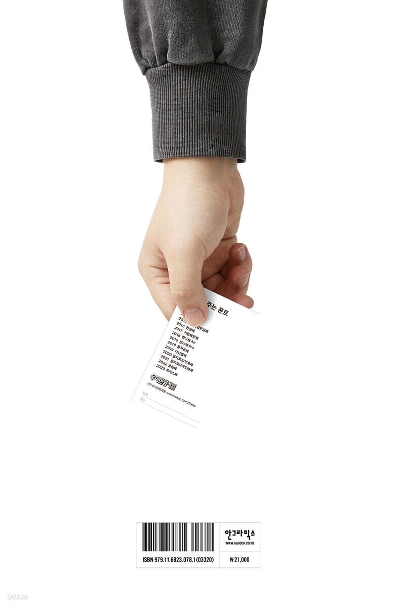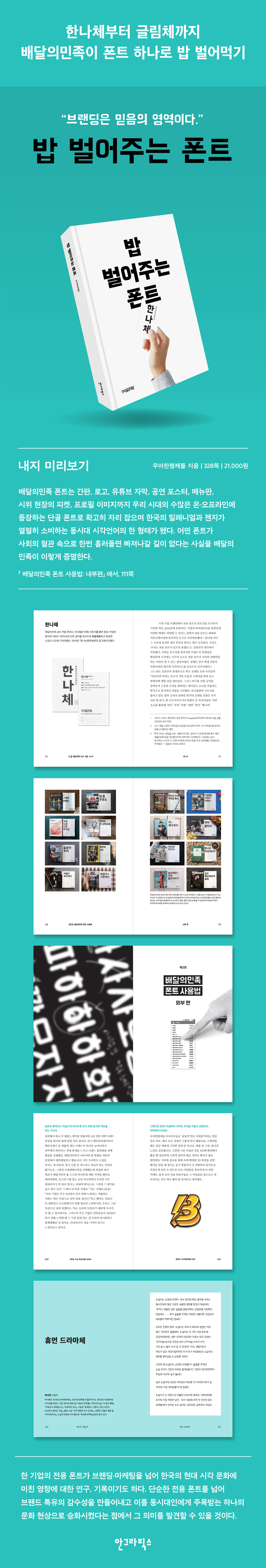 추천사 1. 배달의민족 폰트 개발 스토리 한나체 주아체 도현체 한나는열한살체 연성체 기랑해랑체 한나체 에어 한나체 프로 을지로체 을지로10년후체 을지로오래오래체 다니엘체 & 루카스체 글림체 2. 배달의민족 폰트 사용법 내부 편 하나. 페르소나를 담자 둘. 유머와 위트를 표현하자 셋. 한나체만 씁시다 넷. 무료 배포하자 다섯. 꾸준히 만듭시다 여섯. 자주 노출하자 일곱. 한글을 쓰자 여덟. 휴머니스트가 되자 아홉. 전시도 해볼까? 열. 가지고 놀면 좋아요 열하나. 외국에서도 잘 쓰자 열둘. 협업을 하자 1 열셋. 폰트 이름을 자식 이름처럼 귀하게 짓자 외부 편 하나. 대학생도 쓰네 둘. 작은 기업도 쓰네 셋. 책에도 쓰네 넷. 아니, 여기에도 쓴다고? 다섯. 활동가도 쓰네 여섯. 유튜버도 쓰네 일곱. 구성원도 쓰네 여덟. 이모티콘에도 쓰네 아홉. 아티스트도 쓰네 열. 간판에도 쓰네 3. 주요 등장인물 인터뷰 “브랜딩은 믿음의 영역이다.” 김봉진 우아한형제들 창업자, 경영하는 디자이너 “배달의민족 폰트 개발 방식은 압도적인 톱다운이었다.” 한명수 우아한형제들 CCO “배달의민족 폰트는 하나의 문화적 유산이다.” 석금호 산돌 의장 배달의민족 폰트에 대해 말하는 목소리들 방은하 전 우아DH아시아 크리에이티브 디렉터, 전 HS애드 ECD 인기완 전 우아한형제들 해외사업 부문장, 장인성 전 우아한형제들 CBO 4. 앤솔로지 휴먼 드라마체 : 박서련 소설가 서체의 표정 : 최장순 LMNT 크리에이티브 디렉터 배달의민족은 무료 폰트를 배포한다는데, 왜 그렇게 하죠? : 한석진 브리스틀 대학교 경제학과 교수 기술과 디자인의 ‘맛남’, 배달의민족 폰트에 녹아 있는 테크 이야기 : 이도희 이도타입 대표 불안과 갈등의 시대에 배달의민족 폰트가 주는 행복 : 로버트 파우저 언어학자 와, 이건 뭐지? 도대체 무슨 미감일까? 무료 배포라고? : 장수영 한글 타입 디자이너 토론토 한글 워크숍에서 발견한 배달의민족 폰트의 버내큘러 : 박경식 그래픽 디자이너 간판과 활자와 을지로체 : 민본 홍익대학교 미술대학 시각디자인학과 교수 |