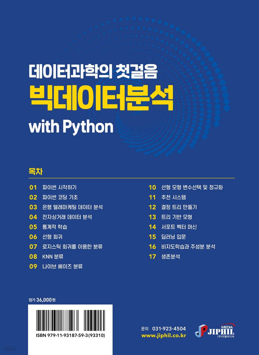 02 파이썬 코딩 기초 03 은행 텔레마케팅 데이터 분석 04 전자상거래 데이터 분석 05 통계적 학습 06 선형 회귀 07 로지스틱 회귀를 이용한 분류 08 KNN 분류 09 나이브 베이즈 분류 10 선형 모형 변수선택 및 정규화 11 추천 시스템 12 결정 트리 만들기 13 트리 기반 모형 14 서포트 벡터 머신 15 딥러닝 입문 16 비지도학습과 주성분 분석 17 생존분석 |
