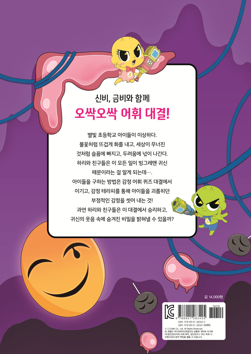 귀신과 한판 벌이는 오싹오싹 어휘 대결 『신비아파트 어휘 귀신 1. 네 감정을 말해 봐!』는 주인공 하리 일행이 친구들의 감정을 교묘하게 이용하여 위험에 빠뜨리는 빙그레맨 귀신과 대결하는 이야기이다. 갑작스레 불꽃처럼 뜨겁게 화를 내고, 세상이 무너진 듯 슬픔에 빠지고, 두려움에 넋이 나간 별빛 초등학교 친구들···. 하리 일행은 지나치게 부정적인 감정에 휩싸여 폭주하는 아이들을 구해 내기 위해 귀신이 내는 감정 어휘 퀴즈에 도전한다. 과연 주인공들은 퀴즈 대결에서 이기고 감정 테라피를 통해 아이들을 괴롭히던 부정적인 감정을 씻어 낼 수 있을까? 또 귀신의 웃는 가면 속에 숨겨진 비밀을 밝혀낼 수 있을까? 잡히지 않는 감정을 또렷한 언어로! 신비, 금비와 함께 키워 보는 어휘력과 표현력 아이들은 학교뿐만 아니라 일상생활 속에서 다양한 감정과 마주한다. 감정은 다양한 데다 시시때때로 변하지만, 많은 아이가 그 감정이 무엇인지조차 제대로 알지 못해 혼란스러워한다. 자신이 느낀 감정에 구체적인 이름을 붙이고 이를 다른 사람에게 표현하는 능력은 자신을 비롯해 다른 사람과 건강한 관계를 맺기 위해 반드시 익혀야 하는 것이다. 초등 교과 과정에서 저학년 때부터 감정 어휘를 가르치는 이유이기도 하다. 『신비아파트 어휘 귀신 1. 네 감정을 말해 봐!』는 아이들이 일상에서 경험할 법한 감정과 관련된 표현을 다양하게 다룬다. ‘화’와 ‘질투’ 같은 구체적인 단어를 제시할 뿐만 아니라 ‘콧등이 시큰하다.’ 같은 관용어, ‘하룻강아지 범 무서운 줄 모른다.’ 같은 속담, ‘시간이 덜어 주지 않는 슬픔은 없다.’ 같은 명언, ‘전전긍긍’과 같은 사자성어 등 훨씬 더 확장된 표현을 익히게 한다. 재미있는 스토리와 미션을 통해 감정 어휘를 익히고 이를 어떤 상황에서 어떻게 표현해야 효과적인지도 자연스레 배울 수 있는 것이다. 특히 이 책은 부정적 감정을 잘 다스리고 긍정적 감정을 키우는 법에 초점을 맞추고 있다. 서울대 심리학과 민경환 교수팀의 ‘한국어 감정 단어 연구’에 따르면, 한국어 감정 단어 중 약 70%가 불쾌한 감정을 나타내는 어휘이다. 그만큼 불쾌하고 부정적 감정이 우리를 압도하기 쉽다는 뜻이다. 이 책은 실생활에서 흔히 경험하는 부정적 감정을 바탕으로 에피소드를 꾸려 독자들이 이야기에 쉽게 스며들게 하고, 그 과정을 통해 부정적 감정을 효과적으로 표현하고 긍정적 감정을 되살릴 수 있는 법을 알게 한다. 에피소드마다 ‘신비의 감정 테라피’ 코너를 마련하여 ‘화날 때’, ‘슬플 때’, ‘두려울 때’ 어떻게 대처할지에 대한 방법을 차근차근 알려 준다. 그리고 그 감정이 지나가면 어떤 긍정적 감정이 생겨나는지도 알아본다. 자기 감정을 객관적으로 파악하고, 어휘와 연결해 표현력을 키우고, 감정을 다스리는 법까지 조언하는 이 책을 통해 많은 어린이 독자가 마음 건강한 생활을 할 수 있게 되기를 바란다. 무조건 읽고 외우는 딱딱한 공부는 No! 술술 읽고 게임 미션처럼 풀어 나가는 재미난 교양서 〈신비 아파트 어휘 귀신〉 시리즈는 어린이들이 꼭 알아야 할 어휘를 효과적으로 익힐 수 있도록 흥미진진한 스토리 속에 다양한 액티비티를 녹여 낸다. 일기를 읽으며 감정을 찾는 퀴즈, 초성을 보고 감정에 관한 속담을 완성하는 퀴즈. 신체적 변화를 감정 어휘로 표현하는 퀴즈, 퍼즐 속 감정 단어를 찾는 퀴즈 등을 통해 게임 하듯 어휘력을 키울 수 있다. 또한 이 시리즈는 다양한 어린이 논픽션을 작업해 온 베테랑 작가들이 글을 맡고, 국내 최대 웹툰 제작사 케나즈가 만화 연출을 맡아 제작되었다. 〈신비아파트〉를 소재로 한 기존 책들과 다르게 서사를 새롭게 만들어 냈을 뿐만 아니라 애니메이션에는 나온 적 없는 귀신 캐릭터들을 등장시킨다. 애니메이션을 좋아하는 팬들에게는 익히 알아 온 캐릭터들의 전혀 새로운 이야기를 만나 볼 선물이 되고, 〈신비아파트〉를 처음 접하는 독자들에게도 흥미진진한 스토리와 함께 생활 교양을 업그레이드하는 좋은 기회가 되어 줄 것이다. |