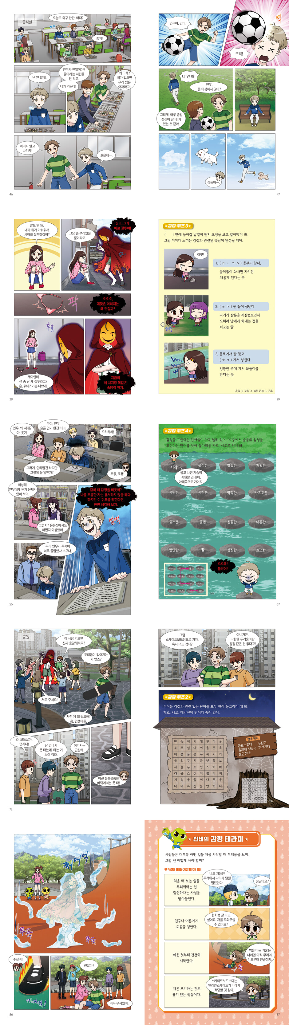 감정 퀴즈 1│어휘의 뜻 감정 퀴즈 2│글과 어울리는 어휘 찾기 감정 퀴즈 3│속담 완성하기 감정 퀴즈 4│어휘 퍼즐 감정 퀴즈 5│흉내 내는 말 신비의 감정 테라피│화가 날 때는 이렇게 해 봐! 2. 헤어 나오지 못하는 슬픔 감정 퀴즈 1│속담 완성하기 감정 퀴즈 2│그림과 어울리는 어휘 찾기 감정 퀴즈 3│관용어 완성하기 감정 퀴즈 4│어휘 미로 감정 퀴즈 5│명언, 속담 완성하기 신비의 감정 테라피│슬플 때는 이렇게 해 봐! 3. 넘치는 두려움, 모자란 두려움 감정 퀴즈 1│어휘의 뜻 감정 퀴즈 2│어휘 퍼즐 감정 퀴즈 3│흉내 내는 말 감정 퀴즈 4│속담 완성하기 감정 퀴즈 5│사자성어 완성하기 감정 퀴즈 6│관용어의 뜻 신비의 감정 테라피│두려울 때는 이렇게 해 봐! |