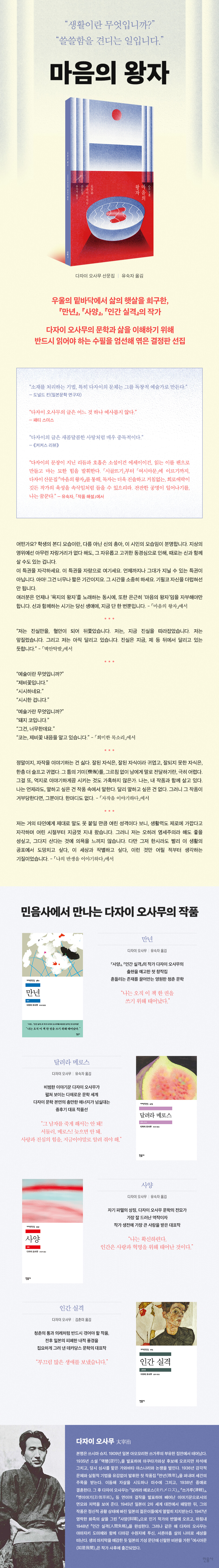 “생활이란 무엇입니까?”“쓸쓸함을 견디는 일입니다.” 삶에 대한 두려움과 불안 사이에서 방황한 ‘인간’ 다자이 오사무와문학에 헌신한 ‘작가’ 다자이 오사무의 진면목을 살필 수 있는 46편의 주옥같은 산문“소재를 처리하는 기법, 특히 다자이의 문체는 그를 독창적 예술가로 만든다.” -도널드 킨(일본문학 연구자) “다자이 오사무의 글은 어느 것 하나 예사롭지 않다.” -패티 스미스“다자이의 글은 새콤달콤한 사탕처럼 매우 중독적이다.” -《커커스 리뷰》“다자이의 문장이 지닌 리듬과 호흡은 소설이건 에세이이건, 읽는 이를 팬으로 만들고 마는 묘한 힘을 발휘한다. (……) 「시골뜨기」부터 「여시아문」에 이르기까지, 다자이 산문집 『마음의 왕자』를 통해, 독자는 더욱 진솔하고 거침없는, 희로애락이 깃든 작가의 육성을 속삭임처럼 들을 수 있으리라. 잔잔한 공명이 일어나기를, 나는 꿈꾼다.” -유숙자, 「작품 해설」에서 불안하고 고독한 청춘의 화신이자 전후 시대의 황폐한 정신 세계를 체현한 작가, 다자이 오사무의 문학과 삶을 이해하기 위해 필독해야 하는 46편의 산문을 한데 엮은 『마음의 왕자』가 민음사 쏜살 문고로 출간되었다. 다자이 오사무는 우리나라 독자에게 특히 친숙한 일본 작가로, 그의 대표작 『인간 실격』, 『사양』 등은 여전히 많은 이들에게 사랑받고 있다. 그러나 다자이와 그의 작품을 둘러싼 독자의 비상한 관심에도 불구하고 정작 작가의 진면목을 살필 수 있는 산문은 파편적으로 소개되어 왔을 뿐, 좀체 일목요연하게 엮인 적이 드물었다. 이번에 출간된 『마음의 왕자』는 작가의 문학 인생을 초기(1933)부터 최후(1948)까지 톺아볼 수 있도록 결정적 작품만을 연대별로 엄선하여 수록한 산문집으로, 작가의 애독자에겐 물론 그의 대표작을 통해 이제 막 다자이의 문학 세계에 입문한 이들에게까지도 깊은 감동과 통찰을 선사해 줄 것이다. 또 그동안 다자이에게 붙어 있던 ‘데카당스(퇴폐주의)’라는 꼬리표를 떼고, 생활과 문학에 혼신을 다하는 ‘인간’ 다자이 오사무의 맨얼굴, 날것 그대로의 생생한 목소리를 체험할 수 있다. 지금껏 다자이 오사무의 대표작 『사양』, 『만년』, 『달려라 메로스』 등을 우리말로 소개해 온 유숙자 번역가가 직접 엮고 다자이만의 고유한 호흡과 리듬을 빈틈없이 살려 옮긴 『마음의 왕자』는 작가의 문장 자체가 지닌 즐거움, 호소력 짙은 울림 역시 일깨워 준다. “어떤가요? 학생의 본디 모습이란, 다름 아닌 신의 총아, 이 시인의 모습임이 분명합니다. 지상의 영위에선 아무런 자랑거리가 없다 해도, 그 자유롭고 고귀한 동경심으로 인해, 때로는 신과 함께 살 수도 있는 겁니다. 이 특권을 자각하세요. 이 특권을 자랑으로 여기세요. 언제까지나 그대가 지닐 수 있는 특권이 아닙니다. 아아! 그건 너무나 짧은 기간이지요. 그 시간을 소중히 하세요. 기필코 자신을 더럽혀선 안 됩니다. 여러분은 언제나 ‘육지의 왕자’를 노래하는 동시에, 또한 은근히 ‘마음의 왕자’임을 자부해야만 합니다. 신과 함께하는 시기는 당신 생애에, 지금 단 한 번뿐입니다.” -「마음의 왕자」에서 “저는 진실만을, 혈안이 되어 뒤쫓았습니다. 저는, 지금 진실을 따라잡았습니다. 저는 앞질렀습니다. 그리고 저는 아직 달리고 있습니다. 진실은 지금, 제 등 뒤에서 달리고 있는 듯합니다.” -「벽안탁발」에서 『마음의 왕자』는 다자이 오사무의 문학 역정을 따라가듯, 그가 본격적으로 작가 생활을 시작한 1933년부터 아쿠타가와상 후보에 오른 1935년, 파비날 중독에 시달리면서도 첫 작품집 『만년』을 출간한 1936년, 여러 걸작을 연이어 써낸 1938년에서 1940년대 초반, 그리고 대표작 『사양』(1947)과 『인간 실격』을 발표하고 극단적 선택을 한 1948년에 이르기까지, 그의 문학적 발자취뿐만 아니라 인생의 결정적 순간들 역시 한눈에 펼쳐 보인다. 예컨대 다자이는 각각의 산문을 통해 그 어느 작품에서보다 더 솔직하게, 먼 고향에서 대도시 도쿄로 상경한 ‘시골뜨기’의 불안, ‘부잣집 도련님’으로서의 부채감, 낯선 이를 두려워하면서도 한없이 그리워하는 기묘한 애정, 죽고 싶지 않지만 더는 살아갈 수 없는 자의 우수, 작가로서의 긍지와 지조를 지키기 위한 분투, 기성 문단에 대한 혐오와 성공하고자 하는 갈망 등 ‘인간’이라면 누구나 가슴에 품고 있을 법한 삶의 고뇌와 취약성, 선택의 기로에서 불가피하게 맞닥뜨릴 수밖에 없는 양가감정, 애처롭게 요동치는 심경을 타고 오르내리는 우울과 분노를 절절하게 들려준다. “문학에서 가장 중요한 건, ‘정성을 다한다’는 것이다. ‘정성을 다한다’고 말한들, 자네들은 이해 못 할지도 모르지. 그러나 ‘친절’이라 말해 버리면, 맨송맨송하다. 배려. 의기. 마음 씀씀이. 그리 말해도, 여전히 딱 들어맞지 않는다. 요컨대, ‘정성을 다한다’는 거다. 작자의 그 ‘정성을 다한다’가 독자에게 통했을 때, 문학의 영원성이라든가 혹은 문학의 고마움이라든가 기쁨이라든가, 그러한 것이 비로소 성립한다고 생각한다.” -「여시아문」에서 “어차피 자네들은 게으름뱅이라, 