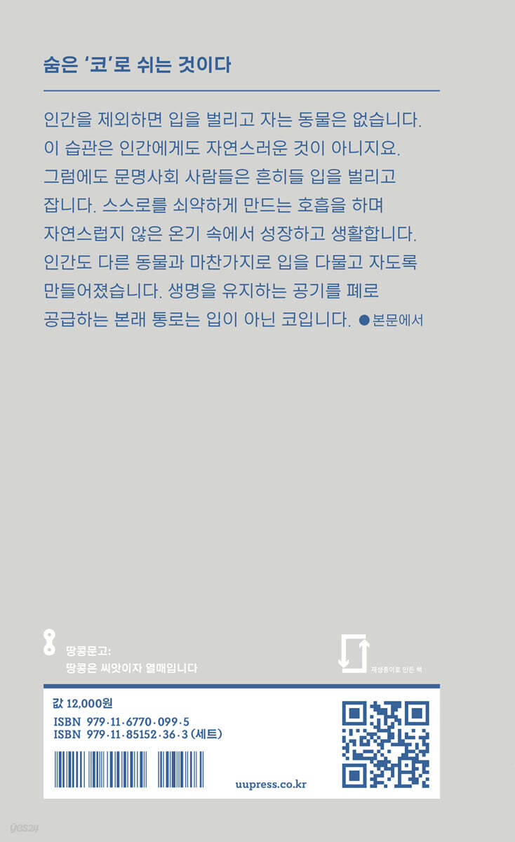 들어가는 말 ― 건강하게 살면서 천수를 누리기 위하여 1. 아메리카 원주민의 삶을 엿보다 2. 문명화된 인류가 질병에 더 취약하다 3. 삶의 기본이자 핵심으로서의 수면 4. 입으로 숨 쉬는 나쁜 습관 5. 코의 존재 이유 6. 폐를 함부로 다루는 호흡법 7. 입은 치아를 보호한다 8. 자연 그대로의 삶을 사는 원주민과 그렇지 않은 문명인 9. 만성피로와 잔병치레의 원인 10. 폐에도 ‘커튼’이 필요하다 11. 입을 다무는 수면 습관 들이기 12. 입의 다양한 역할 중 숨 쉬기는 없다 13. 입을 다물면 많은 것이 바뀐다 14. 입 다무세요! 옮긴이의 말 |