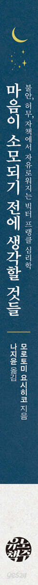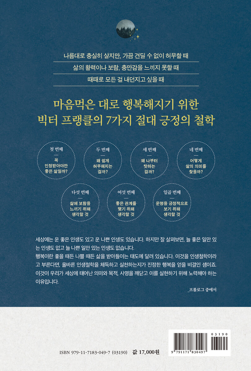 제1장 꼭 인정받아야만 좋은 삶일까?│프랭클이 말하는 ‘마음이 소모되는 이유’ 고민 많은 한 상담가의 사연 올라갈 때가 있으면 내려갈 때도 있다 만족스러운 삶의 순간은 사실 짧다 결핍이 채워지는 순간 일어난 일들 이기적일수록 승자가 되는 모순 답이 없는 물음을 반복할 때 막다른 길에서 인생에게 물을 것들 삶의 가치를 찾아 헤매는 시간 제2장 왜 쉽게 허무해지는 걸까?│프랭클이 알려 주는 ‘행복의 역설 깨닫기’ 허무함은 어느날 문득 찾아온다 우리가 중독에 빠지는 이유 허무함에 지는 사람의 특징 철학적 사고는 위험하다? ‘중년의 위기’가 오는 이유 “인생은 세상에서 보낸 4일간의 수학여행이다” 바라면 바랄수록 멀어지는 것 행복해지는 가장 쉬운 방법 제3장 왜 나부터 탓하는 걸까?│프랭클에게 배우는 ‘인생철학 바로잡기’ 왜 나만의 인생철학이 필요할까? 나쁘다는 걸 알면서 벗어나지 못하는 이유 나는 행복해질 자격이 있다는 다짐 내 인생이 나만의 것이라는 생각의 함정 당연하지 않은 걸 당연시할 때 오는 것 제4장 어떻게 삶의 의미를 찾을까?│프랭클이 소개하는 ‘스스로에게 질문 던지기’ ‘해도 그만 안 해도 그만’이 위험한 이유 죽을 권리도 있다는 착각 고민이 사라지게 하는 단 하나의 방법 인생이 그 자체로 시련이자 도전인 이유 인생이 우리에게 던지는 질문 “이 세상에 의미 없는 인생이란 없다” 삶의 소중함을 인식하는 법 제5장 삶에 보람을 느끼기 위해 생각할 것│실전1: 창조 가치 실현하기 절망을 이기는 최소한의 생각 삶의 의미를 발견하는 세 가지 질문 창조 가치란 무엇일까? 프랭클이 수용소에서 견딜 수 있었던 이유 나만이 할 수 있는 일이라는 생각 보람은 이것을 인정받을 때 생긴다 과감하되, 무모하지는 마라 빅터 프랭클처럼 나를 돌아보기 1 제6장 좋은 관계를 맺기 위해 생각할 것│실전2: 체험 가치 실현하기 체험 가치란 무엇일까? 자신을 필요로 하는 사람이 있다는 믿음 삶의 원동력을 이것 하나로 채울 수 있다 부정적인 자기 이미지 바꾸는 법 가족만큼 ‘훌륭한 관계’는 없다 가족만큼 ‘어려운 관계’도 없다 최선을 다해도 공허한 이유 나를 뛰어넘기 위한 과제 관계에서 가장 중요한 세 가지 조건 빅터 프랭클처럼 나를 돌아보기 2 제7장 운명을 긍정적으로 보기 위해 생각할 것│실전3: 태도 가치 실현하기 생각 하나만 바꾸자 생겨난 일 당당하게 살기 위해 필요한 최소한의 태도 상처투성이라도 괜찮은 이유 태도 가치란 무엇일까? 운명을 대하는 올바른 태도 부정을 긍정으로 바꾸는 방법 기회를 놓치지 않기 위해 기억해야 할 것들 인생의 진실은 언제나 단 하나뿐이다 빅터 프랭클처럼 나를 돌아보기 3 에필로그 이제는 살아갈 용기가 생겼다 |