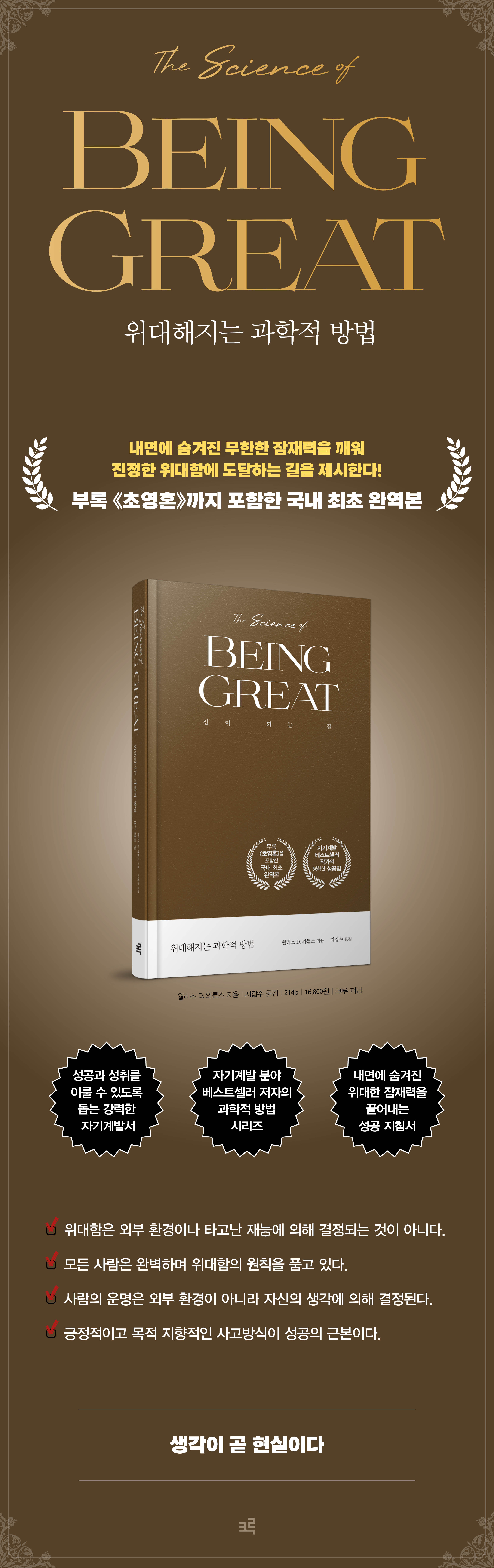 진정한 위대함에 도달하는 길을 제시한다 『위대해지는 과학적 방법』 부록인 『초영혼』까지 포함한 국내 최초 완역본! 당신의 삶을 변화시킬 열쇠입니다. 삶의 모든 측면에서 성공과 성취를 이룰 수 있도록 돕는 강력한 자기계발서이다. 무엇보다도 이 책은 누구나 위대해질 수 있다는 점을 강조한다. 위대함은 외부 환경이나 타고난 재능에 의해 결정되는 것이 아니라, 자신의 내면에 존재하는 힘을 깨닫고 이를 활용하는 데 달려 있기 때문이다. "모든 사람에게는 위대함의 원칙이 내재해 있다. 이 원칙을 지혜롭게 사용하고 관리하면 누구나 자신이 갖고 있는 마음의 능력을 계발할 수 있다." 이 책을 읽는 순간, 당신은 그동안 알지 못했던 자신 안의 힘을 발견하게 될 것이다. 저자는 "생각이 곧 현실이다"라는 신념을 강조하고 있다. 긍정적이고 목적지향적인 사고방식이 성공의 근본이며, 사람의 운명은 외부 환경이 아니라 자신의 생각에 의해 결정된다는 진리를 알기 쉽게 설명했다. 『부자가 되는 과학적 방법』을 통해 물질적 성공의 원리를 배웠다면, 이제는 『위대해지는 과학적 방법』을 통해 더 깊은 내면적 성장을 경험할 차례이다. 책의 구성은 위대한 사람 혹은 신과 같은 사람이 되기 위한 방법을 22개 장으로 나누어 소개한다. 그의 통찰력 있는 조언은 단순한 이론에 그치지 않고, 실제로 삶에 적용할 수 있는 실천적 지침을 포함하고 있어 무척 유용하다. 누구나 실천할 수 있다는 점은 와틀스 저자가 쓴 책의 뚜렷한 특징이다. 일상생활에서 쉽게 실천할 수 있는 조언이기 때문에 이를 통해 독자들은 실제적인 변화를 경험하게 될 것이다. 이 책에 소개된 원칙들 또한 다양한 상황과 환경에서 적용될 수 있도록 설계되어 있으며, 개인적, 직업적 목표에 맞게 응용할 수 있다. 따라서 위대해지고자 하는 바람이 있다면, 성공을 원하는 뚜렷한 마음을 가지고 있다면 이 책이 무엇보다도 강력한 동기부여를 제공할 것이다. “다른 사람들이 여러분의 미래를 결정하게 놔두지 말라. 되고 싶다고 스스로 느끼는 것이 되어라.” 자신의 한계를 뛰어넘고, 진정한 성공과 행복에 도달하는 길을 배우자. 특히 와틀스의 명작인 『부자가 되는 과학적 방법』을 읽고 감명을 받은 독자라면, 이 책을 통해 자신의 잠재력을 최대한 발휘하고 진정으로 만족스러운 삶을 즉각 실천할 수 있을 것이다. 이 책을 읽고, 그 변화를 삶에 실현해보자. |