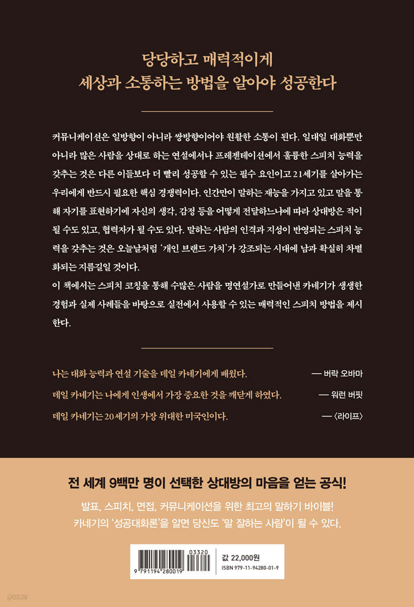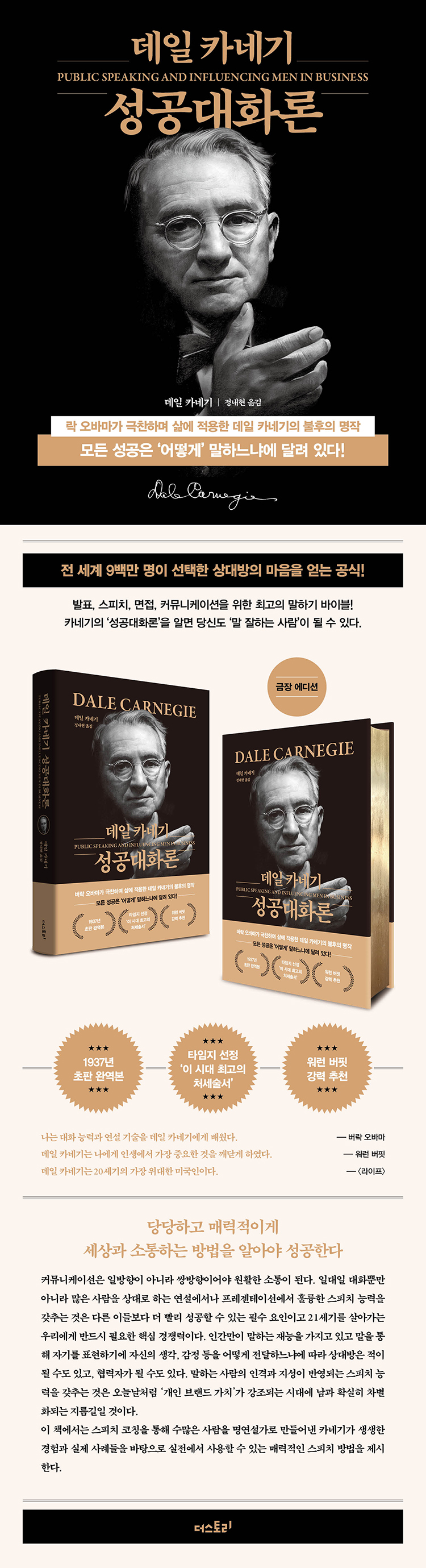 1장 | 용기와 자신감을 키워라 첫째, 강하고 변치 않는 욕망을 가져라 | 둘째, 말하려는 내용을 명확하게 꿰고 있어라 | 셋째, 자신감 있게 행동하라 | 넷째, 연습하라! 연습하라! 연습하라! 2장 | 준비를 잘하면 자신감이 생긴다 연설을 준비하는 올바른 방법 | 연설에서 절대 실패하지 않는 방법 | 진정한 준비란 무엇인가 | 예일 대학교 브라운 학장의 현명한 충고 | 링컨의 연설 준비 방법 | 당신은 연설을 어떻게 준비해야 할까 | 여분의 능력이 가진 비밀 3장 | 유명 연사들은 이렇게 준비했다 대상을 받은 연설은 어떻게 구성될까 | 콘웰 박사가 연설을 준비하는 방법 | 베버리지 상원의원이 연설을 계획하는 방법 | 우드로 윌슨의 요지 구성법 | 벤저민 프랭클린의 옛날이야기 활용법 | 메모를 정리하고 선별하라 | 연설할 때 메모를 사용해야 할까 | 연설문을 외우려 하지 마라 | 아포맷톡스에서의 그랜트 장군 | 농부들은 왜 링컨이 게으르다고 생각했을까 | 더글러스 페어뱅크스와 찰리 채플린이 하던 놀이 4장 | 기억력을 향상시켜라 인식의 능력 | 링컨의 소란스러운 연습 | 메모 없이 연설한 마크 트웨인 | 신약성서처럼 긴 책을 외우는 방법 | 현명하게 반복하라 | 윌리엄 제임스 교수가 말하는 좋은 기억력의 비결 | 사실들을 결합시키는 방법 | 날짜 외우는 법 | 연설의 요지를 기억하는 방법 | 완전히 잊어버릴 경우의 대처법 | 특별한 결합 5장 | 청중을 깨어 있게 만들어라 간절하게 말하고 싶은 주제가 있어야 한다 | 승리의 비결 | 재판을 승리로 이끈 링컨의 연설 | 진실하게 행동하라 | 청중이 졸 때 가장 먼저 해야 할 일 | 애매한 표현은 삼가라 | 청중을 사랑하는 태도 6장 | 성공적인 연설의 필수 요소 끈기의 필요성 | 끊임없는 도전 | 보상의 확신 | ‘와일더 카이저’에 올라라 | 승리에 대한 의지 7장 | 좋은 연설의 비법 전달이란 무엇일까 | 전달을 잘하는 비결 | 헨리 포드의 충고 | 대중연설 연습, 이렇게 하라 8장 | 연단에 서기 전에 준비해야 할 것들 다른 연사보다 주의를 끄는 비결 | 옷차림이 끼치는 영향 | 그랜트 장군의 한 가지 후회 | 우리는 연설 시작 전에도 비난받거나 칭찬받는다 | 청중을 모아라 | 창문을 깬 폰드 장군 | 조명의 효과 | 연단을 정리하라 | 연단 위에 게스트를 들이지 마라 | 착석의 기술 | 몸의 균형 | 제스처라는 이름으로 교육되는 우스꽝스러운 것 | 도움이 되는 제안들 9장 | 연설을 훌륭하게 시작하는 방법 유머로 시작할 때 주의하라 | 사과로 연설을 시작하지 마라 | 호기심을 유발하라 | 관심을 끄는 이야기 | 구체적인 예를 들어라 | 시각 자료를 활용하라 | 질문을 던져라 | 유명 인사의 말을 인용하라 | 청중의 관심사와 주제를 연결하라 | 충격적인 사실의 힘 | 평범한 시작의 가치 10장 | 단번에 청중을 사로잡는 방법 꿀 한 방울과 쌍권총을 든 남자들 | 롯지 상원의원의 방법 | 최고의 논쟁은 설명이다 | 패트릭 헨리가 연설을 시작하는 방법 | 셰익스피어가 쓴 최고의 연설 11장 | 연설을 제대로 마무리하는 방법 핵심을 요약하라 | 행동을 촉구하라 | 간결하고 진정한 칭찬 | 유머러스한 마무리 | 시적 인용을 활용하라 | 성서 인용구의 힘 | 클라이맥스 기법 | 아쉬움의 미학 12장 | 의미를 명확하게 전달하라 구체적인 예를 들어라 | 이해를 돕는 비교를 사용하라 | 전문적인 용어는 피하라 | 링컨이 명확한 연설을 할 수 있었던 비결 | 시각에 호소하라 | 록펠러, 동전을 쓸다 | 핵심 내용은 말을 바꿔 재진술하라 | 일반적인 예와 구체적인 예 | 산양을 흉내 내지 마라 13장 | 인상적으로 설득하라 우리의 주된 문제 | 심리학이 주는 도움 | 사람들이 이미 믿고 있는 것과 당신이 생각하는 것을 연결시켜라 | 성 바울의 기지 | 작은 것은 크게, 큰 것은 작아 보이게 만들어라 | 수치를 인상적으로 만드는 방법 | 바꿔 말하기의 효과 | 일반적인 사례와 구체적인 사례 | 축적의 원리 | 시각적인 비교 | ‘권위자’의 도움을 받아라 14장 | 청중의 흥미를 돋우는 방법 세상에서 가장 재미있는 세 가지 | 좋은 대화자가 되는 방법 | 200만 독자를 끌어모은 아이디어 | 콘웰 박사가 100만 명의 청중을 사로잡은 방법 | 항상 관심을 끄는 연설 자료 | 구체적이어야 한다 | 시각적인 언어 | 대조와 흥미 유발 효과 | 흥미는 전염된다 15장 | 행동을 이끌어 내는 방법 신뢰받을 자격을 갖춰라 | 경험을 전하라 | 제대로 소개받아라 | 왕포아풀과 히코리나무의 재 | 나의 주장이 지닌 장점을 알려줘라 | 반대 의견에 대한 패터슨식 대처법 | 욕망과 욕망이 싸우게 하라 | 우리의 행동을 결정하는 욕망 | 종교적인 동기 16장 | 언어의 마술사가 되는 방법 마크 트웨인의 비밀 | 언어에 담긴 낭만적인 이야기 | 한 문장을 104번 고쳐 쓰다 | 진부한 표현은 피하라 |