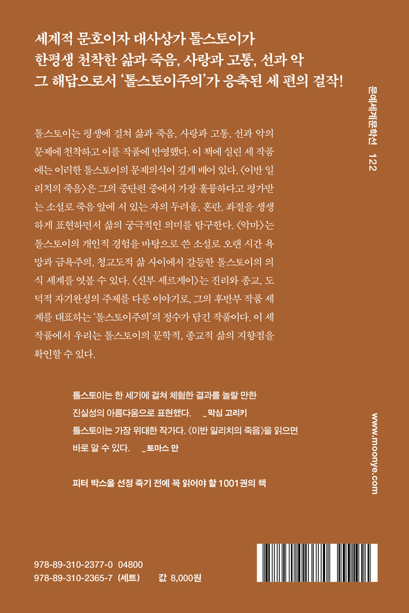 한평생 천착한 삶과 죽음, 사랑과 고통, 선과 악 그 해답으로서 ‘톨스토이주의’가 응축된 세 편의 걸작! 세계적 문호이자 대사상가인 톨스토이는 평생에 걸쳐 삶과 죽음, 사랑과 고통, 선과 악의 문제에 천착했다. 그리고 노년기에 이르러 이 고민을 갈무리한 작품을 연달아 발표했다. 이 책에 수록된 세 작품 〈이반 일리치의 죽음〉, 〈악마〉, 〈신부 세르게이〉는 톨스토이 말년의 원숙함과 일명 ‘톨스토이주의’로 불리는 작가의 지향이 고루 담긴 역작으로 손꼽힌다. 모두 러시아 원전을 직접 번역하여 원작의 의미를 더욱 충실히 전달하고자 했다. 〈이반 일리치의 죽음〉은 톨스토이의 중단편 중에서 가장 훌륭하다는 평가를 받는 소설로, 삶과 죽음의 문제를 본격적으로 파고든 작품이다. 상류사회를 동경하며 평범하고 풍족하게 살아온 이반 일리치가 우연한 사고로 죽음에 가까워지면서 겪는 내면의 변화와 삶/죽음에 대한 성찰이 담겨 있다. 죽음 앞에 서 있는 자의 두려움, 혼란, 좌절을 생생하게 표현하여 삶의 궁극적인 의미가 어디에 있는지를 탐구한 걸작으로 인정받는 작품이다. 〈악마〉는 톨스토이의 개인적 경험을 바탕으로 한 소설로, 강렬한 성적 욕망 앞에서 파멸해가는 한 남자를 통해 역설적으로 정반대의 삶에 대한 지향을 불러일으킨다. 실제로 톨스토이는 소피아를 아내로 맞고 난 뒤 속죄의 의미로 어린 아내에게 자신의 과거 생활이 적힌 일기를 읽게 했고, 아내는 몹시 질투하며 괴로워했다. 이 경험이 소설 줄거리의 기초를 이룬다. 〈악마〉를 통해 오랜 시간 욕망과 금욕주의, 그리고 청교도적 삶 사이에서 갈등한 톨스토이의 의식 세계를 엿볼 수 있다. 마지막으로 〈신부 세르게이〉는 진리와 종교, 도덕적 자기완성의 주제를 다룬 이야기로, 톨스토이의 후반부 작품 세계를 대표하는 ‘톨스토이주의’의 정수가 담긴 작품이다. 호승심 넘치는 근위대 장교가 자신의 연인이 한때 황제의 정부였다는 사실에 충격을 받아 수도사가 되기까지의 과정, 그리고 수도사가 되어서도 오랜 기간 명예욕을 버리지 못하는 모습은 삶의 의미와 방향성을 곱씹게 한다. 톨스토이가 예민하고 불안한 감정들 속에서도 종교적으로 완전한 자아의 완성을 이루기 위해 노력한 끝에 탄생한 이 작품은 진정 의미 있는 삶이란 무엇인지를 질문한다. 철저히 무너진 후에야 찾아오는 진정한 자유 불멸의 위대함을 획득한 톨스토이 문학의 지향점 톨스토이는 세 살 때 어머니를, 열 살 때는 아버지를 잃었다. 서른다섯 살 때는 사랑하는 큰형을 하늘로 떠나보냈으며, 쉰여덟 살 때는 그 자신이 마차에 치여 죽음 직전까지 갔다. 이런 경험들은 톨스토이의 관심이 죽음을 향하게 했다. 그는 답을 찾기 위해 종교와 철학 공부에 몰두했고, 그리하여 도달한 깨달음을 작품에 담았다. 톨스토이 작품에 등장하는 인물들이 진실한 삶의 의미를 깨닫는 것은 그들이 평생 추구해온 모든 것을 버리고 난 후, 즉 철저히 무너지고 난 후다. 그들은 스스로를 자유롭게 해주리라 믿은 허위의 삶과 육체적·세속적 욕망을 떨쳐낸 후에야 비로소 진정으로 자유로워질 수 있었다. 소박하고 소탈하지만, 바로 그 이유로 불멸의 위대함을 획득한 톨스토이의 문학적 지향점은 시대를 초월한 울림을 준다. |