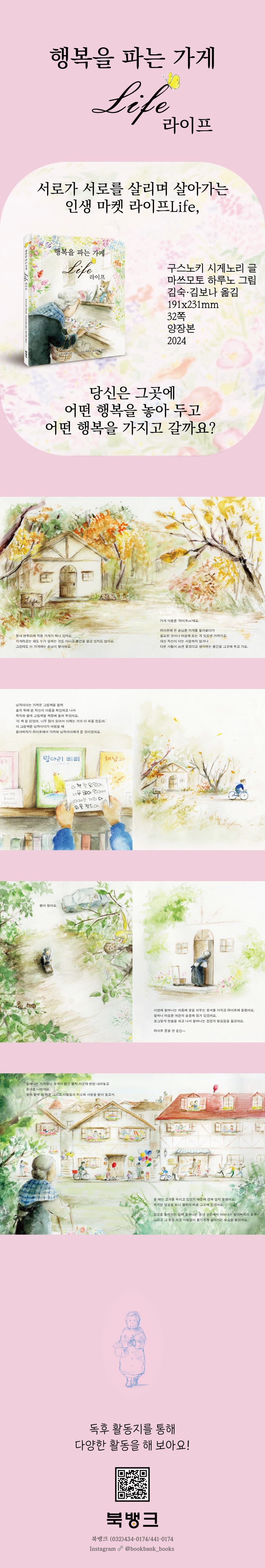 우리 동네에도 우리 마음에도 찾아옵니다. 라이프Life는 사람을 살리고 지구를 살리며 공생하는 아름다운 인생 마켓입니다! 동네 변두리에 '라이프'라고 하는 작은 가게가 있습니다. 사람들은 ‘라이프’에 와서 뭔가를 두고, 또 뭔가를 가지고 돌아갑니다. 할머니가 두고 간 꽃씨, 남자아이의 그림책, 부부의 컵 세트, 젊은 커플의 편지지와 편지 봉투, 여자아이의 작아진 조끼 등, 마음을 담아 쓴 쪽지와 함께 두고 가는 물건들을 또 다른 누군가가 가져가고, 다시 쪽지를 남기면서 각각의 인생들은 서로 연결됩니다. 그렇게 다양한 사람들의 삶의 조각이 모이고 모여 함께 살아가는 현재를 만들어 갑니다. 이것이 바로 저자가 말하는 '인생'이란 '사람이 산다'는 것뿐만 아니라, 서로 관계를 맺으며 사는 것이겠지요. 슬픔에 빠진 할머니가 두고 간 꽃씨를 가져간 사람들이 꽃을 피운 화분과 편지를 '라이프'에 가져다 놓은 것처럼, 그리고 라이프에서 이를 발견한 할머니가 감사와 함께 행복을 되찾는 것처럼, '라이프'를 찾는 사람들은 서로를 살리면서 살아가고 있습니다. |