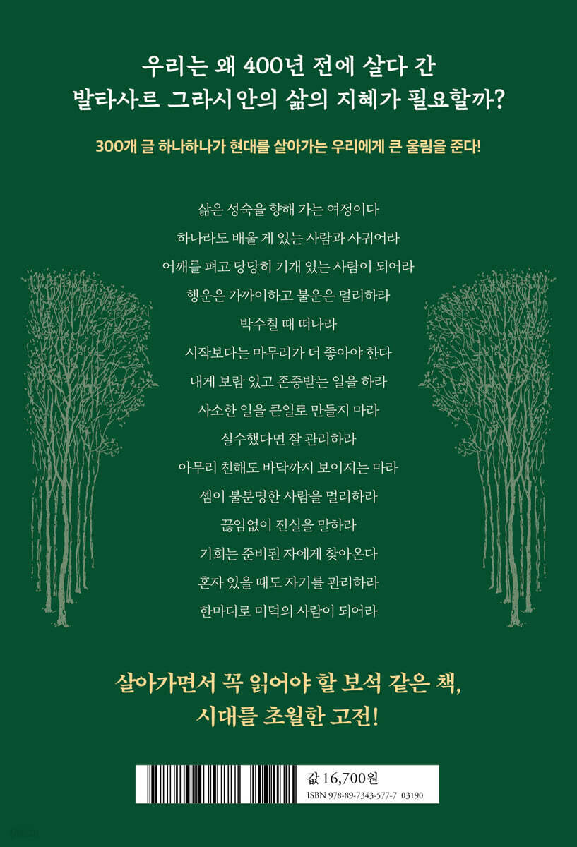 01 오늘날 자기 성숙을 이룬다는 것 02 기질과 재능의 조화 03 네 카드를 다 보여주지 마라 04 지식의 등불을 켜고 용기 있게 내디뎌라 05 따라오게 하라. 매달리지 말고 06 삶은 성숙을 향해 가는 여정이다 07 우쭐대지 마라. 특히 상사 앞에서 08 충동을 다스려라 09 자기 결함에서 맴돌지 마라 10 명성과 행운 11 하나라도 배울 게 있는 사람과 사귀어라 12 기질을 갈고닦아 기교로 만들어라 13 노출과 은폐를 병행하라 14 실체와 속성 15 나보다 뛰어난 이를 곁에 두어라 16 지식을 늘리며 선한 의도를 더해 가라 17 가끔 행동방식을 바꿔보라 18 능력과 적응력 19 처음부터 너무 큰 기대감은 주지 마라 20 때에 맞춰 움직여라 21 행운의 규칙 22 재치 있게 말하려면 23 결점이 부끄러운 것은 아니지만 24 상상력을 조절하라 25 상대를 알아차리는 법 26 사람을 움직이려면 27 선택과 집중 28 환호에 취하지 마라 29 어깨를 펴고 당당히 기개 있는 사람이 되어라 30 경솔한 모임에 휩쓸리지 마라 31 행운은 가까이하고 불운은 멀리하라 32 호평이 곧 특권이다 33 거절하는 기술 34 장점을 정확히 알아라 35 무엇이 중요한가 36 인생의 흐름을 타라 37 비판을 새겨듣고 어떻게 활용할지 생각하라 38 박수칠 때 떠나라 39 열매도 맺히는 때가 있다 40 의도만큼은 항상 선하게 가져라 41 지나친 과장은 금물 42 리더십도 자연스럽게 자신과 맞아야 한다 43 관점은 독특하게, 표출은 대중적으로 44 사람들을 독해하라 45 재치있게 하되 마구 써먹지는 마라 46 반감을 품기보다는 공감을 하라 47 쓸데없이 명예훼손에 엮이지 마라 48 실속이 있어야 한다 49 본질을 보고 판단하라 50 너 자신을 존중하라 2장 언제나 시작보다 마무리를 좋게 하라 51 인생이란 선택이 모인 것이다 52 언제나 평정심을 잃지 마라 53 천천히 서둘러라 54 용기가 있어야만 55 너 자신을 먼저 다스려라 56 아이들처럼 해맑게, 그래야 직관의 힘이 있다 57 달구어졌을 때 두드린다 58 능력을 상황만큼만 내보여라 59 시작보다는 마무리가 더 좋아야 한다 60 매사를 공정하게, 또 공정하게 61 자신만의 탁월성을 갖춰라 62 최적의 도구를 활용하라 63 사람들은 나중에 더 나은 것보다 맨 처음 것을 더 기억한다 64 가십거리가 되지 마라 65 기왕이면 고상한 취향을 들여라 66 수단은 목표에 맞춰야 한다 67 내게 보람 있고 존중받는 일을 하라 68 기억력에 이해력을 보완하라 69 저열한 자극에 반응하지 마라 70 거절에도 때가 있다 71 오락가락하지 마라 72 결단했으면 단호하게 움직여라 73 빠져나오는 법을 알아두라 74 폭넓게 사귀어라 75 앞선 자를 본받되 넘어서라 76 가벼이 처신하지 마라 77 누구에게나 어디서나 적응은 할 수 있어야 한다 78 대담하되 무모하지는 마라 79 힘겨워도 유쾌하게 풀어나가라 80 눈과 귀는 거짓도 들어오는 문 81 질리지 않게 달리 표현해보라 82 미덕의 황금률 83 부족해도 괜찮다. 그 대신… 84 적보다 간신이 더 위험하다 85 능력이 있다고 너무 드러내지 마라 86 사소한 문제를 키우지 않으려면 87 지성인이 되고 싶으면 자기주도적 학습을 하라 88 큰 그림을 그려라 89 자신을 활용하라 90 인생은 짧으나 자취는 영원하다 91 허점을 보이지 마라 92 센스와 지혜 93 대우주와 소우주 94 누구에게나 미지의 매력은 남겨둬야 한다 95 상대를 기대감으로 설레게 하라 96 인간을 인간답게 만드는 것은 97 세평이 곧 명예다 98 진짜 의도는 덮어두고 인정욕구를 이용하라 99 실제와 현실 100 사람 사는 이치를 터득하라 3장 자신의 호감도를 높이는 요령 101 아무리 잘해도 싫어하는 사람이 있게 마련이다 102 그릇을 키워라 103 자기다움의 존엄성을 지녀라 104 사람을 관리하는 기술 105 간결하게, 더 간결하게 106 지위를 과시하지 마라. 질투를 유발한다 107 자족은 하되 자만은 하지 마라 108 공존의 기술은 다양한 상호작용에서 나온다 109 비난거리만 찾으려 하지 마라 110 남겨지기보다 먼저 떠나라 111 우정도 개발하는 것이다 112 첫인상부터 호감을 사라 113 댐은 미리 만드는 것이다 114 일부러 적을 만들지는 마라 115 측근의 약점도 알고는 있어야 한다 116 명예를 중시하는 사람과 가깝게 지내라 117 자신에 대한 말은 될 수 있으면 삼가라 118 공손하다는 평판을 들어라 119 반감을 불러일으키지는 마라 120 실용적으로 살려면 121 사소한 일을 큰일로 만들지 마라 122 분별 있는 행동으로 경외감이 일어난다 123 너무 가식적으로 보이지 않게 하라 124 어디서든 필요한 사람이 되어라 125 다른 사람의 허물을 캐고 다니지 마라 126 실수했다면 잘 관리하라 127 펄떡이는 물고기처럼 활기차게 128 높고 넓고 깊게 멀리 보라 129 하소연할 시간에 자립하라 130 행동으로 말하라 131 내 감정의 주인이 되어라 132 습관처럼 한 번 더 숙고하라 133 잘 어울리는 것이 품격이다 134 재주를 두 배로 늘려라 135 반대를 위한 반대는 하지 마라 136 어떤 일도 요점을 파악하면 해답이 나온다 137 자기 자신에게 좋은 의지처가 되어라 138 때로는 내버려두어야 한다 139 컨디션을 잘 조절하라 140 취향을 잘 들여라, 행운이 깃들도록 141 자아도취에 빠지지 마라 142 잘못했으면 바꿔야지 고집부리지 마라 143 극과 극으로 모순되지는 마라 144 전투에서 양