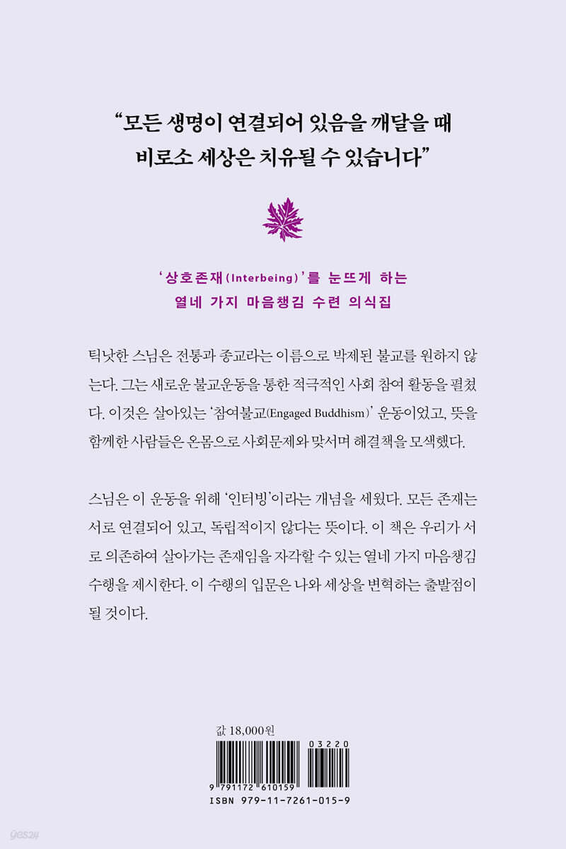 --- p.27 접현종의 14가지 마음챙김 수행법은 마음을 챙기면서 살아가기를 원하는 모든 사람을 위한 지침이다. 우리는 윤리적인 마음챙김의 생활을 통해 평화와 고요함을 길러서, 이 사회가 탐욕과 소비주의에 기반한 사회로부터 사려 깊고 자비로운 행동이 가장 가치 있는 사회로 전환하도록 도울 수 있다. --- p.32 한자에는 참여불교(Engaged Buddhism)에 해당하는 분명한 용어가 없지만 인세불교(人世佛?)라는 표현은 있는데, 이는 ‘세계나 사회 속의 불교’를 의미한다. 이는 참여불교와 같다. 1930년부터 베트남에서는 불교를, 사람들의 일상과 더 관련이 있고 일상에 응답하는 불교로 만드는 운동이 시작되었다. --- p.47 접현종의 종원은 14가지 마음챙김 수행법을 지키고 행하기로 약속한다. 우리는 그것들이 금계(禁戒)가 아니라 수행이라고 생각해서, 계율보다는 마음챙김 수행법이라고 부른다. 그것들은 우리의 자유를 제한하지 않고 우리를 보호한다. 그것들은 우리의 자유를 보장하고 우리가 난관이나 혼란에 빠지는 것을 막아준다. --- p.52 14가지 마음챙김 수행법은 1966년 베트남의 불바다에서 탄생했다. 전황은 매우 뜨거웠다. 그리고 광신주의의 불길이 얼마나 뜨겁게 타올랐는지 우리는 잘 알고 있다. --- p.64 우리는 아이들을 이해하기 위해 개방적이어야 하고, 우리의 견해나 신념을 아이들에게 무조건 강요하는 것을 자제해야 한다. 같은 나무에서 나왔다고 해도, 꽃들은 뿌리, 잎, 잔가지와 같지 않다. 우리는 꽃은 꽃이 되도록, 잎은 잎이 되도록, 잔가지는 잔가지가 되도록 해서, 제각각 계발을 위한 최고의 능력을 실현할 수 있도록 해야 한다. --- p.76 1975년 베트남 전쟁이 끝난 후 많은 베트남인이 타이만을 건너 말레이시아와 싱가포르에 도달하기 위해 보트에 올라탔다. 그 보트들은 종종 과적이거나 항해에 부적합했다. 많은 배들이 해적들의 공격을 받았고, 난민들은 강탈당했고 강간당했다. 12살 소녀의 강간과 자살, 소녀의 부친을 바다에 빠트려 죽인 사건을 들었을 때, 나의 첫 반응은 분노였다. 하지만 깊이 들여다보니, 내가 이 해적들처럼 타이 연안을 따라 같은 환경에서 태어나고 자랐더라면 지금의 나는 해적이 되었을 것임을 깨달았다. 다양한 상호의존적 원인이 이 해적을 만들어냈다. 해적이 된 책임은 해적 자신이나 가족에게만 있는 것이 아니라 사회 전체에 있다. --- p.90 부처님은 우리에게 마음챙김 수행을 권하시며 지금 이 순간에 일어나는 일을 돌이켜보고 온전히 존재하면서, 생각으로 산란하게 되지 않고 과거에 대한 후회, 미래에 대한 걱정, 현재의 갈망, 분노, 질투에 휩쓸리지 않도록 도와주셨다. 마음챙김 덕분에 우리는 우리 내면과 주변에 있는 경이롭고 신선하며 치유적인 요소와 접할 수 있고 기쁨, 평화, 사랑, 이해의 씨앗을 키울 수 있다. --- p.96 우리는 다른 사람들이 행복해지는 것을 돕고 싶어 하면서도, 자신의 일상적인 문제에 너무 빠져 있다. 아프거나 배고픈 아이들의 생명을 구하는 데 알약 하나나 소량의 쌀로 충분한 경우가 종종 있지만, 우리는 도울 시간이 없다고 생각할 수도 있다. 많은 나라에서 가난한 어린이에게 점심과 저녁 식사를 제공하는 데 드는 비용은 고작 20센트이다. 이처럼 사람들을 돕기 위해 우리가 할 수 있는 간단한 일은 많다. 바쁜 라이프스타일이 우리 행동을 방해하도록 해서는 안 된다. --- p.122 우리는 이 마음챙김 수행법이 어떻게 인구, 기아, 경제 발전 문제와 직접 관련되어 있는지 알 수 있다. 2천 년 이상 스리랑카, 미얀마, 태국, 라오스, 캄보디아, 중국, 베트남, 한국, 티베트, 몽골과 같은 국가에 불교 승려들이 존재함으로써, 세계 인구 감소에 크게 기여해 왔다. --- p.133~134 원리상 출가자와 재가 수행자를 구분하는 장애물이나 장벽은 없다. 왜냐하면 우리 모두의 염원은 불교를 세상에 가져오고 이를 함께 수행하여 불교를 어떤 상황에서도 적용할 수 있는 하나의 현실로 만드는 것이기 때문이다. 세상에는 법사가 정말로 필요하다. 비구와 비구니들도 세상에 나가 가르치고 있지만, 출가자 법사들의 수는 그 수요를 충족시키기에 부족해서 더 많은 재가자 법사가 필요하다. --- p.160 |