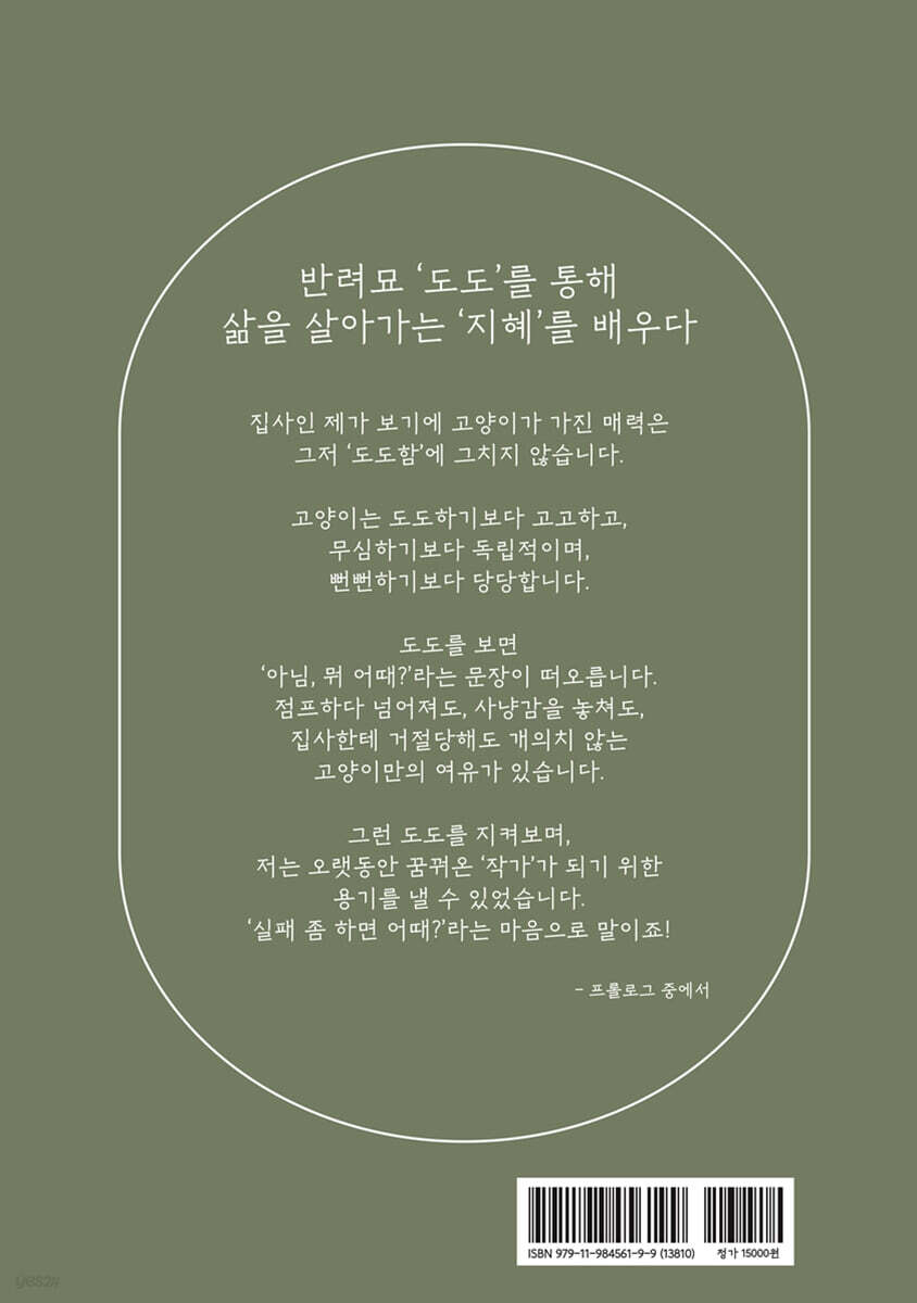 --- p.16 「연민은 우울을 이긴다」중에서 사뭇 들뜬 마음을 다스리며 결연한 다짐을 되뇌는 순간, 도도가 갑자기 내게로 달려왔다. 그러더니 내 오른 손등에 ‘콩’하고 머리를 박았다. 이건 분명 고양이가 나한테 보내는 ‘사인’이다! --- p.29 「묘연을 막을 길은 없다」중에서 “아쉽지만 개 같은 고양이는 없어요. 원래 고양이는 까칠하고 도도하고 싹수없는 게 정상이에요. 그러니 너무 실망하지 마세요.” --- p.60 「개 같은 고양이는 없다」중에서 처음에는 정말 속았다고 생각했어. 맨날 당당하게 사고치는 너를 보면서 ‘고양이는 왜 이렇게 싹수가 없어?’라는 말을 달고 살았는데 어느새 너도나도 ‘함께 사는 것’이 뭔지 자연스럽게 배우게 된 것 같아. --- p.97 「집사의 편지2」중에서 성묘는 보통 5-6kg 정도가 적당하다고 알려져 있으나, 도도는 4kg을 겨우 넘을 뿐이다. 그런데 체구에 비해서 하는 행동과 판단력은 꽤 뛰어나다. 특히, 상황에 따라 행동 뿐 아니라 목소리와 표정도 바꿀 줄 안다. 난 그것을 도도의 ‘페르소나’라 부르고 있다. --- p.108 「고양이 페르소나」중에서 그릉그릉. 기분이 좋은지 눈을 감고 골골송을 부르며 귀를 팔락였다. 도도의 앞발 하나를 슬쩍 잡았다. 도도는 꼬리로 바닥을 탁탁 치면서도 싫지는 않은지 빼지는 않았다. --- p.162 「네가 있어서 다행이야」중에서 |