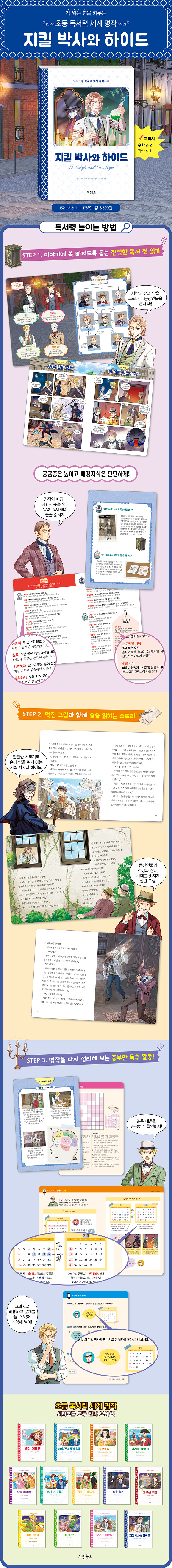 1. 문해력, 어휘력을 키워 주는 글과 시대를 잘 살린 그림으로 지킬 박사와 하이드를 읽어요! 책에 나오는 중요한 어휘를 따로 정리해 문장의 의미를 쉽게 파악하고, 문해력과 독해력을 기르는 명작 동화예요. 동화를 읽기 전에 등장인물의 성격, 행동, 감정을 나타내는 단어, 핵심 단어, 관용구 등을 미리 익혀 더욱 재미있게 책을 읽을 수 있어요. 또한 지킬 박사와 하이드의 이야기를 감정을 섬세하게 살린 그림으로 담아 명작의 깊은 감동을 느낄 수 있지요. 2. 내용의 이해를 돕는 풍성한 읽을거리로 독서에 대한 흥미를 더해요. 책의 앞부분에 등장인물 소개, 등장인물 관계도, 명작 예고편, 지킬 박사와 하이드의 배경, 지킬 박사의 집 살펴보기 등을 그림으로 담았어요. 책에 대한 흥미를 불러일으킬 뿐만 아니라, 배경지식도 쌓을 수 있어 더욱 집중해서 읽을 수 있어요. 3. 교과와 연계된 독후 활동으로 통합적으로 생각하고 독서력을 탄탄하게 길러요! 책의 뒷부분에는 명장면과 명대사, 지킬 박사와 하이드와 연관 검색어, 명작을 리뷰하는 쉬운 문제, 가로세로 낱말 퍼즐 등 다양한 독후 활동으로 책의 내용을 잘 읽었는지 점검할 수 있어요. 교과서 〈수학 2-2〉, 〈과학 4-1〉과 연계된 독후 활동과 ‘캐릭터와 논술 톡’을 통해 통합적으로 생각하고 논리력과 사고력을 키울 수 있어요. |
