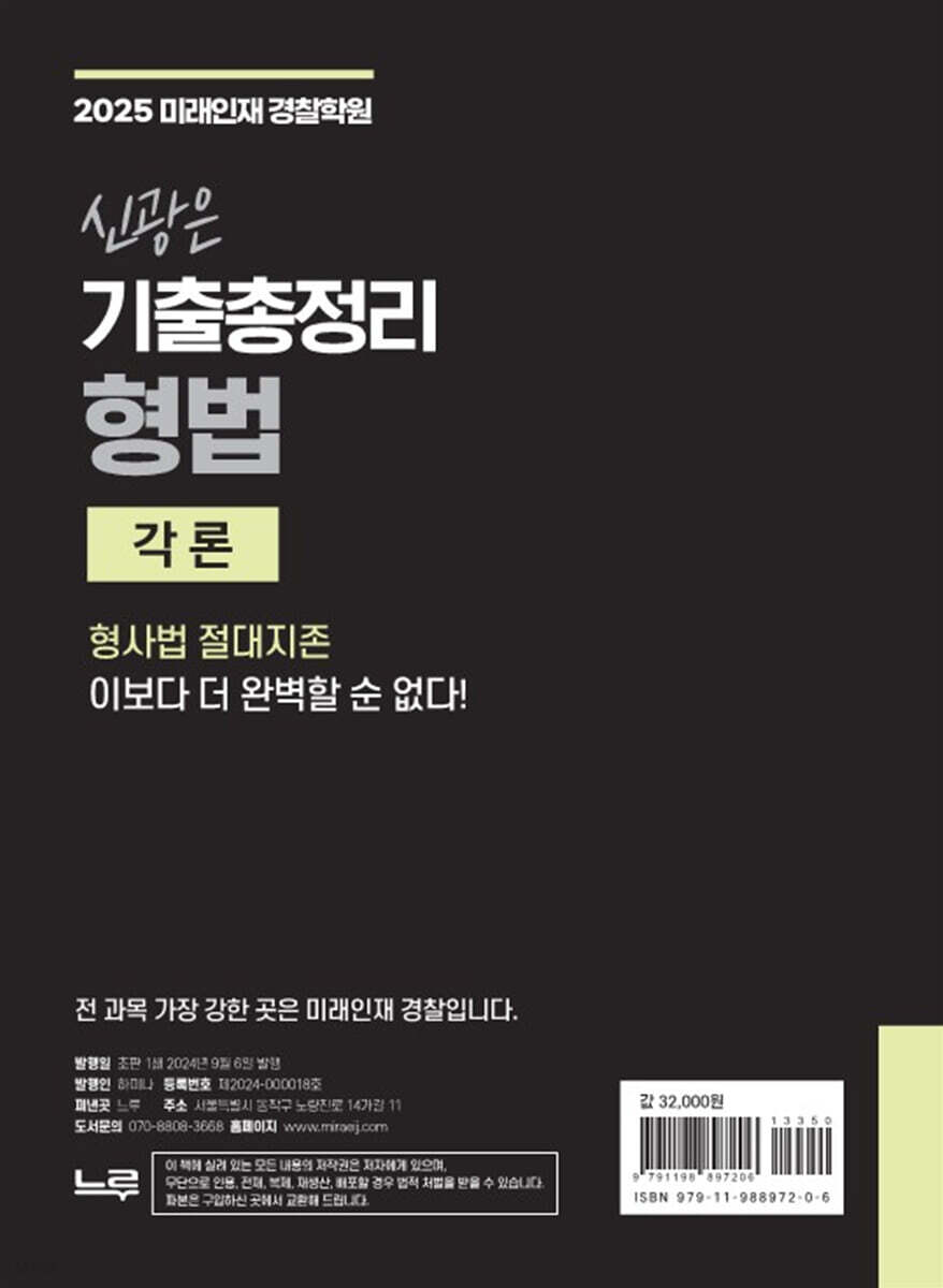 - 전 직렬 최근 기출문제, 최신판례, 최근 개정법령 및 개정규칙 완벽 반영 - 주제에 따른 진도별 단계별 문제를 통해 기본 이론과 판례를 학습 - 문제에 대한 정확한 이해를 돕기 위한 풍부하고 꼼꼼한 해설 - 출제가능한 모든 기출지문과 중요설문 빠짐없이 수록 머리말 “신광은 형법 각론 기출총정리”를 출간하면서... 그동안 과분한 애정과 아낌없는 관심으로 『신광은 형법 각론 기출총정리』 출간을 위해 기대와 응원을 해준 많은 수험생들에게 고마운 마음을 전합니다. 이미 출간되어 있는 『신광은 형법 기출 OX 선택형』에 대해서도 수험생들의 과분한 평가와 지지가 있었으나, 실전 문제와 같은 형식으로도 기출을 공부하고 싶다는 수험생들의 니즈를 고려하여 4지 선다형 기출문제집을 새로 출간하게 되었습니다. 다만, 실제 출제된 기출문제를 원문 그대로 수록하게 되면 기출문제집의 페이지가 너무 두꺼워지게 되고, 그렇다고 해서 일부 기출문제만 수록하면 중요한 기출문제들이 누락되는 피할 수 없는 문제점이 있다는 점, 그리고 양을 조절하기 위해서 기출문제를 선별해서 수록한다고 해도 기출문제가 누락되는 문제점 이외에도 쓸데없이 중복되는 설문들이 많게 될 뿐만 아니라 주제와 쟁점과 상관없이 문제가 구성되어 있기 때문에 학습효과가 떨어질 수 밖에 없는 점 등 본질적인 문제가 있습니다. 이러한 원문 형태의 기출문제집의 근본적인 문제점을 극복하기 위해서 『신광은 형법 각론 기출총정리』는 출제될 가능성이 있는 모든 기출문제들을 주제별로 다시 재구성하였습니다. 또한, 기출설문들을 빠짐없이 공부하는 것은 물론 중복되는 설문을 없애는 한편 수험생이 공부하고 있는 주제에 맞게 기출설문들을 공부할 수 있게 함으로써 기출문제 학습효과를 극대화하였습니다. 또한, 4지선다형 기출문제를 통한 공부가 쟁점에 관계없이 자칫 답을 찾는 공부 또는 눈에 익히는 공부가 될 수 있다는 문제점을 해결하기 위해 모든 기출설문을 쟁점에 맞게 재배치하여 문제를 풀다보면 자연스럽게 쟁점이 이해되고 부족한 부분이 보완이 되는 실질적인 학습이 될 수 있도록 구성하였습니다. 아울러 기출문제의 효과적인 구성뿐만 아니라 보다 충실한 해설을 통해 수험생들이 문제를 풀면서 충분히 이해하고 학습할 수 있도록 하기 위해 노력했습니다. 본서에 수록된 기출문제는 처음부터 끝까지 필자가 직접 기출문제를 풀어보며 설문을 분석, 재구성하고 설문에 맞는 적절한 해설을 추가하는 등 학습효과 극대화를 위해 상당한 시간과 노력을 기울였음을 말씀드립니다. |