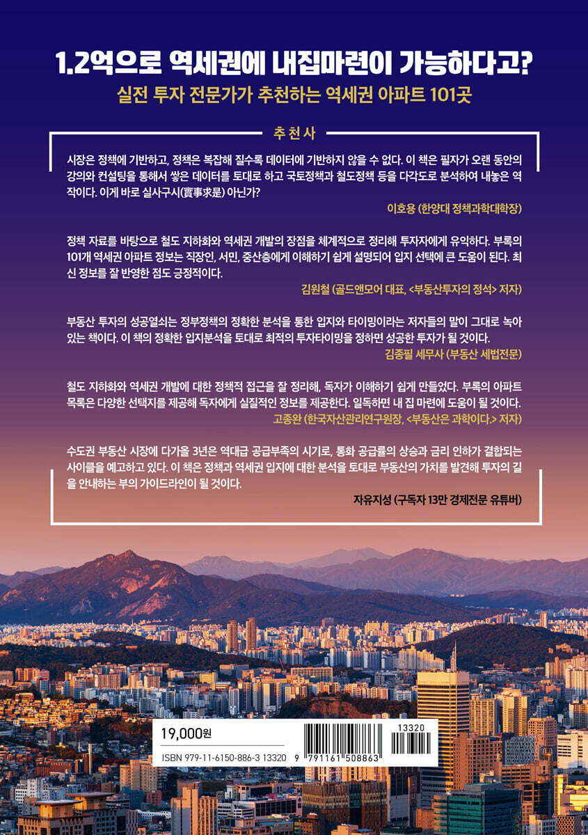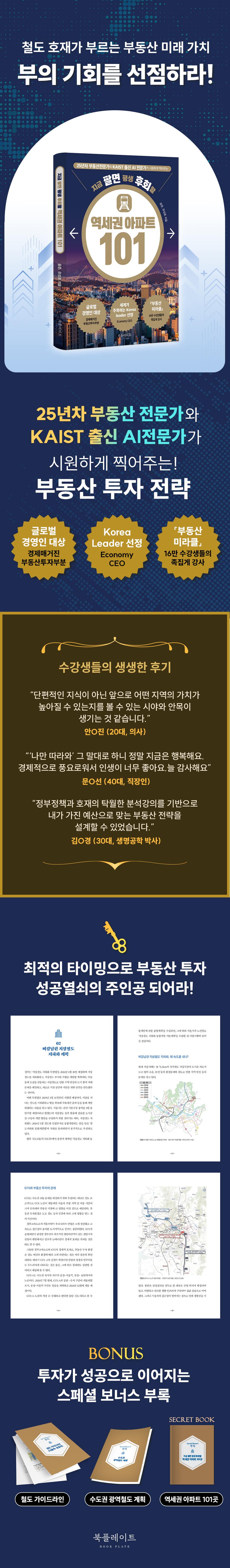 · 지상철도 지하화로 변화하는 서울, 수도권 부동산 투자지도 · 비강남권 지상철도 지하화 계획 · 서울역, 영등포, 구로, 상계, 광운대, 수색, 경부선, 경의선, 경인선 지하화를 집중하라 · 철도 호재, 언제 부동산에 가장 크게 영향을 미칠까? · 우리 동네에도 GTX가… 수도권 출퇴근 30분 시대 열린다?! · GTX 2기 개막 속도 낸다 제2장 앞으로 10년간 10배 오를 수밖에 없는 지상철도 지하화 호재 · 지상철도 지하화 법안의 탄생 · 서울역 주변 확 바뀐다 · 준공업지, 준주거지로의 탈바꿈, 영등포 재개발, 재건축 · 공업단지에서 직주락(職住樂)으로 새롭게 태어나는 구로 제3장 앞으로 10년 안에 5배 오를 철도 호재 · 용산(KTX, 경의중앙선, 1호선, 신분당선, 4호선) · 상계, 광운대 역세권(GTX-B, 지상철도 지하화, 창동차량사업소) · 수원(경부선, GTX-C, 1호선, 수인분당선) · 광명(경부선, 신안산선, 월판선, 1호선) · 수색(지상철도 지하화) · 인덕원(GTX-C, 월판선, 동탄인덕원선, 4호선) · 앞으로 생길 신안산선 노선 서울 지하철 10호선으로 불리는 이유? · 경기도 철도 시대를 통한 새로운 기회 도래 · 경기도의 1기 신도시 선도 예정 지구는 토지거래허가구역으로 지정 · 앞으로 생길 KTX 노선 2개, 인천 송도역 더블 역세권 되는 이유? 제4장 앞으로 5년 안에 부동산 가치의 패러다임이 바뀐다 · 공부하는 개미가 슈퍼 리치가 된다 · 부동산 투자는 이렇게 따라하면 무조건 대박 난다 · 투자자는 왜 호재를 공부하는가 · 시장을 읽는 힘을 키워라 · 다가올 지방자치단체선거, 대선, 총선을 대비하라 [부록] 스페셜 보너스 1. 철도 부지 복합개발 가이드라인(2023. 12) 2. 수도권 광역철도 계획 [별책부록] 스페셜 보너스 1. 지금 팔면 평생 후회할 역세권 아파트 101곳 |