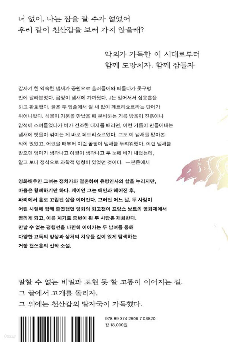 --- p.12 갑자기 한 익숙한 냄새가 공원으로 흘러들어와 떠돌다가 콧구멍 안에 달라붙었다. 곰팡이 냄새에 가까웠다. J는 일어서서 심호흡을 하고 환호했다. 붉은 두 입술에서 쉴 새 없이 페트리쇼르라는 단어가 튀어나왔다. 그가 고개를 가로저으며 무슨 말인지 모르겠다고 하자 J가 그의 손바닥에 페트리쇼르라고 써 주었다. 그는 휴대폰에 단어를 입력하면서 몇 번 실패한 후에 결국 정확한 철자를 찾았다. 페트리쇼르였다. 이 단어에 해당하는 중국어를 그는 들어본 적이 없었다. 식물이 가뭄을 만났을 때 분비하는 기름방울이 진흙이나 암석에 스며들었다가 비가 건조한 대지를 때리면, 이런 기름이 만들어내는 냄새에 빗물이 섞이는 게 바로 페트리쇼르였다. 사실은 그도 이 냄새를 맡아본 적이 있었고, 어렸을 때부터 이런 곰팡이 냄새를 두려워했다. --- p.14 그와 그녀는 좁은 침대에 함께 누웠다. 어려서부터 함께 잘 때, 두 사람에겐 신기한 묵계가 있어서 몸을 뒤집거나 이리저리 뒤척이고 웅크리면서도 몸이 전혀 접촉하지 않았다. 그래도 불편하지 않았다. 냄새와 코 고는 소리, 수면 자세 등 모든 게 익숙했다. 그렇다고 아주 편하기만 한 건 아니었다. 필경 아주 오래 만나지 못했고, 입밖에 내지 못한 말이 너무도 많았기 때문이리라. --- p.20 그는 어려서부터 잠자리 친구였다. 처음 만나자마자 같이 잤다. 처음 만난 날부터 아주 달콤한 잠을 잤다. 처음 만난 순간부터 그녀는 그를 사랑했다. 처음 만났을 때의 잠자리 기억이 너무나 감미로워서 머릿속에 거대한 사탕수수밭이 자랐다. 아플 때마다 그걸 잘라 한입 야무지게 씹어 먹었다. 그러면 미소 짓는 입가에 당즙이 흘러내렸다. 그녀는 잠이 오지 않을 때마다 그가 필요했다. 그가 너무도 그립고 보고 싶었다. 그녀는 그 이유를 설명할 수가 없었다. 어쨌든 그가 옆에 있어야 적어도 여덟 시간 동안은 깊은 잠에 빠질 수 있었다. 깊이 잠들어 깨지 않았다. --- p.25 말해요. 나는 들을 테니까. 그의 입은 깊은 바다였다. 대답을 건지는 건 물고기를 잡는 것만큼이나 어려웠다. 하지만 그 바다는 상대의 모든 말을 받아들였다. 말없이 넉넉하게 전부 다. 그리고 상대의 모든 비밀을 지켜주었다. --- p.34 지난번 여행에서는 수많은 명품을 샀다. 남편은 그걸 보고서 고개를 가로저었다. “이걸 다 쓸 생각이야?” 쓴다고? 쓴다는 게 뭔가? 푸른 꽃양배추 두 개랑 오골계 한 마리를 여기 넣으면 이른바 실용적인 사용법인가? 노벨 문학상을 수상한 소설이나 공쿠르 수상작 문학 전집을 넣고 다니면 이것들을 ‘쓰는’ 것인가? 그녀는 이 명품들을 전부 텔레비전 프로그램에 가져가서 약간 과장된 부러움을 끌어낼 작정이었다. 그녀는 다들 진심이 아니라는 걸 잘 알았다. 하지만 그녀 자신도 진심을 내놓진 않을 것이다. 진심은 위험하고 깨지기 쉽기 때문이다. 그들은 촬영장의 허위처럼 서로 친절하게 호응할 뿐이다. --- p.43 그녀는 속으로 생각했다. 시인은 무슨 얼어 죽을. 나가 죽으라고 해. 대학 1학년의 밤에 돌아다닐 때 함께 있었던 건 의과 남학생이었다. 그는 시를 쓴다고, 자기가 시 동아리의 회장이라고 했다. 의사 가문 배경은 볼 필요도 없이, 돈이 아주 많은 집인 건 분명했다. 그렇다고 모리배의 속된 기질을 가진 애는 아니었다. 그는 나중에 의사이자 시인이 될 작정이었다. 두 손으로는 의술로 사람들을 구하고 동시에 시를 써서 노벨문학상을 받는 게 꿈이었다. “나중에 노벨문학상 받으러 나랑 같이 오슬로에 가자. 자, 약속.” “오슬로? 그건 평화상 아니야? 문학상은 스톡…….” 그녀는 자신의 말을 삼켜 버렸다. 의사 시인의 두 눈이 분노로 이글거렸다. 그녀는 아주 일찍 알아차렸다. 의사 시인은 남에게 지적받기를 좋아하지 않는다는 사실을. --- p.152 남자아이의 품안에 있던 천산갑은 아이와 무척이나 친밀한 게 분명했다. 거리낌이 없어 보였다. 남자아이가 천산갑을 진흙탕에 놔 주었다. 천산갑은 진흙에 닿자마자 몸을 쭉 펴고 앞발로 흙을 파면서 코로 뭔가를 탐색하기 시작했다. 그런 다음 몸 전체가 진흙 속에 들어가 꿈틀댔다. 뾰족한 꼬리가 더 많은 진흙을 갈아올렸다. 몸의 모든 비늘에 전부 진흙이 묻었다. 남자아이는 웃으면서 덩달아 진흙 속으로 들어갔다. 달빛이 나뭇가지를 들어 올려 진흙 속의 남자아이와 천산갑을 비춰 주었다. 감독도 웃었다. 감독은 처음으로 달빛이 인공 조명보다 밝을 수 있다는 사실을 깨달았다. 남자아이와 천산갑은 진흙탕 속에서 신이 나서 움직였다. 빗소리가 있고 지진이 있었다. 해일과 새 울음, 표범의 포효도 있었다. 웃음이 언어를 대신했다. 가장 혼탁하면서 가장 순정한 언어였다. --- p.169 장하이타오와 결혼한 뒤에 시어머니 댁에 설을 쇠러 갔다. 남편이 쓰던 방에 들어서자마자 천산갑이 보였다. 남편은 이것이 신혼인 아내를 기쁘게 하는 방법이라고 생각했다. 하지만 그녀는 그 방이 귀신 붙은 방처럼 느껴졌다. 벽에는 그녀가 어렸을 때 찍었던 매트리스 광고 포스터가 잔뜩 붙어 있었다. 가장 큰 것은 영화 포스터였다. 침대를 정면으로 마주하고 그녀와 그가 천산갑을 안은 채 잠들어 있고, 옆에는 잠들