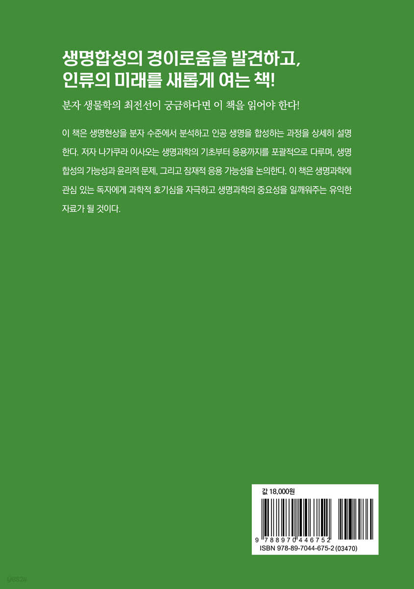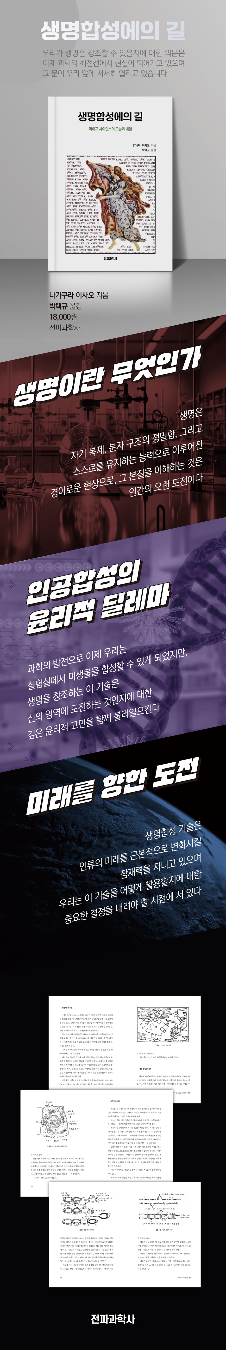 제1장 생명이란 무엇인가 인공생명의 가능성 | 17 생명의 세 조건 | 18 가장 정밀한 기계 | 19 생명의 원천 발견 | 22 지령의 원천 | 25 세포주식회사 | 27 보조역할 사원의 2 계급 승진 | 28 생명현상의 주역은 | 29 신비가 풀렸다 | 31 생명이 있는 무생물의 생활방식 | 33 제2장 생명의 합성은 어디까지 왔는가 인공이란 | 39 지상 최소의 생명 | 41 시험관 내의 생명구조 | 43 별거벗은 생명 | 45 바이러스 아재비 | 48 바이러스의 옷짓기 | 49 옷을 입힌다 | 51 빌린 것과 손수 만든 것의 차이 | 54 제3장 유전자의 합성 코라나 박사의 성과 | 59 목적은 전달자 | 60 두 가지 어려움 | 62 사슬의 바람기를 막는다 | 65 조금 빌린 자연의 손길 | 68 분명히 진짜인가? | 72 코라나 팀의 새로운 도전 | 73 전달자의 표지를 바꾼다 | 77 지령소의 소재 | 79 유전자합성의 의의 | 81 기묘한 대응 | 82 또 다른 장애 | 85 제4장 단백 질의 합성 사이토크로뮴 시의 합성 | 91 다른 열쇠라도 문은 열린다 | 94 구조결정의 열쇠 | 98 확실한 고전방식 | 102 품도 시간도 필요없는 ‘고상법’ | 103 어딘가가 빠졌다 | 106 진짜 열쇠와 가짜 열쇠 | 107 뒤집힌 상식 | 109 전화위복 | 113 초능력효소 | 115 제5장 리보솜의 자기형성 극비의 ‘거대기계’ | 119 오뚝이와 메신저 | 121 DNA의 ‘권한이양’ | 123 스스로 판단하는 부품 | 126 부품을 섞기만 하면 | 128 얻은 ‘머리’의 지도 | 131 ‘몸통’의 수수께끼 풀이 | 135 그럼 정답은? | 138 제6장 바이러스의 합성 효소와 ‘씨앗’ | 143 DNA 바이러스인가, RNA 바이러스인가 | 145 뒷걸음치는 이유 | 147 목표는 ‘리보솜급’ 제패 | 148 기묘한 모습을 한 T4 파지 | 150 미시세계의 전격전쟁 | 152 파지의 안전장치 | 155 제멋대로 조립하는 편이 손쉽다? | 158 꿈이 아닌 자동합성장치 | 159 제7장 막의 구조와 합성 고등한 간막이 | 165 수수께끼가 가득 | 167 막투성이 | 172 인공 ‘흑막’ | 175 단위막설 | 178 입자막 만들기 | 181 절충안도 | 184 회전 도어 | 185 인공막의 재주 | 190 초점은 장래에 | 192 제8장 세포의 인공합성 매력있는 과제 | 197 화성에 보내는 새로운 생물 | 198 아메바의 수술 | 200 흔들리는 ‘핵의 지배’ | 203 아직도 메워지지 않는 큰 간극 | 205 순수한 달성률은 1% | 207 과학과 SF 사이 | 209 너무 고등한 대장균 | 210 생략할 수 없는 것 | 213 먹이와 막 | 215 분자증식 기계 | 218 ‘적재적소’ | 221 엄청난 기계 | 223 부품 교환법 | 224 마이코 플라스마 | 226 46억년을 좇아서 | 228 제9장 자연이 완수한 생명합성 생명의 기원과 우주의 끝 | 233 우주는 생명의 원료가 가득찼다 | 236 원시지구의 재현 | 238 생명은 우연히 태어나지 않는다 | 241 어쩐지 ‘있음직한’ 이야기 | 242 생명에의 물질진화는 어느때 단번에 일어났다 | 244 자기증식하는 물질 | 246 오파린의 코아세르베이트 | 249 원시세포 ‘마이크로스피어’ | 250 ‘살아 있는 연못’ 설 | 252 핵산이 없는 생물 | 254 L형의 수수께끼 | 256 제10장 생명합성의 효용 ‘합성’의 덕 | 263 더욱더 솟아나는 호기심 | 265 유전자공학이 빛을 밝힐까 | 266 지령서를 들여보내는 바이러스 | 269 유전자 구실을 하는 바이러스 | 272 제11장 위험성을 생각한다 주류가 된 ‘기계론’ | 277 감시를 ‘중단’했기 때문에 일어난 비극 | 278 완전한 봉쇄책은 없다 | 281 두려운 징후 | 283 암바이러스를 사용하는 치료 | 286 선의로부터 생긴 위험 | 290 인류의 멸망과 초인간 | 293 생각할 수 있는 쐐기 | 295 후기 | 301 |