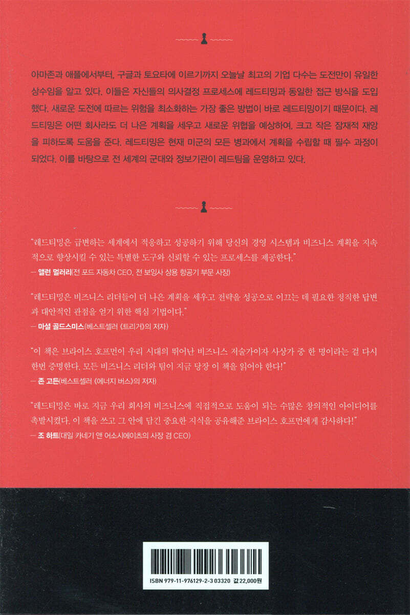 《레드팀을 만들어라》는 급변하는 세계에서 적응하고 성공하기 위해 당신의 경영 시스템과 비즈니스 계획을 지속적으로 향상시킬 수 있는 특별한 도구와 신뢰할 수 있는 프로세스를 제공한다. - 앨런 멀러리 (전 포드 자동차 CEO, 전 보잉사 상용 항공기 부문 사장)