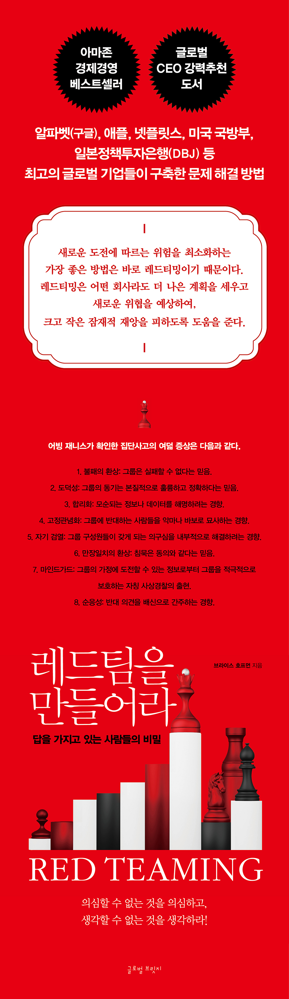 브라이스 호프먼의 《미국의 상징American Icon》은 지금까지 발간된 가장 중요한 비즈니스 서적 중 하나다. 《레드팀을 만들어라》는 그가 우리 시대의 뛰어난 비즈니스 저술가이자 사상가 중 한 명이라는 걸 다시 한번 증명한다. 모든 비즈니스 리더와 팀이 지금 당장 이 책을 읽어야 한다! - 존 고든 (베스트셀러 《에너지 버스》의 저자)
