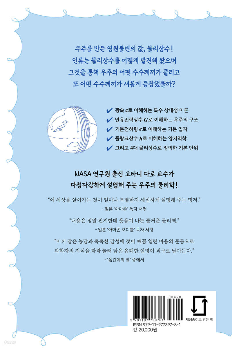 4대 물리상수 c, G, e, h를 설명함으로써 우주에 관한 지식을 모조리 이야기할 수 있다! 여러 물리상수 중에서도 언제 어디서나 항상 값이 일정한 물리상수를 ‘보편 상수’라고 부른다. 이 책의 주인공인 광속 c, 만유인력상수 G, 기본전하량 e, 플랑크상수 h는 모두 보편 상수다. 보편 상수는 우주가 어떻게 해서 지금과 같은 모습인지를 가르쳐 준다. 광속 c는 특수 상대성 이론을 이해하는 열쇠로, 물리 법칙이 언제 어디서나 똑같이 적용된다는 사실을 확인해 준다. 만유인력상수 G를 통해서는 시공간이 왜곡되는 우주의 구조를 이해할 수 있고, 기본전하량 e는 우주 만물을 이루고 있는 기본 입자에 관하여 다양한 사실을 알려 준다. 그리고 플랑크상수 h는 현대 사회를 떠받치는 모든 과학 기술의 근간이라 할 수 있는 양자역학을 만들어 냈다. 양자역학은 전자와 광자 등의 기본 입자를 비롯해 원자, 분자 등 미시적인 물체를 지배하는 물리 법칙인데, 미시 세계의 물리 법칙이 거시 세계와 다르다는 사실을 인류가 알아차리게 해 준 것이 바로 플랑크상수 h였다. 아울러 이들 보편 상수는 미터, 킬로그램, 초라는 세 가지 기본 단위를 정의하는 기준이다. 기본 단위란 다른 단위를 짜맞추는 바탕이 되는 단위로, 기본 단위들을 조합하면 다양한 물리량을 나타내는 단위들을 만들 수 있다. 특히 역학에 등장하는 단위는 모조리 만들어 낼 수 있다. 미터, 킬로그램, 초는 각각 길이, 질량, 시간이라는 세 가지 물리량을 나타낸다. 이 세 가지 기본 단위로 역학의 모든 단위를 만들 수 있다는 말은, 역학이 길이와 질량과 시간을 다루는 체계라는 뜻이다. 역학은 이 세계를 제법 광범위하게 설명할 수 있는 체계이므로 우리가 평소에 측정하거나 다루는 물리량 대부분이 길이와 질량과 시간이라는 물리량의 조합이라는 사실을 알 수 있다. 이렇듯 물리상수는 인류가 우주를 해석하고 설명하기 위해서 사용하는 키워드라 할 수 있다. 인류는 물리상수가 뜻하는 바를 알고자 이리저리 머리를 굴리고, 그 값을 측정하는 과정을 거치면서 비로소 우주가 어떻게 지금처럼 이루어졌는지 조금씩 이해하기 시작했다. 물론 그 과정이 순탄하지만은 않았다. 수많은 과학자의 도전과 시행착오가 있었고, 천재로 불리는 과학자들이 물리상수를 발견해 놓고도 정작 그 값이 의미하는 바를 몰라서 헤매기도 했다. 책 속에는 물리상수를 발견하고 우주의 법칙을 밝혀낸 과학자들의 이야기가 중간중간 등장하는데, 인간적이거나 괴팍한 면모를 보여 주는 천재 과학자들의 일화는 물리상수를 하나씩 알아 가는 여정에 재미를 더해 준다. 물리상수는 우리의 일상부터 우주 저편에 이르기까지, 세상 모든 현상을 지배하는 법칙에 관여하는 물리량들을 수치로 나타낸 것이다. 만약 우리 우주와는 다른 우주가 있어서 그곳에서도 생명이 발생해 지성을 기르고 있다면, 그들도 우리와 마찬가지로 c, G, e, h에 관해서 고찰하고 이 책과 같은 논의를 거쳐서, 이들 물리상수가 자신들의 우주를 그런 모습으로 구성하는 기초라는 결론을 내렸을 것이다. 그리고 그들의 보편 상수 c, G, e, h를 둘러싼 탐구 역시 때로는 어렵고 때로는 이치에 맞지 않아 보이겠지만, 그럼에도 감동적인 이야기를 써 나가고 있을 것이다. NASA 연구원 출신 고타니 다로 교수가 다정다감하게 설명해 주는 우주의 물리학! “이 세상을 살아가는 것이 얼마나 특별한지 세심하게 설명해 주는 명저.” - 일본 ‘아마존’ 독자 서평 “내용은 정말 진지한데 웃음이 나는 즐거운 물리책.” - 일본 ‘아마존 오디블’ 독자 서평 “미끼 같은 농담과 촉촉한 감성에 젖어 빼꼼 열린 마음의 문틈으로 과학자의 지식을 꽉꽉 눌러 담은 유쾌한 설명이 직구로 날아든다.” - ‘옮긴이의 말’ 중에서 『우주를 읽는 키워드, 물리상수 이야기』는 물리학을 잘 모르는 사람도 쉽고 재미있게 읽을 수 있는 대중 과학서다. 저자 고타니 다로 교수는 우주물리학을 전공하고 NASA 연구원을 거쳐 대학에서 학생들을 가르치고 있는데, 무엇보다 과학의 재미를 널리 알리는 일에 진심이다. 그런 만큼 대중에게 어렵거나 낯설게 느껴질 수 있는 물리학 용어를 일상의 언어로 세심하게 풀어썼다. 특히 재미있는 비유와 다감한 설명 방식은 물리학이 딱딱하고 지루할 거라는 선입견에 슬쩍슬쩍 균열을 내면서 어느 틈엔가 물리상수 c, G, e, h를 독자 가까이에 데려다 놓는다. 그렇기에 지금 물리를 공부하는 학생들은 물론이고 학창시절 우주를 동경했으나 딱딱한 교과서의 벽 앞에서 좌절했던 어른들에게도 이 책을 권한다. 책을 다 읽고 나면 물리상수 c, G, e, h는 우리의 학습 과정을 괴로운 암기로 채우기 위해 존재하는 악랄한 ‘빌런’이 아니라, 우리가 동경하는 우주의 모습을 자세히 그려 주는 다정한 ‘히어로’임을 알게 된다. |
