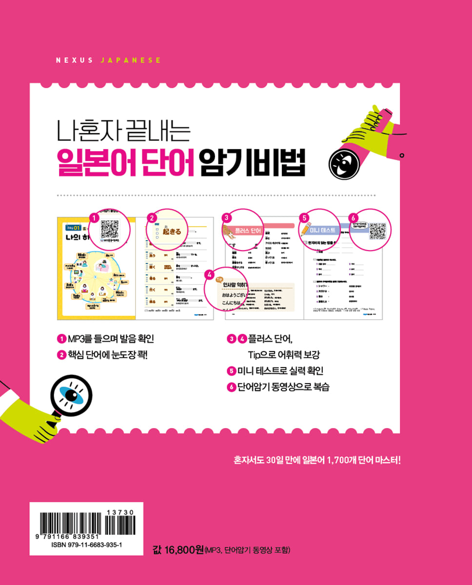 [1단계] MP3를 들으며 발음 확인 먼저 MP3를 듣고, 일본어 단어의 발음을 확인하세요. 스마트폰으로 QR코드를 스캔하면 MP3 파일을 바로 들을 수 있습니다. 넥서스 홈페이지에서도 MP3 파일을 무료로 다운받을 수 있습니다. [2단계] 핵심 단어에 눈도장 콱! 001~575의 번호가 붙어 있는 핵심 단어를 먼저 외우세요. 복습할 때는 한 손으로 단어 뜻을 가리고, 일본어만 보고서 뜻을 맞춰 보세요. 복습한 단어는 체크 박스에 V 표시를 하세요. [3단계] 예문 빈칸 채우기 핵심 단어를 2회 반복 암기한 다음에는 예문의 빈칸에 단어를 직접 써 보세요. 손으로 직접 써 보면 눈으로만 외우는 것보다 훨씬 기억에 오래 남습니다. 플러스 단어와 Tip로 어휘력 보강 핵심 단어를 외운 다음에 좀 더 난이도가 있는 단어에 도전해 보세요. 일상생활에서 활용도가 높은 단어들입니다. 미니 테스트로 실력 확인 문제를 풀면서 실력을 확인해 보세요. 단어암기 동영상으로 복습 세 번 봤는데도 단어가 잘 안 외워진다고요? 그렇다면 단어암기 동영상을 무한 반복해서 보세요. 깜빡이 학습법으로 단어를 자동암기할 수 있도록 도와줍니다. ★무료 다운 www.nexusbook.com |