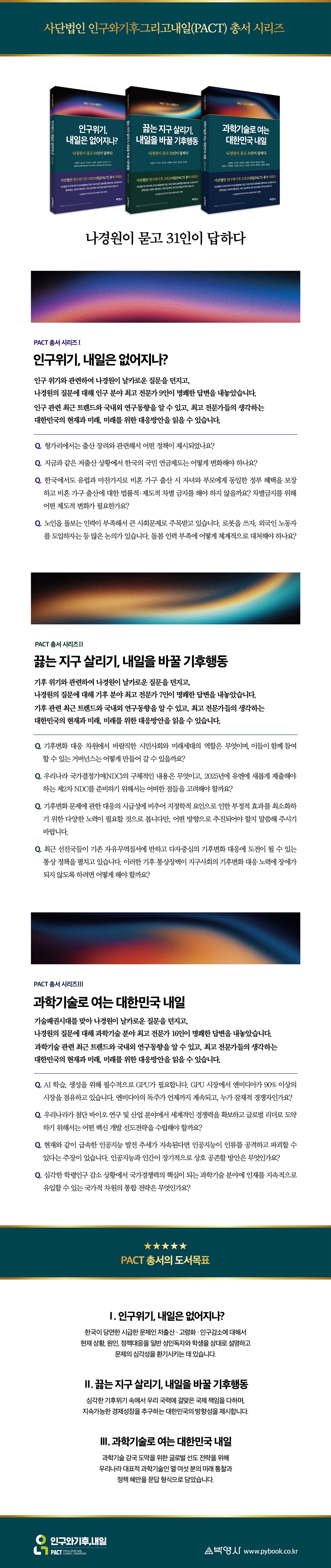 위기의 대한민국, 기회와 희망의 대한민국으로 대한민국이 직면한 인구와 기후위기 그리고 기술패권시대를 맞은 글로벌 경쟁의 격랑 속에서 내일의 생존과 지속 가능한 번영을 걱정하는 많은 분들과 뜻을 모아 사단법인 인구와기후그리고내일(PACT)이 출범한 지 1년이 되었습니다. PACT는 ‘인구’, ‘기후’, ‘과학기술’ 세 가지 주제와 관련하여 최고의 전문가들이 함께 정책대안을 연구, 개발하고 입법과 정책에 반영하는 비영리 최고 권위의 민간 싱크탱크를 지향해 나갈 것임을 선언하였습니다. 창립 이후 인구와 기후 그리고 과학기술의 미래 대응과 전략에 대한 8차례의 라운드테이블과 3차례의 포럼을 통하여 전문가들의 열띤 토론이 진행되었습니다. 이러한 결과를 토대로 31인의 전문가들이 PACT 창립 1주년에 맞춰 세 가지 주제에 관한 책자를 발간하기로 하고 지난 반년간의 집필 과정을 거쳐 드디어 세 권의 책을 동시에 발간하게 되었습니다. 책의 부제에서 알 수 있듯이 이사장인 제가 주제별 화두를 질문의 형태로 분야별 전문가에게 제시하였습니다. 인구 분야 9명, 기후 분야 7명, 과학기술 분야 16명의 전문가들이 다양한 주제들에 대하여 독자 누구나 쉽게 읽고 이해할 수 있도록 답을 내주었습니다. 미국에서는 전문가들로 구성된 헤리티지 재단과 같은 싱크탱크가 활발하게 입법, 정부 정책 과정에 참여하여 입법과 정책의 전문성과 타당성을 높이고 있습니다. 반면에 우리나라는 몇몇 국책 연구기관들을 제외하고는 비영리 민간법인의 형태로 제대로 된 싱크탱크를 찾기 어려운 안타까운 현실입니다. PACT는 이번 출간을 시작으로 입법, 정책 지향의 연구 성과물을 주기적으로 출간하여 우리 사회에 닥치는 여러 위기와 과제에 대한 진단과 해법을 제시해 나가고자 합니다. 세 가지 주제는 그 내용을 달리하지만 하나같이 대한민국의 오늘과 미래, 우리나라 국민 한 사람 한 사람의 삶과 직결된 사활적 이슈들입니다. 아울러 각 주제의 원인, 결과, 해법은 서로 긴밀하게 연결되어 있습니다. PACT가 한 가지 주제도 어려운데 세 가지 주제를 동시에 사단법인의 핵심 연구 분야로 야심차게 정한 이유이기도 합니다. 한정된 주제에 관한 연구 개발 대신 세 가지 주제를 상호 연결하여 종합적으로 다룸으로써 보다 체계적인 접근이 가능함을 향후 연구와 입법, 정책 대안 개발 활동을 통해 보여드리고자 합니다. 많은 사람들이 100년 후 대한민국의 존속과 인류 생존 터전인 지구의 지속성에 대해 의문을 표시하고 대응책 마련에 부심하고 있습니다. 사실 우리는 오늘의 대전환 없이 내일을 말할 수 없는 절박한 상황에 놓여 있습니다. 우리가 놓치고 있는 문제의 원인은 무엇이며, 원인에 대한 진단이 잘못되었다면 그 오진의 이유는 무엇인지 규명해 나가겠습니다. 천문학적인 투자에도 불구하고 왜 정책의 효과가 제한적인지, 그렇다면 어떤 패러다임의 전환이 필요한지 깊이 성찰하고 따져봐야 합니다. 우리가 겪고 있는 위기는 실존적 위기인 만큼 개개인의 자발적 결단뿐 아니라 세대와 세대, 개인과 사회간의 사회적 협약 체결, 바람직한 행동의 유인 등 여러 접근의 조화로운 배합이 필요합니다. 실존적 위기 상황이 임계점에 이르러 속수무책으로 파국을 맞이하지 않도록 하는 총체적 노력이 필요함을 우리 사회에 일깨우고 그 해결 방향과 전략을 연구해 나가고자 합니다. 국민 개개인은 보호받거나 혜택을 받는 수동적인 자세에서 벗어나 적극적으로 문제를 해결하는 주체로 나서는 국민 이니셔티브가 필요합니다. PACT는 이러한 국민의 주도적 참여를 함양하는 데도 각별한 관심을 갖도록 하겠습니다. 우리는 지난 수천 년의 역사를 통하여 숱한 위기를 극복하고 오늘에 이르렀습니다. 우리 국민은 지금의 위기를 가장 대한민국다운 방식으로 헤쳐나가고, 오히려 기회로 바꾸어 나갈 수 있는 뛰어난 역량을 가지고 있습니다. 이를 위하여 국가 차원에서 인구와 기후 위기, 과학기술 경쟁의 격랑에서 지금 대전환 없이는 내일 살아남을 수 없다는 절박한 심정으로 철저한 패러다임 혁신이 필요함을 다시 한 번 강조합니다. 끝으로 각 분야에서 연구와 강의 등으로 촌음을 아껴 쓰고 계신 여러 분야의 전문가분들께서 이번 저술에 기꺼이 시간을 내어주신 데 깊이 감사드립니다. 좌장으로서 책임 집필자의 역할을 맡아주신 인구 분야의 최인 교수님, 기후 분야의 신각수 전 외교부 차관님, 과학기술 분야의 신성철 전 KAIST 총장님께 특별한 감사를 드립니다. 여러 전문가가 함께 하는 책의 집필은 다양하고 폭넓은 지식을 집약할 수 있다는 장점에도 불구하고, 집필 방향과 내용 그리고 일정에 대한 세심한 조율이 필요합니다. 이러한 어려움에도 세 분 좌장께서 열정적으로 나서주셔서 처음 목표한 일정에 맞춰 모든 작업을 마무리할 수 있었습니다. 앞으로 PACT는 구체적이고 실천적인 대안을 연구하고 개발하는 일에 더욱 힘을 쏟고자 합니다. 대한민국이 지속가능한 공동체가 되고 G7을 넘어 G5로 진입하기 위해 정책 입안, 사회적 여론 환기, 국민 공감 확대, 후진 양성 등에도 노력할 것입니다. PACT는 22대 국