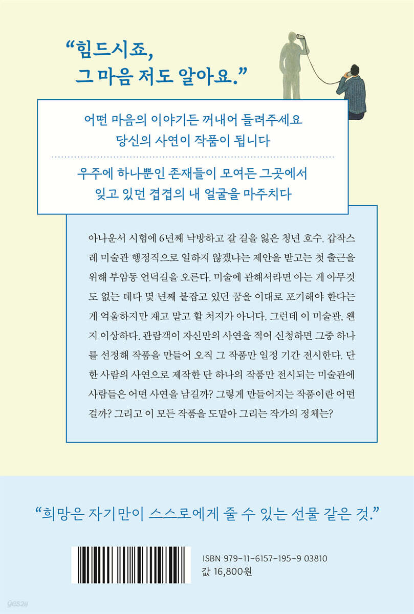 직원으로 보이는 한 여자가 호수를 알아보고는 다가오며 물었다. “네, 맞습니다.” 삽시간에 긴장한 호수가 꾸벅 고개를 숙였다. “오늘 첫 출근이시죠. 반갑습니다. 저는 학예연구원 손다미라고 해요.” 여자가 손에 든 명함을 내밀며 인사를 건넸다. 갸름한 얼굴에 큰 눈망울, 야무져 보이는 입매, 긴 머리를 뒤로 한데 묶은, 언뜻 봐도 다부진 인상의 여자였다. 여자를 따라 인사를 하고 나서 호수는 왠지 기운이 쇠하는 것 같았다. 그동안 아나운서라는 하나의 길만을 좇다 이제 원치 않는 일을 해야 한다는 게 이런 기분인 듯싶었고, 어쩐지 난파된 뒤 길을 잃어버린 배 위에 올라탄 막막한 심정이었다. --- pp.10-11 ‘할 수만 있다면 내가 잃어버린 젊음을 그림으로 보고 싶소. 그런 게 가능할지 모르겠지만, 매일매일 봐야 하는 이 지긋지긋하게 늙고 주름진 얼굴이 아니라, 다른 사람들이 가진 생기와 젊음이 내게도 있는지 보고 싶소. 다 늙은 고약한 영감이 된 거울 속 내 모습을 그림으로는 다시 보고 싶지 않으니 그럴 거면 말고요. 다만 내가 가진 생기와 젊음을 그려줄 수 있다면, 보여줄 수 있다면 그려주시오. 제발 보여주시오! 사연 신청자, 김춘호’ --- pp.39-40 길을 걸으며 호수는 전선들 사이로 멀찌감치 내려다보이는 차도를 바라봤다. 자신이 있어야 할 곳이 저 도심 한가운데의 빌딩 숲속이어야 한다는 생각은 언제나 호수의 머릿속에 클립처럼 꽂혀 저장되어 있었다. 오전이면 커피를 테이크아웃 하기 위해 매장 앞에서 줄을 서고, 점심을 먹기 위해 빌딩 밖으로 쏟아져 나온 인파를 헤치고 식당을 찾아다니며, 일에 치여 정신없는 하루를 보낸 후 저녁이면 퇴근한 사람들로 인해 비어버리다시피 한 빌딩 숲 사이의 공허를 호수는 동경하는 것이었다. 호수가 입사하고 싶었던 방송사들이 하나같이 그런 지역에 있기도 한 탓이었다. 그런 지역에 비해 부암동은 지나치게 한적한 동네였다. --- pp.56-57 그런 그를 토닥여주는 건 가끔 마주치는 청소부 할머니였다. 건물 내외부를 청소하는 일이 만만치 않아 다른 데 신경 쓸 여유가 없을 텐데도 항상 호수를 만나면 “호수 청년, 호수 청년” 하며 나긋한 미소를 지어주고는 했다. 오 실장은 호수에게 종종 핀잔 비슷한 말투로 왜 그렇게 피곤해 보이냐고 하거나 안색이 좋지 않은 것 같다고 했지만, 할머니는 달랐다. “전보다 표정이 밝아졌네.” 대개 첫마디부터 늘 기분이 좋아지는 말을 건네는 사람이었다. “그래요, 할머니?” 호수가 반색하며 되묻자 할머니가 입을 손으로 가리고 소리 죽여 말했다. “나 같은 노인도 여기 취직하자마자 진작 그만두고 싶었는데 그게 벌써 이 년이 넘었어. 잘 버텨봐, 호수 청년.” --- p.83 ‘선해주 님의 사연에서 문득 아버지에 대한 그리움이 깊이 느껴졌어요. 그립고 보고 싶은 대상이 이 세상에 존재한다는 게 전 몹시 부러웠답니다. 개인적인 이야기이지만 저의 부모님은 이 세상에 존재하지 않으시거든요. 지금 만나지 못한다고 해도 언제든 만날 수 있다 생각하면 기분이 좀 나아지지 않던가요. 돌아가신 부모님을 어떻게 해서도 만날 수 없다는 생각에 저는 종종 허무해지거든요. 갖고 있는 사진 하나 없다는 해주 님의 아버지를 어떻게 그려야 할지 꽤 오래 고민하고 망설였습니다. 그것을 해결할 수 있는 길은 단 하나이더군요. 해주 님의 사연에 제가 최선을 다해 만들어낼 수 있는 작품은 오로지 한 가지 형식밖에는 없었습니다. 만남, 그 자체 말입니다.’ --- pp.93-94 ‘그래서 말인데 아무 문신도 그려지지 않은 저를 한번 그려줄 수 있을까요? 지금 이 상태의 문신을 모두 지우는 건 도무지 불가능하거든요. 하지만 어떻게 해서든 상징적으로나마 내게 남은 흔적을 지우고 싶습니다. 그 모습을 거울삼아 다시 시작하고 싶은 마음입니다. 어쩌면 제 문신을 보고 작가 양반도 기겁할 수도 있겠네요. 이런 건달의 사연도 들어줄지는 모르겠지만 부탁해봅니다.’ --- p.133 ‘새소리, 수업 시간이 끝났다는 종소리, 알람음, 그리고 제가 제일 좋아하는 악보 속의 멜로디. 그것들을 모두 제 목소리로 표현한다는 게 어린 나이에도 너무 신나고 좋았어요. 언제나 노래 실력을 뽐내는 아이였어요. 그때부터 꿈을 키워 뮤지컬 배우가 되었고 수년 만에 마침내 주연 역할을 맡았죠. 하지만 거기까지였어요. 성대결절이 저를 꿈의 바로 문턱에서 좌절시켰거든요. 인생에서 가장 소중한 것을 잃었을 때의 느낌을 아세요? 궤도를 잃고 우주를 떠도는 사람이 된 기분이에요. 지금은 제 안에서 나오는 소리가 너무 무서워요. 한 번도 들어보지 못한 거친 소리를 낼까 두렵고요. 분명히 머리는 어떤 음을 노래해야 할지 알고 있는데, 정작 소리를 낼 수 없는 답답함을 누가 이해할 수 있을까요. 그 일 때문에, 그것 때문에 저는 그토록 사랑하는 무대에서 내려와야만 했습니다. 제가 꿈꿨던 주연 역할이 다른 사람에게로 가는 걸 바라보며 제 마음은 무너졌고요. 그 이후로 전 어떤 소리도 싫어졌어요.’ --- pp.174-175 “미술관 오셨어요?” 덩치가 크고 부리부리한 눈매에 수염이 턱 주위로 까슬까슬하게 뻗친 한 남자가 미술관 입구에서 물었다. 가만 