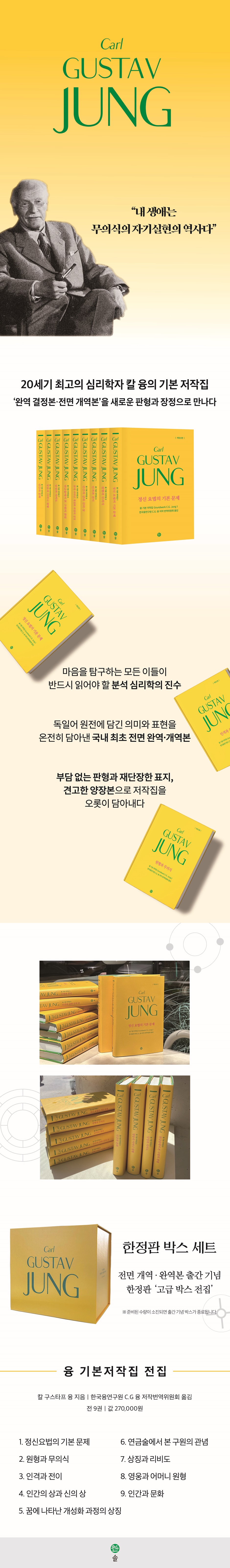 마음을 탐구하는 모든 이들이 반드시 읽어야 할 분석심리학의 진수 어느 심리학설보다 깊고 넓고 희망적인 ‘인간심성론’을 제시한 책 특정 독자층에 국한되지 않고 융 사상의 심원한 세계로 인도하는 인문서 20세기 최고의 심리학자로 손꼽히는 융은 인간 무의식의 깊이를 탐구하며, 인문학적 사유의 새로운 지평을 열었다. 그는 개인의 내면세계와 집단 무의식, 상징, 꿈의 실용적 의미를 분석함으로써 인간 본성에 대한 심오한 통찰을 제시한다. 이 책은 융의 핵심 이론을 체계적으로 정리하여 관련 전공자뿐만 아니라 자기 이해와 성장을 추구하는 모든 독자에게 깊은 영감을 선사할 것이다. 『융 기본 저작집』은 새로운 인간 이해, 새로운 삶의 태도를 갈망하는 많은 사람의 갈증을 덜어주고 인간 문화와 심리를 심층적으로 다뤄 삶을 새로운 각도에서 풍요롭게 해주는 융의 핵심 언어를 담았다. 각 권은 모두 독특한 주제를 심도 있게 다루며 끊임없이 자기실현을 지향하도록 안내하고 있다. 각 권 소개 1권 정신 요법의 기본 문제 정신 치료에 있어 실제적으로 가장 탁월한 성과를 거둔 융 사상의 전모를 소개한 책. 정신치료에 관한 융의 기본 입장, 꿈의 실용적 의미와 그 해석상의 접근법, 정신분열증 등 주로 분석심리학의 임상 실제에 관계되는 12편의 글이 실려 있다. 이 외에도 콤플렉스와 심리학적 유형에 관한 융의 초기 학설들도 함께 실려 있어, 이를 통해 융 심리학을 폭넓게 접해볼 수 있다. 2권 원형과 무의식 무의식에 관한 기본학설과 특히 원형상에 관한 논문을 모은 것으로 융 학설의 핵심이 모두 들어 있다. 정신의 본체에 관한 융의 가장 핵심적이고 총체적인 이론을 위시해 집단적 무의식론과 원형론이 모성 원형, 어린이 원형, 아니마 개념과의 관련 속에 자세히 소개되어 있다. 3권 인격과 전이 3권은 인간 의식과 무의식에 대한 융의 기본 학설 중 매우 중요한 두 개의 논문이 포함되어 있다. 첫 논문인 '자아와 무의식의 관계'는 융의 인간 심성에 관한 핵심적인 견해가 농축된 형태로 들어 있어, 분석심리학에 입문하고자 하는 사람들에게 제일 먼저 꼭 읽어야 할 문헌으로 권해지고 있다. 두 번째 논문 '전이의 심리학'은 임상에서 자주 부딪히는 문제인 분석가와 피분석자 사이에서 일어나는 특이한 감정 교류의 무의식적 원형적 측면을 연금술 경전에 나타난 대극 합일의 상징적 과정을 통하여 살펴나가고 있다. 4권 인간의 상과 신의 상 제목 그대로 ‘신’과 ‘인간’, 즉 종교 문제에 천착한 융의 저술 세 편이 실려 있다. 그는 인간의 무의식적 과정에서 나타나는 종교적 상징성들을 밝히고, 가톨릭 미사를 통해 특수한 종교제의의 배경을 이루는 보편적, 정신적 토대를 살피고 있다. 5권 꿈에 나타난 개성화 과정의 상징 5권은 융 사상의 핵심 이론은 ‘개성화’ 혹은 ‘자기실현’을 다루고 있다. 개성화의 과정은 의도적, 이론적으로 만들어낸 것이 아니라 인간 무의식에 상징으로 존재하고 의식에 작용하고 있다는 사실을 경험 자료를 통하여 실증한 책이다. 6권 연금술에서 본 구원의 관념 5권에 이어 「심리학과 연금술」의 후반부를 실었다. 연금술의 기본 개념, 작업 과정, 기독교와의 유비, 무엇보다 연금술 상징의 심리적 의미에 관해 연금술과 종교사상사에 관한 방대한 문헌을 동원하여 면밀히 탐구하고 있다. 7권 상징과 리비도 책은 융의 동료이자 친우인 테오도르 플루르누아가 보고한 한 젊은 미국 여성의 수기를 분석한 것으로, 이 수기에는 그녀가 정신분열병을 앓기 직전 유럽 여행 중 기록한 시와 환상, 이에 관한 자가 논평 등이 들어 있다. 융은 이 자료를 정신분열증 전구단계의 병리, 개인 생활사의 정신적 상처를 중심으로 한 재래의 증례분석 방식을 취하지 않고 그 환상들이 개인적인 차원을 넘어서 인류 정신사의 보편적 토대, 즉 집단적 무의식의 원형상들과 어떻게 관계되었는지를 집중적으로 살펴 들어간다. 이를 위해 시, 문학, 신화, 전설, 고대 종교사, 심지어 어원학에 이르기까지 방대한 자료를 동원하고 있다. 8권 영웅과 어머니 원형 7권에 이어 「변환의 상징」의 후반부를 실었다. 리비도의 개념과 변환을 다룬 7권에 이어, 수많은 상징, 신화와 종교, 문학 등 다양한 사례를 동원하여 영웅의 기원과 그 숙명, 어머니 원형의 여러 가지 측면을 조명했다. 부록으로 프랭크 밀러의 체험 기록을 수록했다. 9권 인간과 문화 융 기본 저작집의 마지막 권인 제 9권의 완역판으로, C.G. 융이 저술한 열다섯 개의 논문을 수록했다. 인격의 성정과 여성문제, 결혼, 생의 전환기와 죽음에 관한 융의 깊은 통찰에서 시작하여 양심과 선약의 문제에 관한 분석심리학의 입장을 정점으로 논문 등을 배열했고 동양적 사유에 관한 심리학적 고찰 등을 실었다. 후반부는 연금술에 관한 논문인 파라켈수스론과 프로이트에 관한 솔직한 비평이 실려 있다. |
