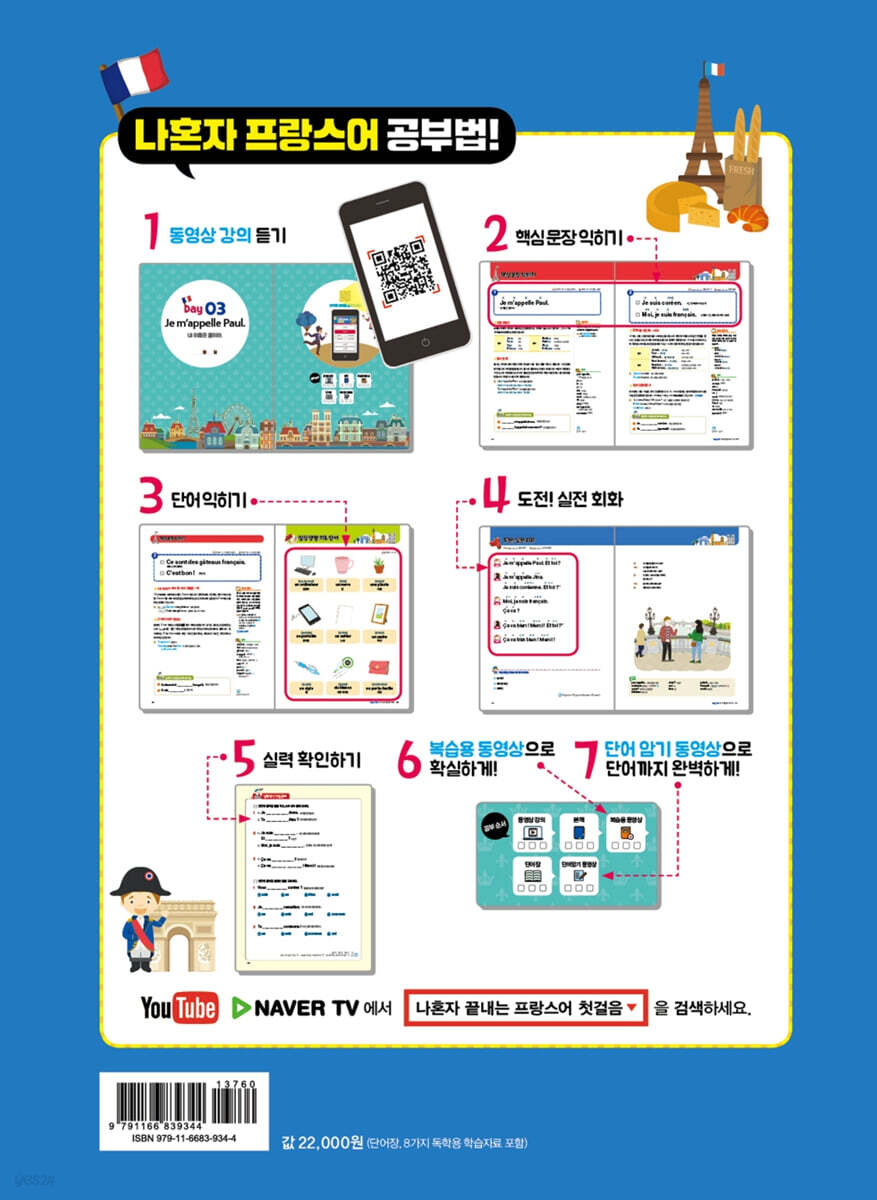 『나혼자 끝내는 독학 프랑스어 첫걸음』의 특징 1. 왕초보 독학 학습자를 위한 맞춤형 구성! 20일 만에 프랑스어 기초 과정을 완성할 수 있도록 쉽고 알차게 구성했습니다. 프랑스어에 한층 흥미가 생기도록 프랑스 문화의 재미있는 모습도 함께 살펴볼 수 있습니다. 책 속의 학습 플래너를 활용해 보세요! 2. 풍부한 독학용 학습자료로 발음부터 단어까지! 본책과 함께 부록으로 도우미 단어장, 왕초보 그림 단어장이 포함되어 있습니다. 또한 발음 특훈 동영상, 복습용 동영상, 단어 암기 동영상 등 다양한 학습자료를 제공하고 있어 발음을 익히고 단어를 암기할 수 있습니다. 3. 온라인 무료 학습자료 제공! 스마트폰, 넥서스 홈페이지, 유튜브, 네이버 TV 등에서 원어민 MP3 및 저자 직강 동영상 강의 등을 무료로 제공합니다. (www.nexusbook.com) |