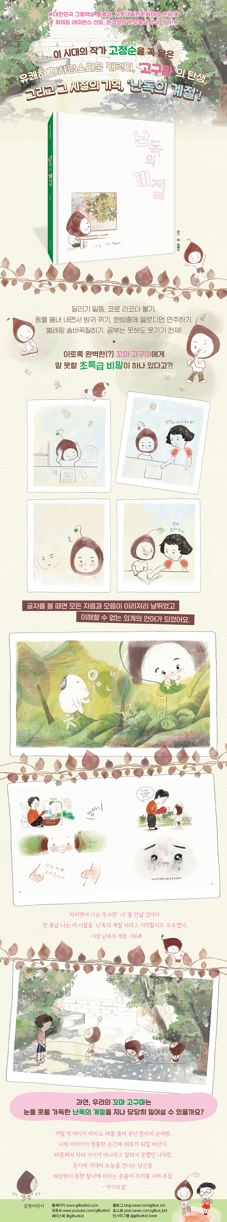 난독증을 딛고 당차게 세상과 맞선 꼬마 고구마의 좌충우돌 성장기! 달빛 자장가가 내리는 어느 봄밤에 바깥세상이 궁금해 태어나고 만 아이, 고구마! 동물 흉내 내면서 방귀 뀌기, 한밤중에 멜로디언 연주하기, 벌레랑 숨바꼭질하기 등 희한한 것을 척척 해내는 고구마에게도 못하는 게 하나 있었어요. 바로 글을 읽지 못한다는 것이었어요. 내가 글을 읽지 못한다는 사실을 아는 사람은 아무도 없었다. 나는 그냥 공부 못하는 아이였고 받아쓰기 시험 때마다 배가 아픈 아이였다. ―1장 둠칫둠칫, 25쪽 고구마가 글자를 읽으려고 할 때면 머릿속에는 어느새 이상한 괴물들이 나타났고, 모여 있는 글자들을 흩트려 놓거나 글자 위를 콩콩 뛰어다니며 방해했어요. 그래서 시험을 볼 때면 꾀병을 부리고, 짝꿍이 쓴 글을 몰래 따라 그리는 잔꾀를 부려야 했지요. 하지만 꼬마 고구마는 좌절하기 보다는 씩씩하게 모든 순간을 이겨 냈어요. 동생이 읽어 준 알림장의 ‘기타 등등’이라는 말을 이해하지 못해, 학교에 장난감 기타를 메고 간 부끄러운 순간에도 우는 대신 당당했고, 엄마가 바자회에서 사 온 친구 옷을 거꾸로 뒤집어 입고 기어이(!) 등교하고 마는 넉살 좋고, 유쾌한 아이였어요. 이런 고구마의 감추고 싶은 비밀을 알게 된 사람은 언니와 친구 상숙이였어요. 언니는 집에서, 상숙이는 학교에서 고구마에게 글을 읽고 쓰는 법을 알려 주지만 아무리 애써도 소용이 없었지요. 받아쓰기 시험에서는 언제나 빵점이고, 밥 먹듯 나머지 공부를 해야 했지만, 고구마는 슬프지 않았어요. 달리기 전교 일등에, 친구를 위해 대신 벌레를 잡아 주고, 엉뚱한 행동으로 친구들을 웃기는 등 개구쟁이 고구마다운 일상을 보냈으니까요. 상숙이는 단 한 번도 화를 내지 않았고 나는 여전히 밝게 웃었다. 받아쓰기만큼이나 상숙이를 웃기는 일도 중요했기 때문이다. ―3장 여름 끝에서, 우리는, 75쪽 그러던 어느 날, 엄마 손을 꼭 잡고 동네를 걷고 있던 고구마의 눈에 그토록 간절히 바랐던 글자들이 첫눈과 함께 온전한 모양으로 들어오기 시작했어요. 아직 첫눈이 오지 않았던 초겨울 어느 날. “…행” “복” “!” 첫눈이 내리고 나는 글자들과 눈을 맞췄다. ―5장 난독의 계절, 100~103쪽 길고 길었던 고구마의 ‘난독의 계절’이 잊지 못할 추억으로 남는 순간입니다. 난독증으로 수많은 좌절과 실패를 겪으면서도, 자신을 잃지 않고 씩씩하게 성장하는 꼬마 고구마의 눈물겨운 분투기를 담은 그림책 《난독의 계절》입니다. “우리라는 이름이 있어 가능한 찰나였다.” 곁을 지켜 주는 가족과 친구가 있기에 충분했던, 꼬마 고구마의 세계 글을 모르는 고구마가 힘든 순간들을 이겨 낼 수 있었던 데는 가족과 친구, 그리고 이웃의 따뜻한 관심과 힘찬 응원이 있었습니다. 아무리 책을 노려봐도 머릿속으로 들어오지 않는 글자들 때문에 얼굴이 새빨개질 정도의 부끄러움을 느껴야 했던 고구마는 아무에게도 자신의 비밀을 털어놓지 않아요. 하지만 갑자기 나타난 언니에게 제일 처음 비밀을 들켜 버리고 말죠. 예쁜 언니를 질투하고, 언니를 ‘언니’라고 부르지도 않던 고구마에게 언니는 글 읽는 법을 차근차근 가르쳐 줍니다. 또 고구마가 친구들 사이에서 소외당하지 않도록, 한여름에 땀을 뻘뻘 흘리면서도 동생이 고무줄놀이 연습을 끝마칠 때까지 고무줄을 잡아 주지요. 단짝 친구 상숙이도 고구마의 비밀을 알게 돼요. 상숙이는 친구의 장점을 보는 다정한 아이로, 다른 아이들처럼 고구마네가 오락실을 한다고 놀리거나 글을 모른다고 무시하지 않았어요. 상숙이에게 고구마는 그저 용감하고 재미있는 친구였지요. 상숙이는 고구마에게 소원이 있을 때 하늘에 기도하는 법을 가르쳐 주고, 학교에 홀로 남아 나머지 공부를 하는 고구마가 외롭지 않도록 곁을 지키며 말동무를 해 주는 친구였어요. 동네 미용실 미미 아줌마는 고구마가 가장 좋아하는 사람이에요. 예쁘고 친절한 미미 아줌마는 고구마의 비밀을 알지 못했지만, 선머슴 같은 고구마에게 예쁘다고 말해 주며 글을 몰라 자존감이 한껏 낮아진 고구마가 자신을 아끼고 사랑할 수 있게 만들어 줍니다. 더는 받아쓰기 빵점을 맞고 밥 먹듯 나머지 공부를 해도 나는 슬프지 않았다. 엄마도 아빠도 언니도 친구도 조용히 날 기다려 주었다. 대신 전교에서 가장 빨리 달리는 아이, 친구 대신 벌레를 잡아 주는 아이, 웃기는 아이, 밥 많이 먹는 아이였다. ―5장 난독의 계절, 93쪽 고구마는 아무 말 없이 자신을 지켜봐 주고 조건 없는 사랑을 주는 가족과 친구들 덕분에 밝게 자라납니다. 엉뚱하지만 그래서 더욱 사랑스러운, 꼬마 고구마의 빛나는 순간들로 가득한 《난독의 계절》을 만나 보세요! 이 시대의 작가 고정순을 꼭 닮은 유쾌하고 사랑스러운 캐릭터, ‘고구마’의 탄생, 그리고 그 시절의 기억, ‘난독의 계절’! 《난독의 계절》은 난독증으로 초등학교 6학년 때까지 글을 읽지 못했던 고정순 작가의 실제 경험을 담은 그림책입니다. 작가는 꼬마 고구마의 눈물겨운 성장기를 깨알같이 섬세한 그림과 시적인 문장들로 담아냈습니다. 고구마는 생김새도 범상치 않