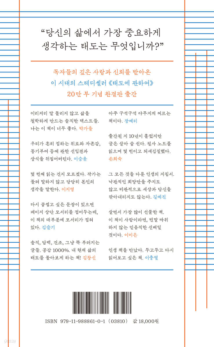 나를 살아가게 하는 다섯 가지 중요한 가치들 소설과 산문, 독립출판물을 비롯해 다수의 책을 내며 삶과 인간관계, 일과 사랑에 관한 다양한 글쓰기를 보여준 작가 임경선. 《태도에 관하여》는 여러 라디오방송과 신문 지면을 통해 15년간 타인의 인생 상담을 해온 작가가, 글과 말을 통해 자신이 전달하고자 했던 인생의 핵심 가치들을 총정리한 산문이다. 작가의 정의에 따르면 《태도에 관하여》에서의 ‘태도(attitude)’는 ‘어떻게’라는 살아가는 방식과 세상을 바라보는 가치관의 문제이자, 그 사람을 가장 그 사람답게 만드는 고유 자산이다. 자발성, 관대함, 정직함, 성실함, 공정함이라는 다섯 가지 태도를 통해 우리가 일상적으로 겪는 삶의 문제들을 통찰하고 접근해나가지만, 일방적인 정답을 제시하기보다 독자들에게 ‘그렇다면 당신이 중요하게 여기는 삶의 태도는 무엇인가’라는 질문을 던져 독자 스스로가 생각을 가다듬도록 돕는다. 일에 관해서는 변명을 허락하고, 사랑에는 철벽을 치거나 가혹해지고, 인간관계는 타인에게 휩쓸리기만 하고, 세상의 법칙에는 짓눌리고야 마는 현대인들에게, 작가는 ‘사랑은 관대하게, 일은 성실하게, 인간관계는 누구보다도 자신에게 정직하게, 세상과의 관계는 공정하게’ 하자고 말한다. 또한 ‘노력’을 과소평가하는 작금의 분위기를 우려하면서 ‘지금 이대로 가만히 있어서는 그 어떤 변화도 이룰 수가 없다’고 용기를 가지고 ‘일단 그 상황에 나를 집어넣어보는 일’의 중요성을 차분히 짚어준다. 또한, 어떤 사랑이든 사랑 그 자체가 찾아온 것을 소중히 여기는 마음이, 사랑이 끝나도 새로운 사랑이 도래할 거라는 믿음이, 타인에 대한 관대함을 낳고, 그 관대함이야말로 결국에는 ‘나’를 사랑하고 용서하는 힘의 밑거름이 된다고도 강조한다. 《태도에 관하여》의 다섯 가지 태도는 나를 살아가게도 하지만, 나를 알아가게도 하고, 나를 지켜내게도 한다. ‘태도’는 우리 삶의 방향을 결정짓는 나침반과 같다. 이 책을 통해 많은 독자들이 삶의 중심이 되어주는 자기만의 ‘태도’를 찾고, 어떤 실패 앞에서도 어설픈 위로나 정신 승리를 하지 않는 단단한 사람들이 될 수 있기를 바란다. 밑줄, 필사, 재독, 추천, 소장, 지인에게 선물…… 지난 10년간 독자들이 보여준 한결같은 사랑과 지지! 스테디셀러로 꾸준히 읽히는 이유는 독자들의 열렬한 입소문이 있었기에 가능했다. 독자들의 생생한 독후감을 직접 들어보았다. “이리저리 말 돌리지 않고 삶을 철학하게 만드는 솔직한 텍스트들. 나는 이 책이 너무 좋다.” _박가을(독자) “우리가 흔히 접한 위로와 자존감, 동기부여 등에 관한 선입견과 상식을 뒤집어버린다.” _이승윤(독자) “몇 번째 읽는 건지 모르겠다. 작가는 돌려 말하지 않고 당당히 본인의 생각을 말한다.” _이지영(독자) “아주 구석구석 야무지게 찌르는 책이다.” _장예리(독자) “다시 곱씹고 싶은 문장이 있으면 페이지 상단 모서리를 접어두는데, 이 책의 대부분에 모서리가 접혀 있다.” _김슬기(독자) “솔직, 담백, 건조, 그냥 똑 부러지는 글들. 공감 1000%. 내 현재 삶의 태도를 돌아보게 하는 책!” _김창신(독자) “출간된 지 10년이 흘렀지만 글은 살아 숨 쉰다. 필사 노트를 읽으며 몇 번이고 되새김질했다.” _손희숙(독자) “그 모든 것을 다룬 인생의 지침서. 낙관적인 희망만을 주지도 않고 비관적으로 세상과 당신을 깎아내리지도 않는다.” _길예진(독자) “살면서 가장 많이 선물한 책. 이 책이 사람이라면, 빈말 따위 하지 않는 믿음직한 선배일 것이다.” _이미은(독자) “인생 책을 만났다. 두고두고 다시 읽어보고 싶은 책.” _이충열(독자) |