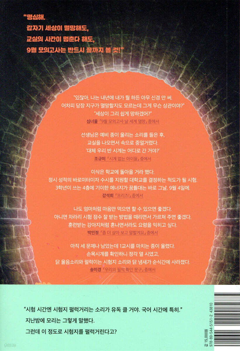 교육부에게 생각지도 못한 문제가 생겼다. 바로 ‘사냥꾼’이 미사일을 발사하는 그 시점이 9월 모의고사가 치러지는 날과 겹친다는 것이었다. ‘사냥꾼’은 오전 아홉 시부터 오후 아홉 시까지 삼십 분에 한 번씩 미사일을 발사할 예정이었다. 물론 미사일 소리가 영어 듣기를 방해한다는 건 아니었다. 하지만 오전 아홉 시부터 오후 한 시까지, 소행성이 수소 폭탄을 맞는 모습은 분명히 관측할 수 있을 것이다. 학생들이 시험에 집중할 수 있을 리가 없었다. --- p.28 “잘 먹어 둬.” 하지현은 어머니를 아무 말 없이 바라보았다. “9월 모의고사가 얼마나 중요한지 알지? 오늘을 수능처럼 생각해. 수능 날 밥도 이거랑 똑같이 해 줄 거야. 너 달걀 좋아하잖아.” 그러자 하지현이 고개를 숙이고는, 달걀말이 한 조각을 먹은 다음 말했다. “수능 안 칠 수도 있잖아.” “그게 무슨 소리니?” “……아니, 오늘 잘 안 되면…… 수능이고 뭐고 없는 거잖아.” “아이고, 또 이상한 소리 한다. 그럴 일 없어. 엄마가 살면서 세상이 망한단 소리 몇 번이나 들었는지 아니? 근데 다 아무 일 없이 지나갔어. 원래 사람들 호들갑이란 게 그런 거야.” 그 호들갑이 이번에는 진짜라면, 난 여기서 끝나잖아. 수능만 준비하다가. --- pp.36-37 “시계가 사라지다니! 시간이 멈춘 거 아니야? 그치, 얘들아? 시간이 멈춘 거지?” 그러자 옆에 앉은 아이가 푹 가라앉은 목소리로 말했다. “난 시간이 건너뛰었으면 좋겠어, 수능 다음 날로.” 아이들은 돌아가며 시시한 농담을 했다. 그렇게라도 긴장감을 쫓아내려는 것 같았다. 민수 역시 같은 마음이었다. 오늘이 9모라니. 고3이 된 지 얼마 안 된 것 같은데 벌써 한 학기가 지나가고 운명의 9모가 눈앞에 닥쳤다. 예전에는 미처 몰랐다. 이렇게 준비가 안 된 채로 9모를 맞이할 줄은. 3월의 뇌에 든 것과 9월의 뇌에 든 것이 이렇게 차이가 없을 줄은. --- pp.51-52 “하늘이는 왜 종점에 가고 싶다고 했을까?” 정연도 궁금하기는 마찬가지였다. 처음 하늘이 그 이야기를 했을 때는 정해진 시간표에서 벗어나 잠시라도 자유 시간을 갖고 싶다는 뜻으로 이해했다. 고3이라면 누구나 품고 있는 일탈에 대한 욕구 정도라고 생각했다. 하지만 하늘이 자퇴하고 나니 다른 의미가 담겨 있는 것 같기도 했다. “종점에 가서 다시 시작하고 싶었나?” --- p.74 이삭과 친해지지 않았던 건 내 무의식의 선택이었는지도 모른다. 자연스럽다고 믿었지만 절대 자연스럽지 않은 일. 원하지만 원해서는 안 되는 일. 하지만, 이상하게도, 낯선 아이들 사이에서 이삭의 얼굴이 가장 먼저 눈에 익었다. 이삭이 천체 관측 동아리 회장이라는 것도, 모의고사를 보면 225점을 받고 수학은 항상 100점이라는 것도, 도서관 장서 신청 기간마다 강령술이니 흑마법이니 하는 수상한 책들을 신청해서 사서 선생님에게 불려 가는 것도, 애쓰지 않았는데도 뇌리에 박혔다. 일부러 찾지 않았으나 하루에 적어도 한 번씩은 이삭에게 시선이 멈추었다. --- pp.87-88 쉽지 않아. 방해가 만만치가 않아. 다 네 말대로야. 4교시 탐구 영역 시험을 보며 이삭의 편지를 곱씹었다. 오류가 있는 문항을 두 개 발견했다. 화학 18번과 생명 과학 19번이었다. 한 문제는 정답이 없었고 한 문제는 모두 정답이었다. 눈을 감고 교실의 분위기를 살폈다. 시험이 끝을 향해 갈수록 내 감각은 극도로 예민해졌다. 다른 아이들의 사소한 반응 하나하나가 눈과 귀에 감지되었다. 명백한 오류를 본 아이들이 여럿일 텐데도 특별한 움직임이 없었다. 그러므로 이건 우리에게만 주어진 오류. 오류를 긍정하고 포용하는 자세로, 두 문항 모두 4번에 마킹했다. --- p.116 일할 때마다 엄마는 하기 싫어, 하기 싫어, 중얼거리면서 결국 다 해낸다. 정말 너무 귀찮다! 하고 소리를 지른 적도 있다. 하지만 엄마의 작업 공간인 식탁에서는 무수한 결과물이 나온다. 그래서 엄마가 번역을 벼락치기 했다고 말할 때마다 박탈감이 느껴진다. 나는 시험을 준비해 본 적이 없다. 대부분의 시험을 출석만 하고 대충 때운다. 숙제를 제대로 수행해 낸 적도 없다. 엄마는 그런 나를 야단친 적이 없다. 다만 이해하지 못할 뿐이다. 그래서 정말로 측은하다는 듯 가만히 바라본다. 아예 다른 종류의 인간을 보는 것처럼. --- p.130 덜컹, 하며 기구가 출발하자 그 애가 뭐라고 중얼거렸다. “뭐라고요?” “〈인디아나 존스』 같다고요.” 비이클이 야외로 달려 나갔다. 천장에 달린 풍선 비행과 실내 어드벤처 전경이 내려다보였다. “참, 이 집안은 유별나게 문학 좋아한다.” 그 애가 말했다. 나는 깜짝 놀라 그 애 쪽을 쳐다봤다. 저런 말을 하는 사람은 세상에 우리 엄마밖에 없는 줄 알았는데. 문득 눈앞이 아찔해지는 것 같았다. 바닥이 너무 까마득하게 멀어 보여서 그랬는지, 그 애가 엄마같이 말해서 그랬는지 헛갈렸다. --- p.147 처음부터 마법사로 태어나서 유치원생 때부터 마법사 과정을 밟아 온 아이들 틈에서 열 살이 넘은 뒤에야 마법 학교에 들어온 나는 모든 게 뒤죽박죽일 수밖에 없었다. 그나마 뒤늦게라도 입학을 할 수 있었던 건 엄마의 어린 시절 단짝이 마법 학교의 교장직을 맡고 있어서였다. 기