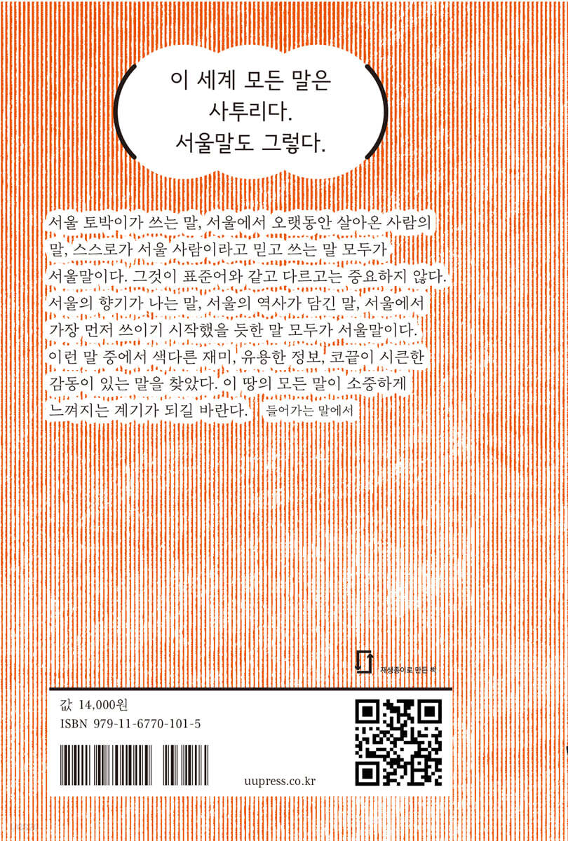 어느 한 지역에서만 쓰는, 표준어가 아닌 말을 사투리라고 합니다. 수도를 중앙으로, 지역을 지방으로 구분해 온 경향 탓에 사투리는 오랫동안 애꿎은 이미지 속에 갇혀 있었지요. 사투리는 촌스러워, 사투리 쓰는 사람은 교양이 좀 없어, 사투리는 공식적인 언어가 아니야, 공공연한 자리에서는 표준어를 써야 해. 하지만 서울을 포함한 모든 지역에는 토박이말이 있습니다. 토박이말은 지역 정서를 고스란히 담고 있고, 지역과 지역민 정체성의 기반을 형성합니다. 각 지역의 역사와 문화가 스며든 말이며, 제각각 다른 팔도 사투리는 우리 언어의 다양성을 보여 주기도 합니다. 그럼에도 오랫동안 글말이 아닌 입말로만 전해진 탓에 시간이 지나며 일부는 소멸되었고, 지역 경계를 쉽게 넘나들지 못해 지역 밖에서는 움츠러드는 말이 되었습니다. 글말이 되기는 점점 더 어려워졌고, 그 가치를 제대로 인정받을 기회 역시 없었지요. 아무리 가치 있는 입말이라도 글말로 남기지 않으면 사라져 버리고 보존되지 못합니다. 이에 책과 영화·드라마·신문 등에서 각 지역별 사투리 문장 100개를 그러모으고, 각 지역에 연고 있는 작가들이 지역과 사투리에 관한 이야기를 붙였습니다. 유유는 다양한 정서를 품은 유서 깊은 말, 오래 기억하고 함께 쓰고 싶은 사투리 표현을 모아 우리 언어문화의 다양성을 살피는 기획으로 ‘사투리의 말들’을 선보입니다. 서울말이라구 다 표준어 아니구여, 서울에두 사투리 있그든여 입말을 크게 표준어와 사투리로 구분하고, 표준어는 곧 서울말이니까 서울 사투리는 없다고 생각하는 사람들이 많지요. 사투리는 시골말, 지방 사람들만 쓰는 말이라고요. 하지만 서울도 토박이가 있는 ‘지역’이고 그들의 말이 표준어로 지정되었을 뿐, 토박이들 사이에서 오랫동안 쓰인 지역 정서와 색깔이 담긴 말이 있습니다. 표준어이면서 동시에 서울 사투리이기도 한 말, 표준어라고 보기는 어렵지만 서울 사람들 사이에서 유독 자주 쓰이는 표현이 있는 것이지요. 그럼에도 일상에서 표준어와 서울말, 서울 사투리를 명확히 가르고 구별해서 쓸 일은 잘 없기에 서울 사투리는 그간 제대로 주목받거나 다뤄질 일이 없었습니다. 다른 지역 방언이 입말로만 전해지며, 기록되지 않아 보존되지 않고 사라지는 것처럼 서울 사투리 역시 그 과정을 거치고 있는 중이지요. 『서울의 말들』은 방언 연구자로 오랫동안 서울·인천·경기 지역 사투리를 수집·연구한 언어학자의 책입니다. 저자는 25년 넘게 서울 골목골목을 누비며 다양한 서울의 말들을 찾아 다녔습니다. 서울 토박이가 쓰는 말, 서울에서 오래 산 사람의 말, 스스로가 서울 사람이라고 믿고 쓰는 말 모두가 서울말이며, 그것이 표준어와 같고 다르고는 중요하지 않다고 말합니다. 그럼에도 그 가운데는 특별히 뜻이 좋은 말, 서울이 향기가 나는 말, 서울의 역사가 담긴 말이 있습니다. 색다른 재미, 유용한 정보, 감동이 있는 말도 있지요. 이런 말들을 추리고 단상을 붙여 『서울의 말들』로 엮었습니다. 토박이 작가들의 작품에서 발굴한 오랜 서울말의 재미 경상도 출신 작가, 전라도 출신 작가의 작품 속에서 경상 지역 방언과 전라 지역 방언을 발견할 수 있듯이, 서울 출신 작가들의 작품에서는 서울 지역 방언을 발견할 수 있습니다. 주로 염상섭·박태원·이태준·한무숙·박완서 등이 서울에서 나고 자라거나 서울에서 활동하며 작품 속에 서울말의 흔적을 남겨 두었지요. 작가뿐 아니라 기자들도 대부분 서울에 적을 두고 서울 이곳저곳을 취재했기에 오래된 신문 기사 속에서도 다양한 서울말을 발견할 수 있습니다. 이런 말 가운데 지금도 서울에서만 주로 쓰이는 표현, 표준어로 등재되어 전국으로 뻗어 나갔지만 서울 내 특정 집단 혹은 장소에서 비롯된 말, 지금은 잘 쓰이지 않지만 되살려 쓸 가치가 있을 만큼 아름답고 정겨운 말을 당시의 맥락을 살려 수록했습니다. 이 책을 언어문화 기록물로도 볼 수 있는 이유이지요. 지금 서울의 모습을 떠올리며 옛 서울 방언의 배경인 종로 거리, 달동네, 청계천 주변을 상상해 보면 어떨까요? 시간이 흐르며 변한 말, 세월의 흐름에도 변하지 않은 말들이 교차되며 서울을 보는 새로운 재미를 느낄 수 있을 겁니다. |