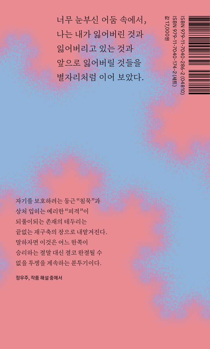 무엇을 운반해서 어디로 보낸단 말이야- 사람 마음에 꼭 있어야 하는 감정이 있고, 그게 흘러 다니는 통로가 있다면, 그건 대체 무엇일까. - 김서해 「손가락이 미끄러지듯이」 동성혼이 합법화된 근미래, 예순일곱의 나이인 ‘나’ 순영은 뉴스를 통해 소식이 끊긴 지 오래인 오빠 희준이 동성 연인과 결혼했다는 것을 알게 된다. 함께 뉴스를 보던 고령의 부모님은 오빠의 소식에 분노와 반감을 드러내고, ‘나’의 딸과 손녀는 그런 노인들에게 반감을 보인다. 그 가운데에 끼인 ‘나’는 오빠를 찾아 집에 데리고 오라는 아버지의 전언과, 왜 이제 와서 삼촌을 괴롭히냐는 딸의 반문 사이에서 혼란을 느낀다. 사실 ‘나’는 “다 그렇게 산다”는 말을 위로 삼아 타인과 달라 이해가 요구되는 부분들을 정상의 둘레에 맞춰 잘라 내며 살아온 인물이다. 그러나 혼란 속에서, 나는 그동안 “우리”라고 여겼던 보편적 동일성의 원을 의심하기에 이른다. 손가락이 미끄러지듯이, 곁을 비껴가는 기억들을 되짚으며. 무언가 “흘러 다니는 통로”로써의 마음으로, 이 세계를 보다 투명하고 유연하게 감각해 보려고. 1차원의 선도 아니지만 2차원 평면이라고 할 수도 없는 그 어느 중간 형태. 내가 사는 세계의 법칙이랑 안 맞는 것 같을 땐, 그냥 0.3차원쯤에서 살고 있다고 생각해. 나를 위한 새로운 차원을 만드는 거야. 나를 설명해 주는. - 박소민 「지옥에 갈 수는 없겠지만 지금은」 이제껏 죽은 사람들의 집을 치우는 일을 해 온 솔은 자신이 유일하게 사랑한 영이 죽기 전 마지막으로 머무른 방을 찾아 “똥밭”이라 불리는 농막으로 향한다. 먹고살기 위해 학교 대신 죽은 사람들의 집으로 등교하는 솔, 이름 대신 사배자로 불리는 해주, 소리를 내지 않으려 숨까지 참으며 살아가던 영, 학교에서 왕따의 위치에 내몰린 수학 선생, 네 사람은 원의 내부이지만 동시에 삼각형의 외부인 영역으로 밀려난다. 소설은 “유클리드 기하학으로는 설명이 안”되는 존재들을 다른 방식으로 설명해 내고자 “프랙털”이라는 기하학적 개념을 일종의 측량법으로 빌려 오며, 도려내진 대상을 다시금 세계에 새겨 넣음으로써 결코 평면으로 단순화될 수 없는 복잡한 곡률의 세계에 가까이 가 닿아 보고자 한다. 감은 눈 속에서 한 번 더 눈을 감으면 블랙홀처럼 새까만 침묵이 몰려와 혼자 남은 내 곁을 지켜 주었다. 너무 눈부신 어둠 속에서, 나는 내가 잃어버린 것과 잃어버리고 있는 것과 앞으로 잃어버릴 것들을 별자리처럼 이어 보았다. - 이선진 「잃기일지」 어린 시절 엄마를 잃고 혼자 남은 ‘나’는 마치 세상에 없는 사람인 듯 침묵의 덫을 놓아 먹고살던 엄마의 방식을 물려받아, 침묵 뒤에 웅크림으로써 스스로를 세상에서 지워 내고자 애쓴다. 그러나 처음 만난 펄로부터 다짜고짜 “너, 너무 시끄러워”라는 말을 건네 들은 ‘나’는 꼭 피격을 당한 양 “그 애 쪽으로 기울어”진다. 이렇게 자기를 보호하려는 둥근 “침묵”과 상처 입히는 예리한 “피격”이 되풀이되는 존재의 테두리는 끝없는 재구축의 장으로 내맡겨진다. 말하자면 이것은 어느 한쪽이 승리하는 결말 대신 결코 완결될 수 없을 투쟁을 계속하는 분투기이다. 패스, 패스, 패스, 전력 질주. 미진은 달렸다. 경기장 끝에서 끝으로. 찌릿찌릿한 느낌이 척추를 타고 꼬리 끝까지 전해져. 누군가 내 양 끝, 그러니까 머리카락과 꼬리를 잡고 바짝 잡아당기는 기분. - 최미래 「돼지 목에 사랑」 미진은 ‘사랑’에 대해 끊임없이 집착한다. 그저 그런 사랑이 아닌 “제대로 된 사랑”을 하고 싶은 미진의 마음은 단순한 소망이라기보다 “살면서 한 번은 꼭 해 봐야만 하는” 목적에 가깝다. 다만 소설에서 이렇듯 미진이 “사랑에 목매는” 사람이 된 이유는 다름 아닌, 길다면 길고 짧다면 짧은 “애매한 길이”의 꼬리가 달린 미진의 몸 자체와 관련한다. 미진은 지금껏 딱히 쓸모는 없으나 그다지 불편하지도 않은 꼬리를 “별 뜻 없이 달고 살”아 왔지만, 어느 순간부터 그 꼬리는 미진을 우습고 만만하며 쉬운 상대로 보이도록 하는 “이상한 거”가 된다. 하지만 미진의 꼬리가 가진 의미가 반전되는 사건이 생기며, 미진은 끝내 그 가치와 쓸모를 알 수 없는 꼬리를 단 몸으로써 세계와 다시금 새롭게 관계 맺는다. 치유 받고 싶었어. 영원히 고장난 채로 사는 게 아니라 회복할 수 있다고. 인간은 회복하는 존재라는 걸 확신하고 싶었어. - 한요나 「심곡」 신학과에서 학생들을 가르치는 중년의 교수 모립과 오피스 로보인 로티는 우연한 계기로 캠퍼스에서 만나 파트너십을 맺는다. 끊임없이 본인의 몸으로부터 벗어나기를 원하는 모립과 누구보다도 끈질기게 모립에 대해 궁금해하는 로티는 “로봇은 로봇의 자리에서, 인간은 인간의 위치에서 살아가면 된다”는 원칙이 무색하게 오히려 서로의 영역 쪽으로 기울어지는 듯 보인다. 이렇게 비인간과 인간, 두 화자에 의해 번갈아 서술되는 이 소설은 “출발점에 놓인 몸이 점차 시간과 기억에 따라 변형되면서 자신이 환경 속에 뿌리내려 있는 존재임을 이해해 나가는 여정”을 그린다. “이것은 어느 한쪽이